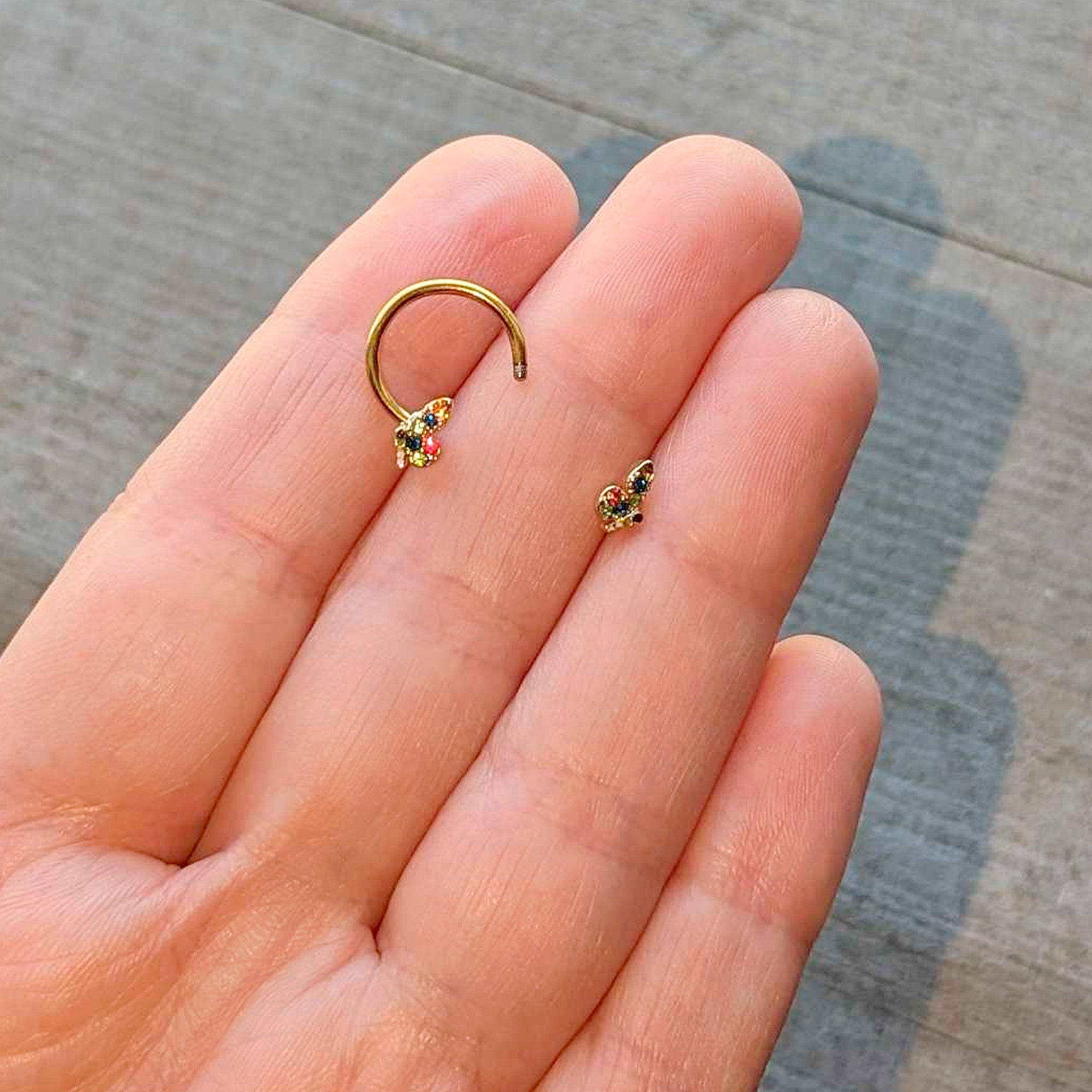 The colorful butterfly on this 16 gauge septum ring is going to steal your heart. It is made with a 10mm gold tone PVD over 316L surgical grade stainless steel circular barbell. Each of the ends features a butterfly charm, embellished with multicolor gems for a truly glam style. The overall look is colorful, unique, and truly eye-catching and you can rock them in multiple piercings including tragus, helix, and some daith piercings. This is some cartilage piercing jewelry that will be in your heart forever.