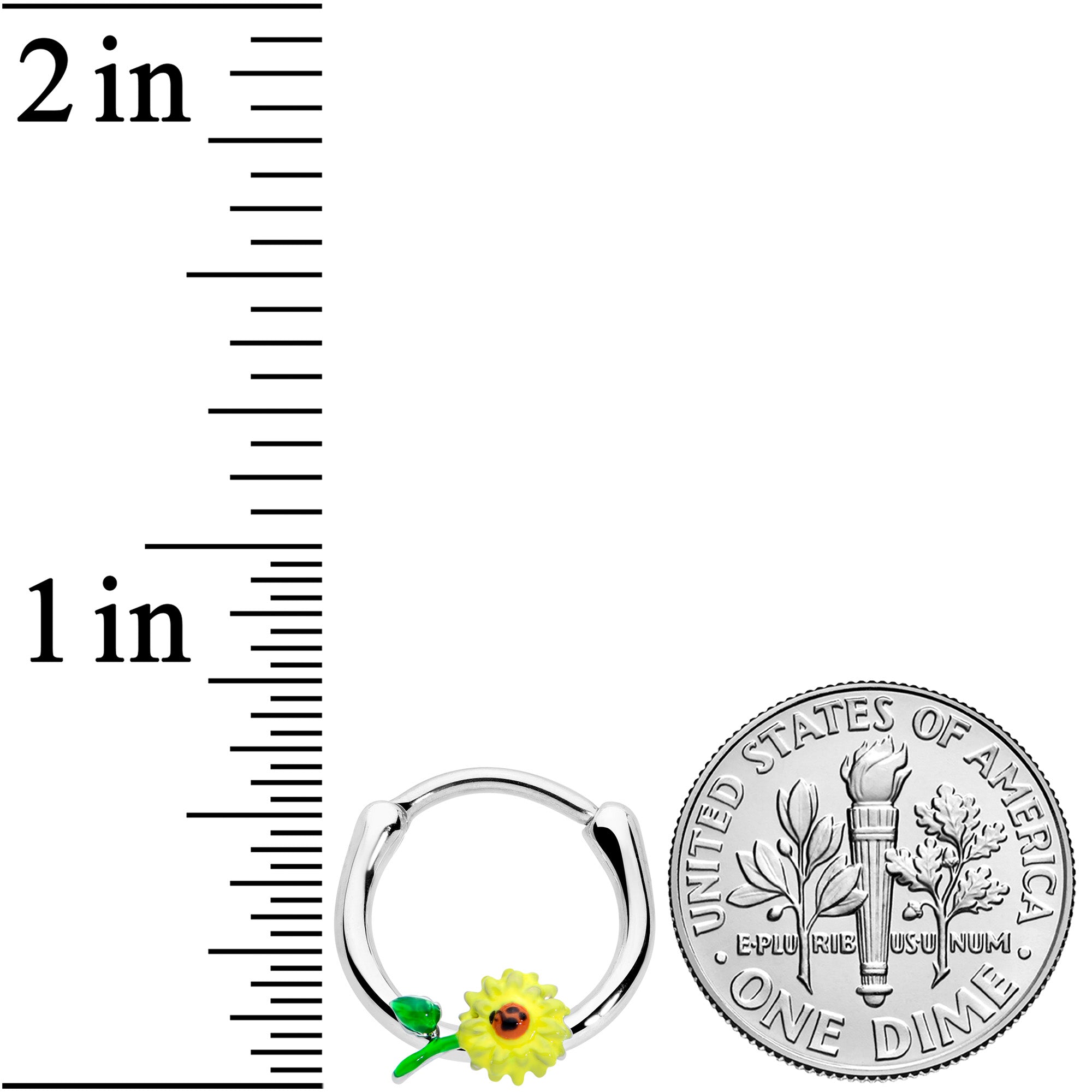Give your look a sunnier feel with this 16 gauge cartilage ring! It's made with a 10mm durable 316L surgical grade stainless steel hinged curved barbell and features a sunflower charm. The sunflower is yellow and has brown detailing at the center and a green leaf embellishment for a look that's colorful, whimsical, and sure to cure a case of the blues! It also features a hinged, clicker design that makes insertion and removal a snap. Plus you can flaunt this flower in multiple piercings including tragus, helix, and septum piercings. Give yourself a sunnier style with this fabulous floral cartilage jewelry!