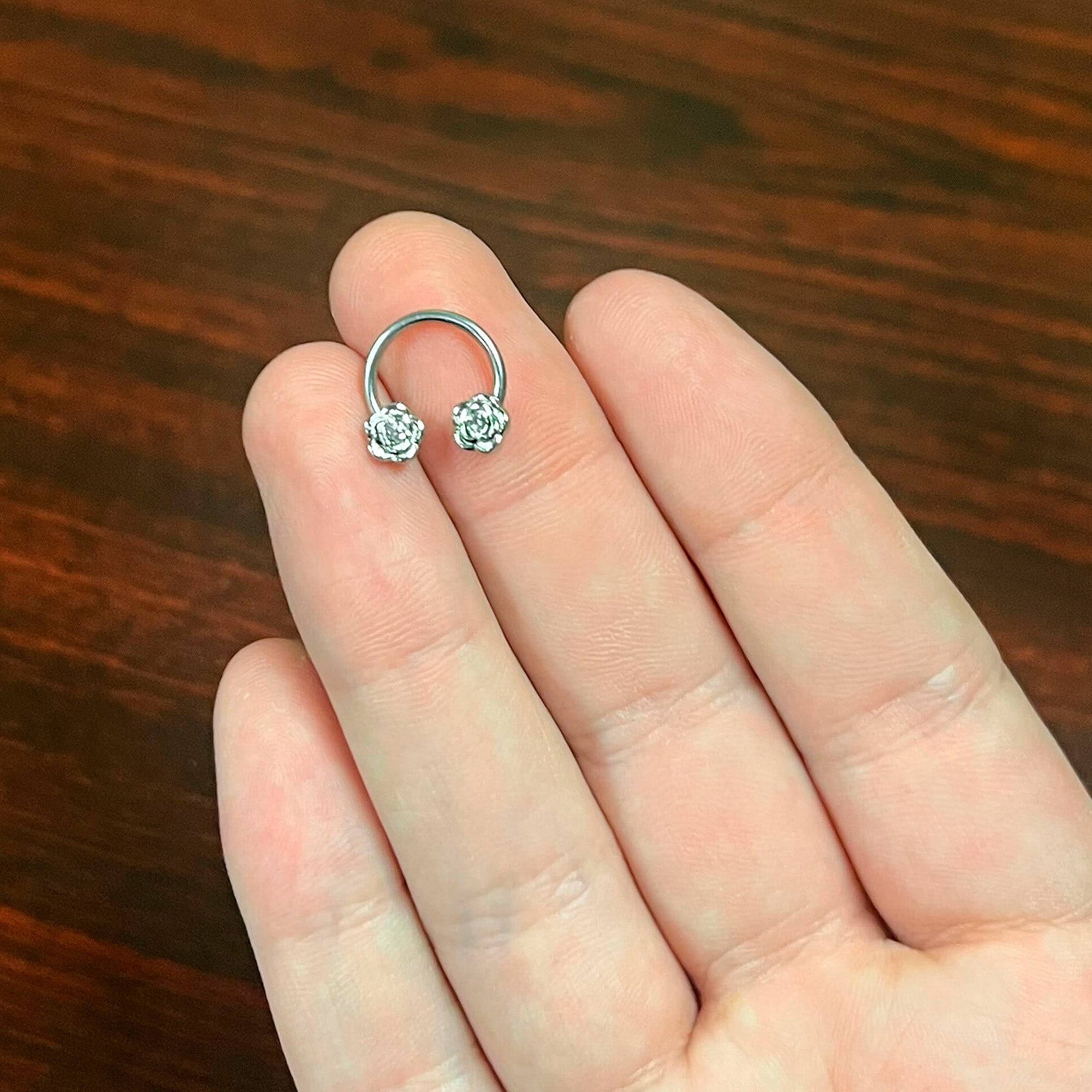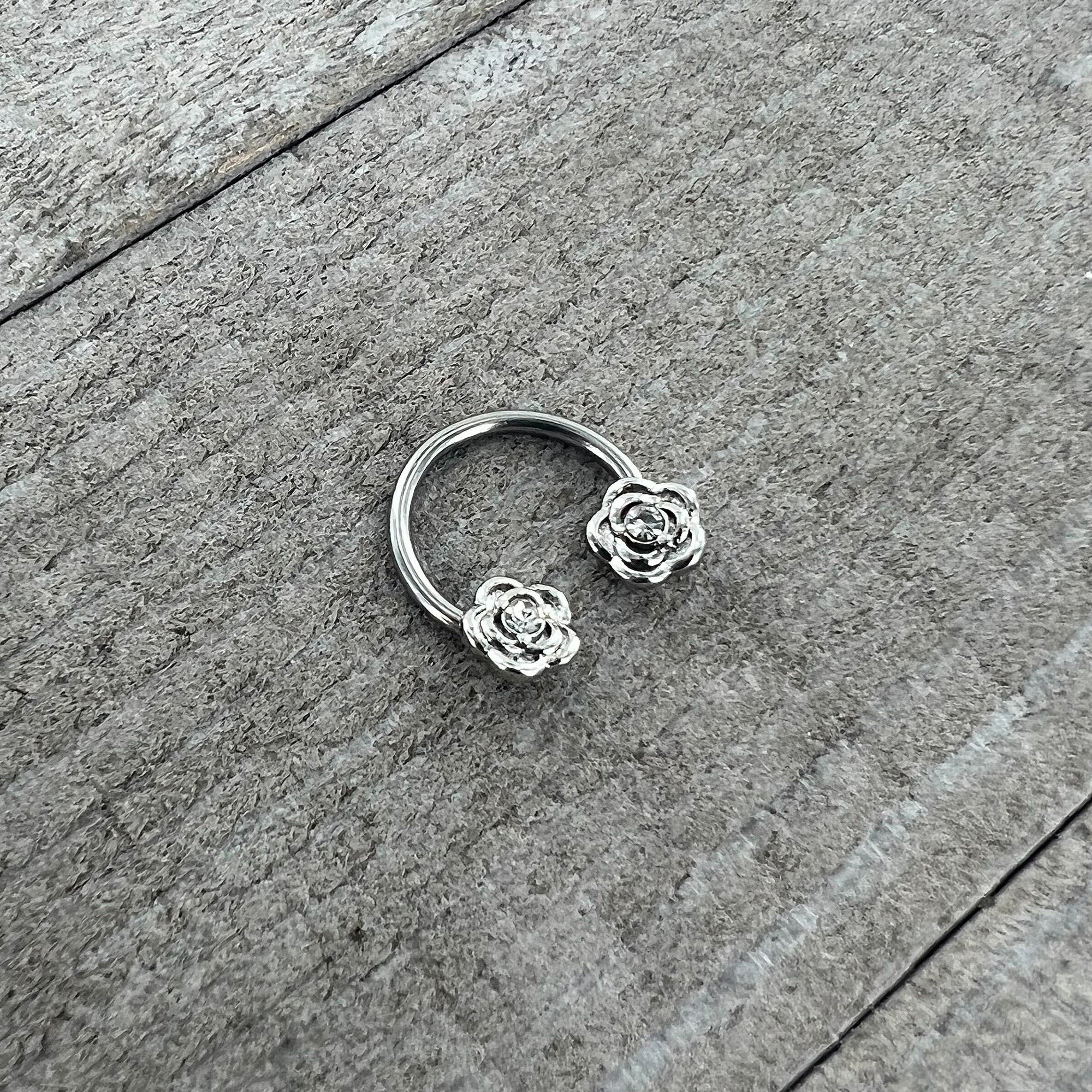 What could feel more like Spring than this 16 gauge septum ring? It's made with a 10mm durable 316L surgical grade stainless steel circular barbell. Each end features a textured flower charm, with multi-dimensional detailing to make them truly catch the eye. You can even rock this ring in multiple piercings including tragus, helix, and some daith piercings. Let your cartilage piercings sport some springtime style with this charming and stylish cartilage piercing ring!
