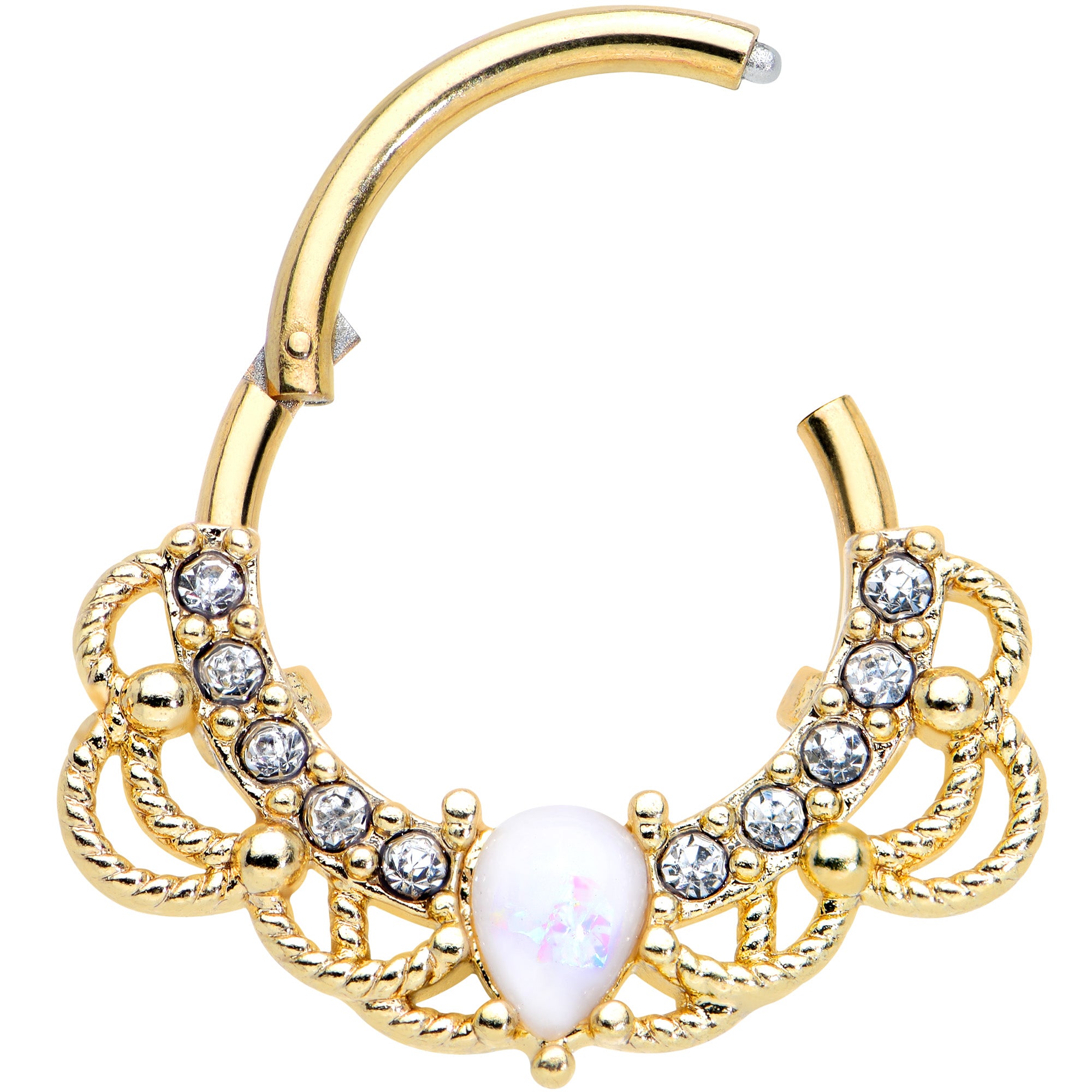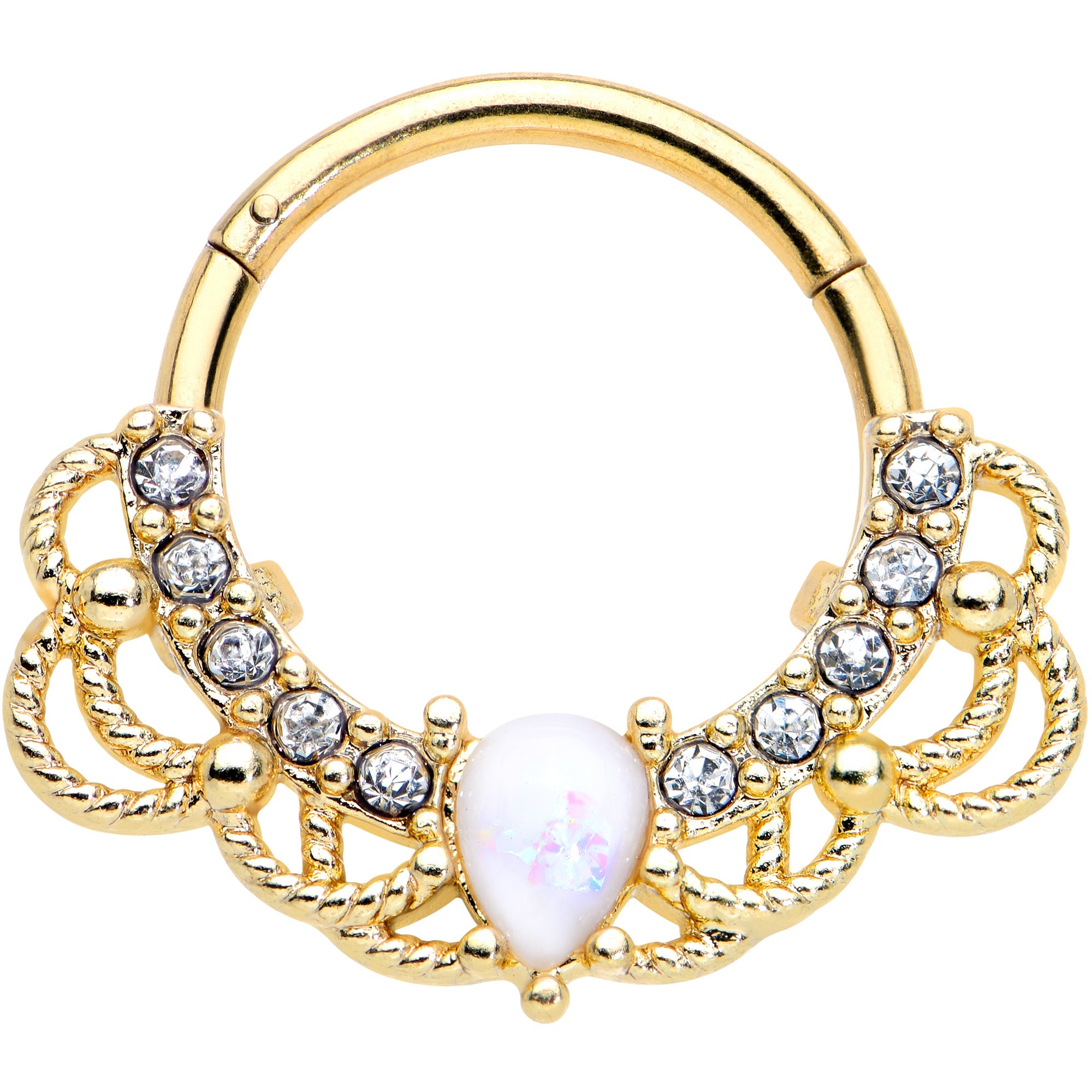 Let a little lace love your cartilage piercings with the lacy loops of this 16 gauge septum ring! It's made with a 10mm gold tone PVD over 316L surgical grade stainless steel hinged circular ring. The bottom of the ring features lacy, swooping detail with textured embellishment and set with clear gems. It's further embellished at the bottom center with a white faux opal for an eye-catching splash of luxury. It also features a hinged, non-removable segment that makes insertion and removal a breeze. And you can rock this jewelry in multiple piercings including tragus, helix, and septum. Let this luxurious lacy jewelry swoop its style around your cartilage piercings with this lovely, lacy tragus ring!