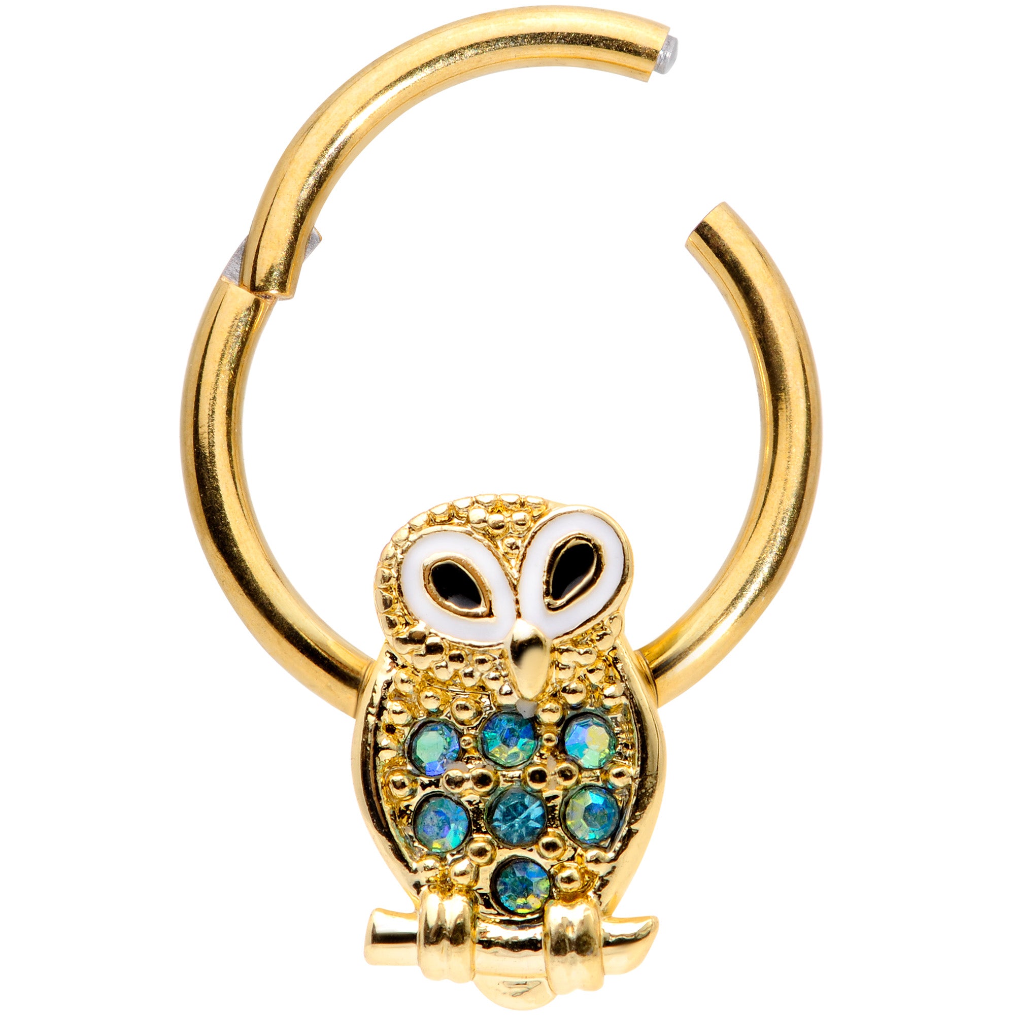 Hooooooo.......could possibly resist this charming little owl? This 16 gauge cartilage earring is made with a 10mm gold tone PVD over 316L surgical grade stainless steel hinged circular ring. It features our sweet little feathered friend, set with aqua blue gems all down its body. This septum ring features a hinged non-removable segment for easy insertion and removal. You'll love this feature because it works in so many piercings including cartilage piercings like the tragus, rook, helix, and daith, and even your septum! Now THAT is something to give a hoot about!