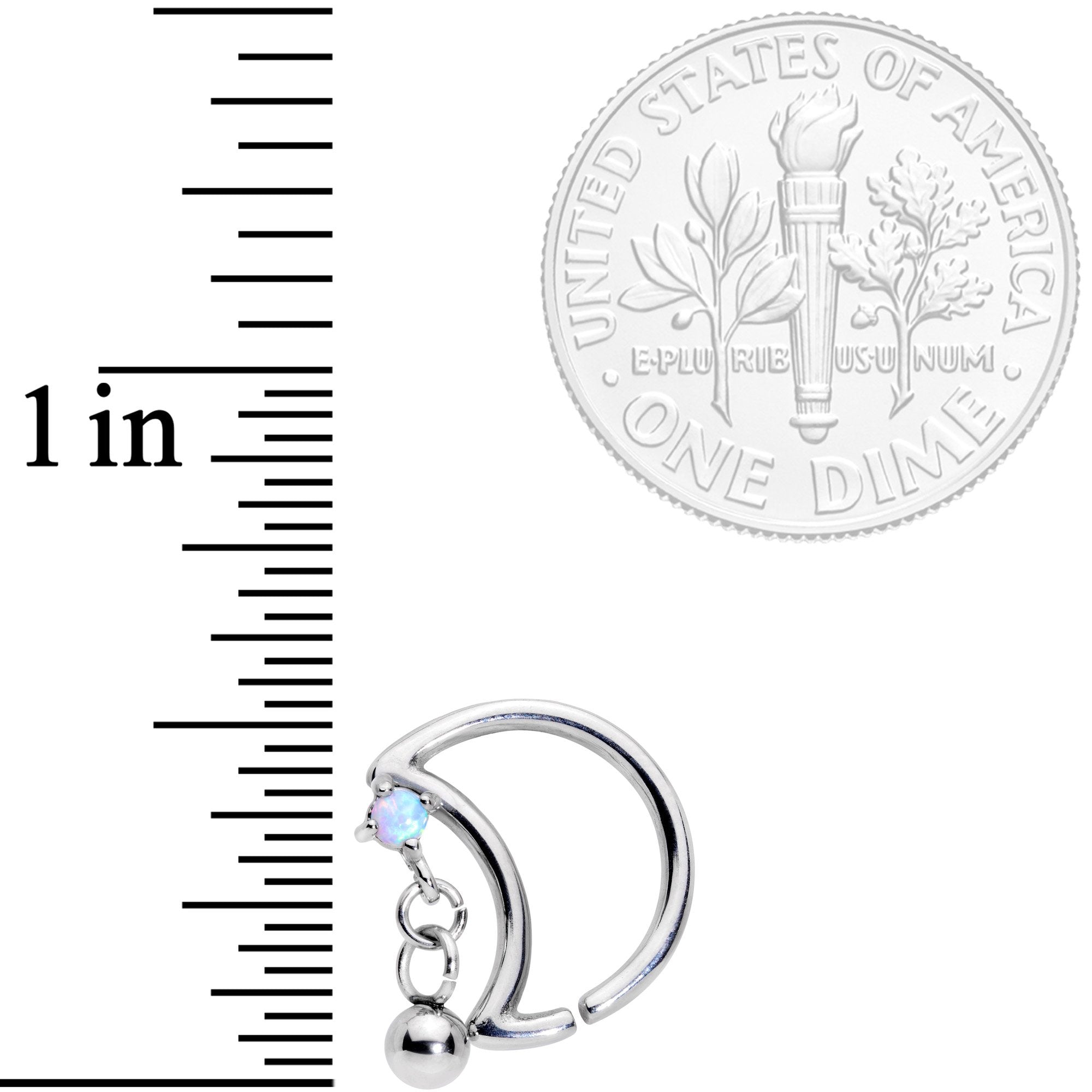 This moon has found something to adorn itself with, and it's way more stylish than just moondust! This 16 gauge cartilage earring is 10mm and made with durable 316L surgical grade stainless steel. It features the silhouette of a crescent moon. At the moon's top point is a white faux opal with a tiny orb dangle that moves as you do. This type of cartilage ring is super easy to insert and remove - simply twist the ring open, insert, and then twist gently shut again. And you'll love that feature because it works so well in multiple piercings including cartilage piercings like the daith, rook, and tragus. This cartilage jewelry is made for a right cartilage piercing.