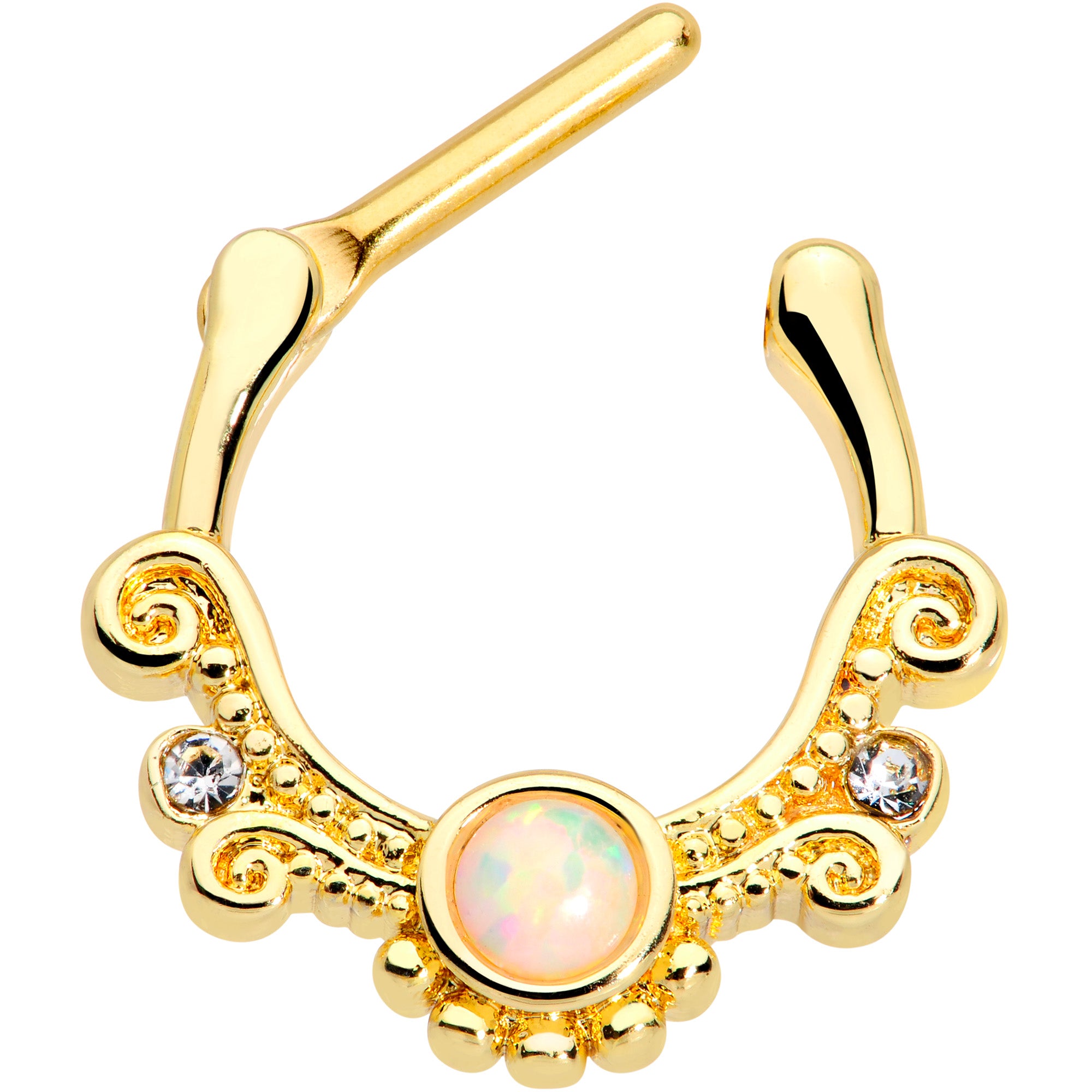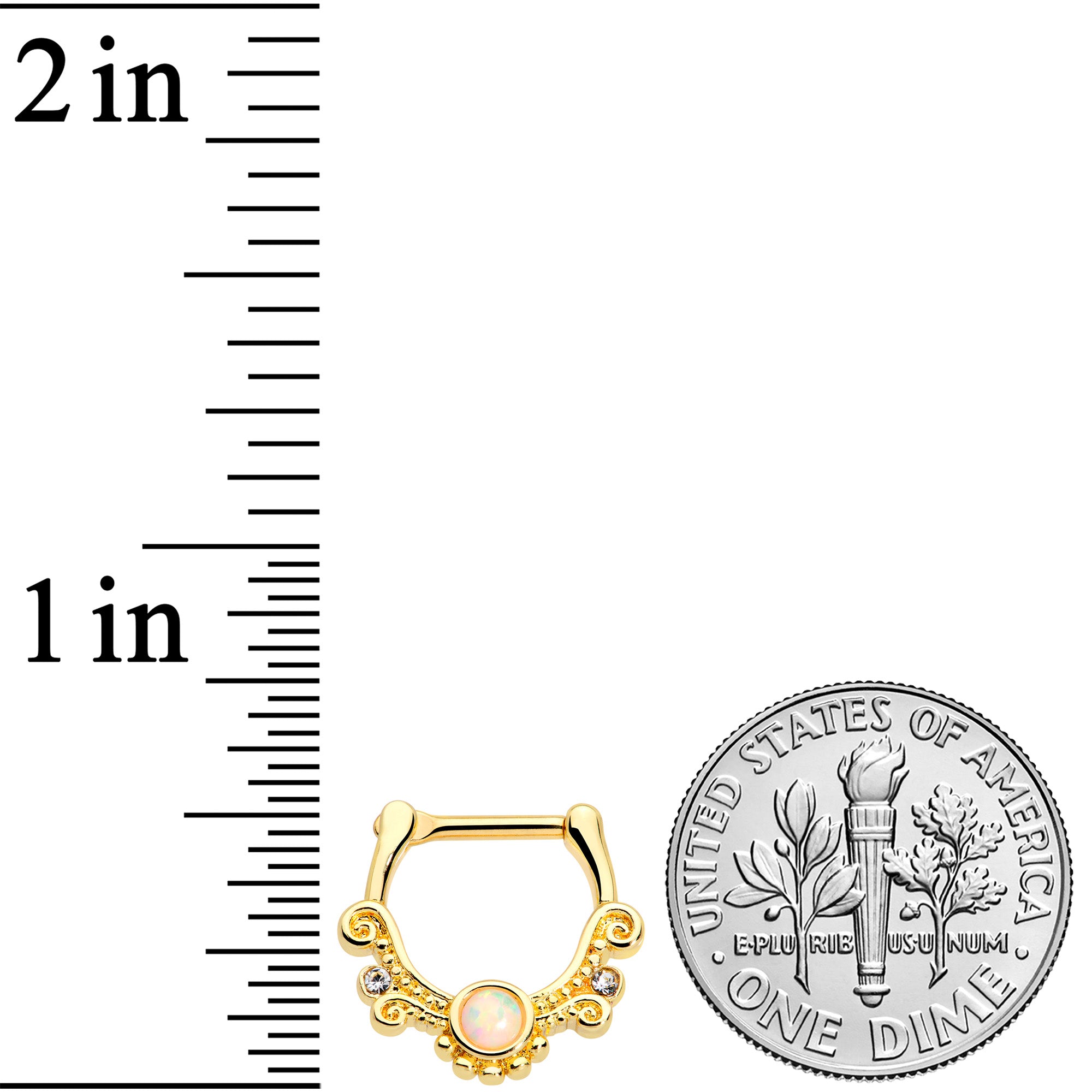 This elegantly scrolling 16 gauge cartilage jewelry will add on-trend opulence to any piercing you place it in! It's made with a 10mm gold tone PVD over 316L surgical grade stainless steel hinged straight barbell. It features a scrollwork composition, embellished with small clear gems and set with a white synthetic opal at the center. The clicker design makes insertion and removal a snap and you can wear it in multiple piercings including your septum as well as cartilage piercings like the helix, tragus, and more! Get the hottest look going in your cartilage piercings with this fabulous filigree cartilage piercing ring!