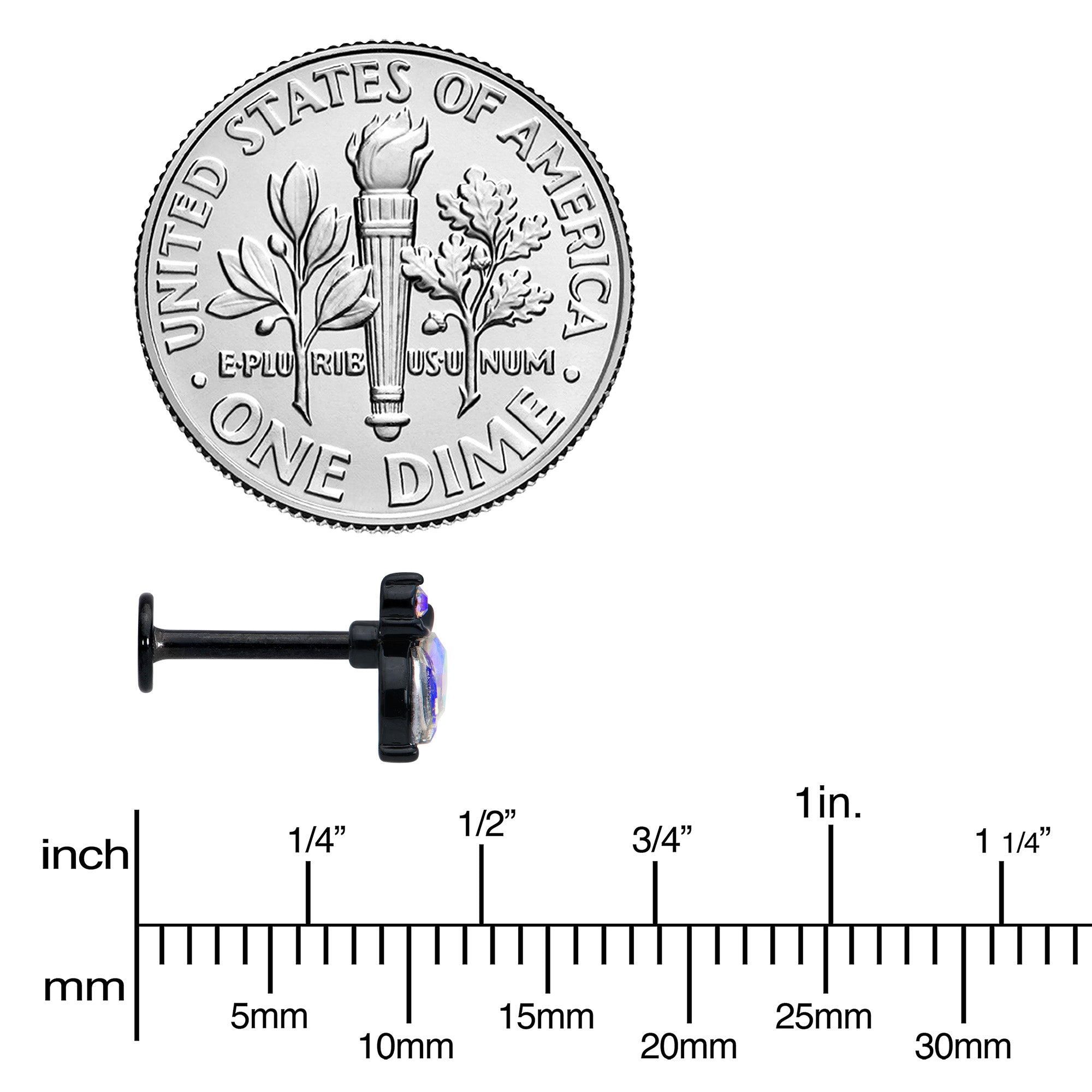 Get a look that wouldn't be out of place in any throne room with this 16 gauge lip ring! It's made with an 8mm black PVD over 316L surgical grade stainless steel straight post with a flat disc end. It features a stylized fleur de lis charm, composed of aurora cubic zirconia gems. The abstracted style adds a modern touch to a timeless symbol - one you can rock in multiple piercings including lip, monroe, tragus, helix, and some conch piercings. Mix antique and modern for a look that's very now with this elegant cartilage piercing ring!