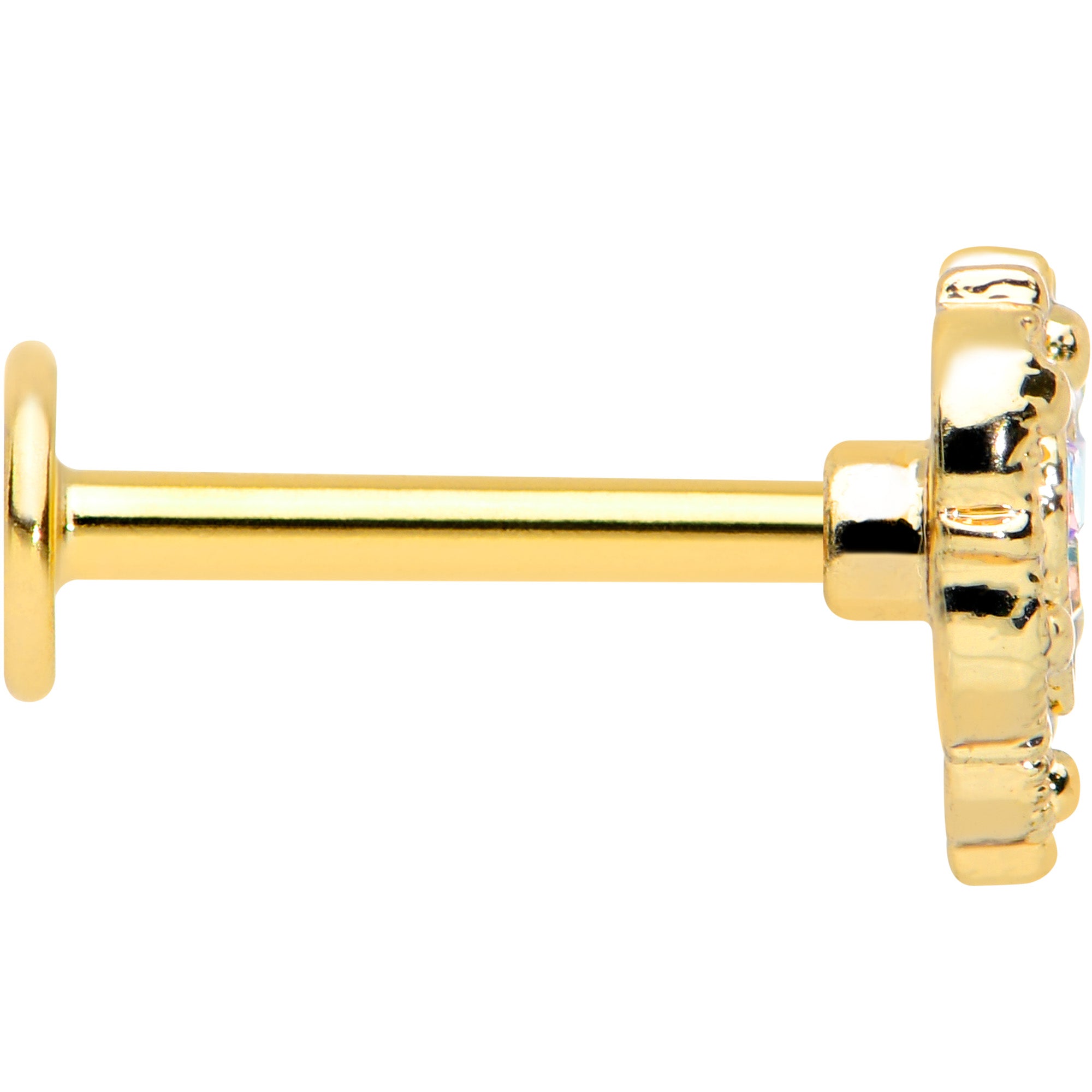 Look luxe without breaking the bank with this 16 gauge lip ring! It's made with an 8mm gold tone PVD over 316L surgical grade stainless steel straight barbell with a flat disc end. It features a heart charm, with ornate textured detailing and a trio of aurora gems at the center. You can even rock this Valentine in multiple piercings including lip, monroe, tragus, helix, and some conch piercings. You're going to fall in love with the baroque look of this heart-themed cartilage jewelry!