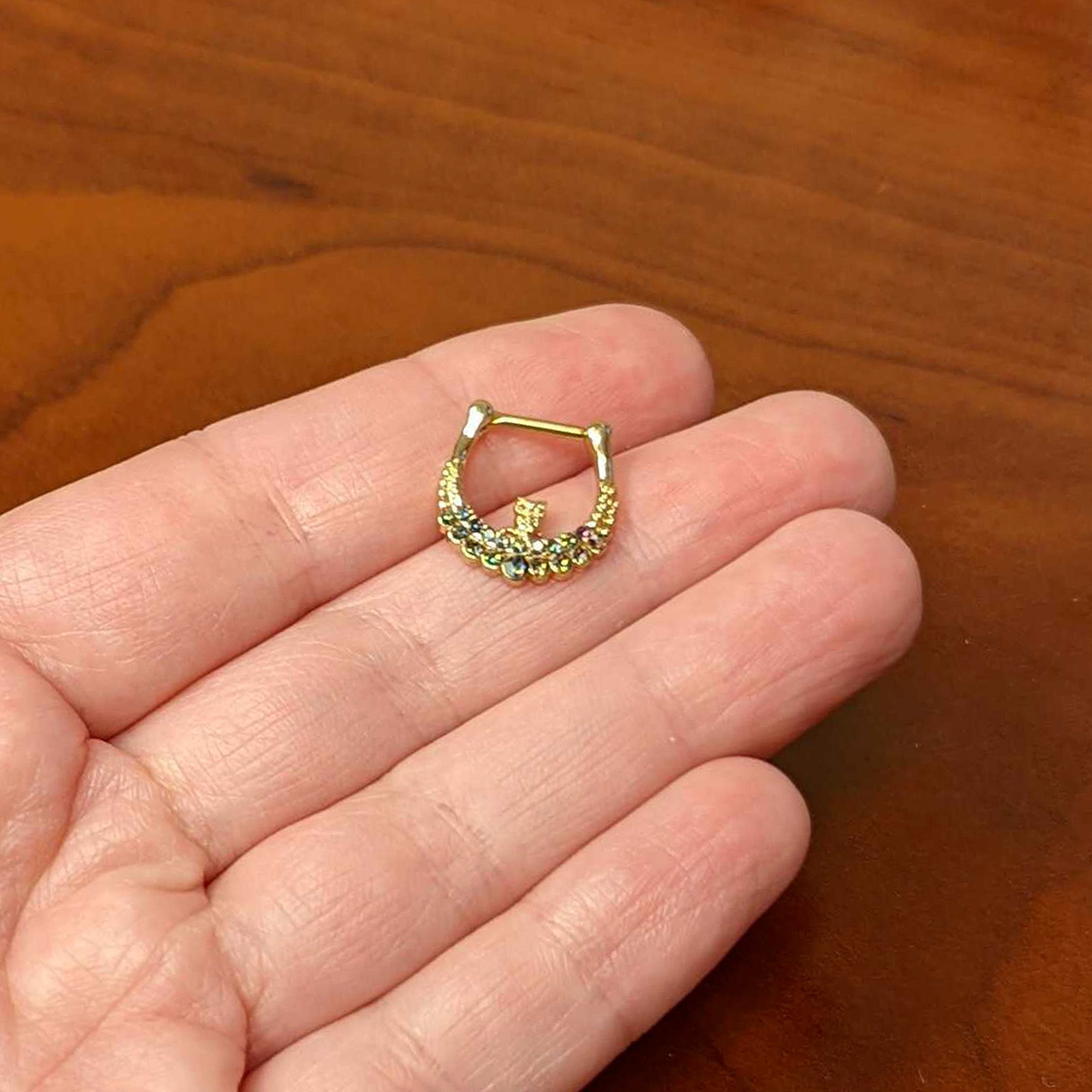 If only all the owls looked as swank as the one on this 16 gauge cartilage jewelry! It's made with an 8mm gold tone PVD over 316L surgical grade stainless steel hinged straight barbell. It features an owl charm, with textured detailing. The owl is perched on a crescent moon which is paved with aurora gems for a truly upscale look. It also features a hinged clicker design that makes insertion and removal a snap! You can even rock it in multiple piercings including tragus, helix, and some conch piercings. When you're rocking this tragus jewelry, your cartilage piercing will look like avian aristocracy!