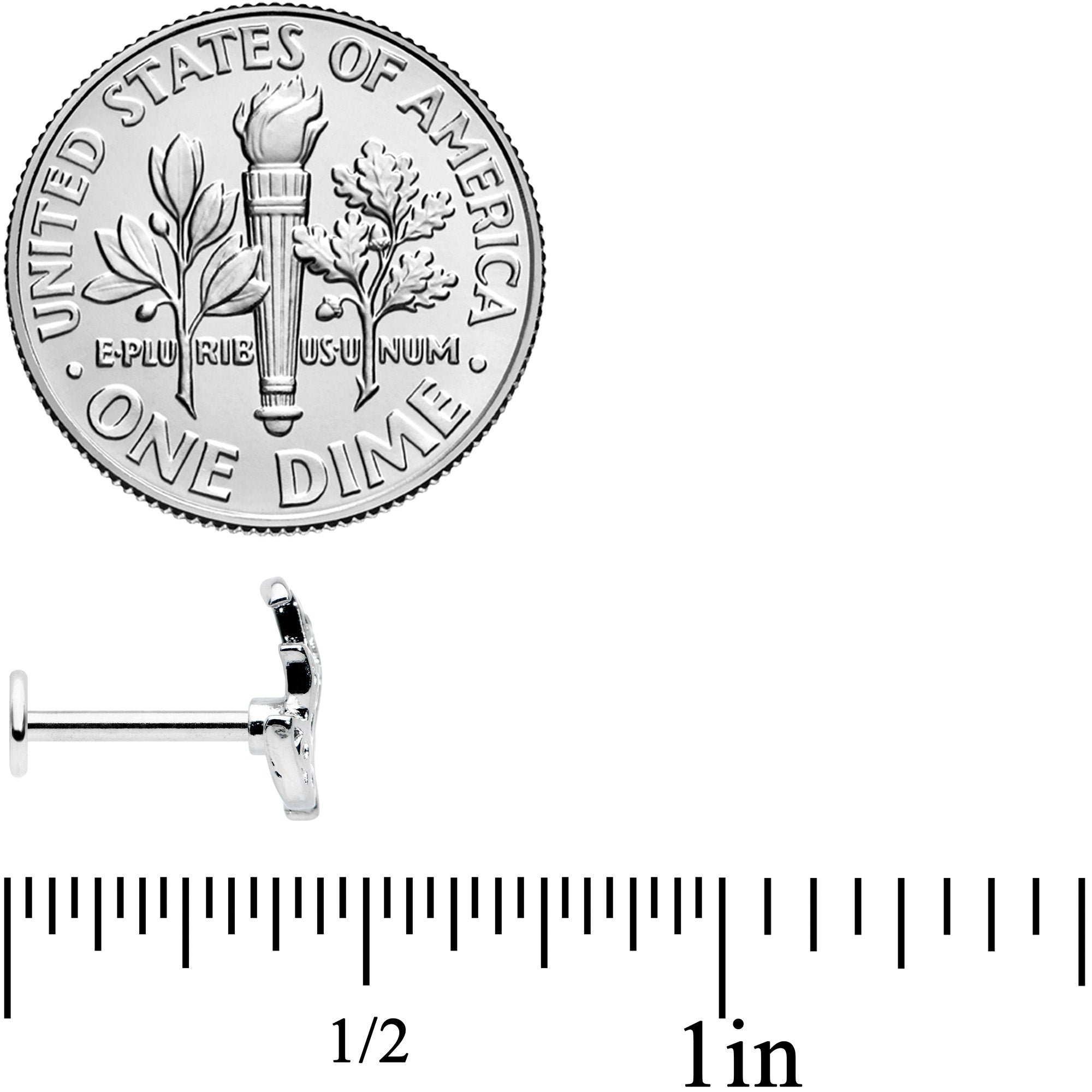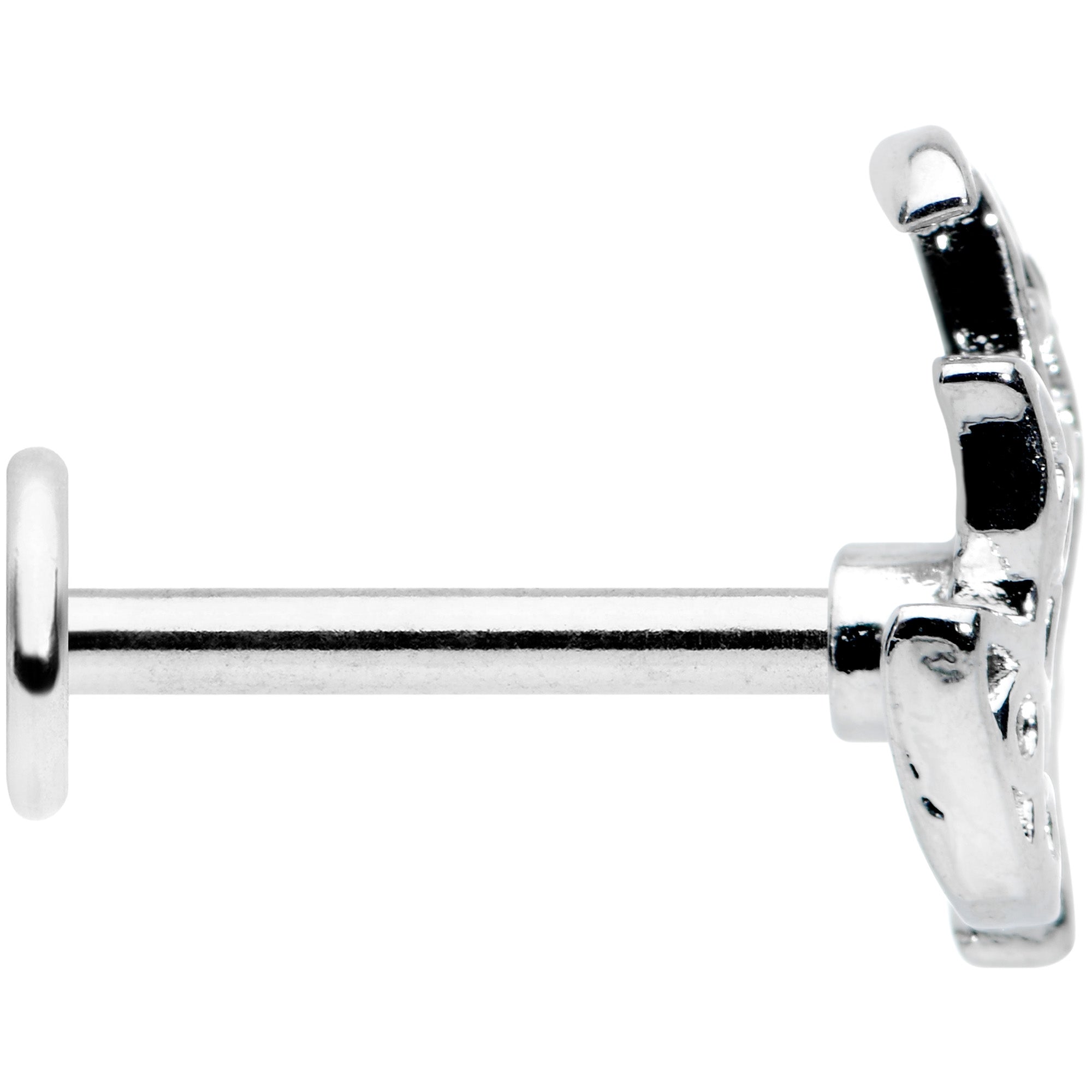 The leaves are changing color so let your piercings match with this 16 gauge lip ring! It's made with an 8mm durable 316L surgical grade stainless steel straight barbell with a flat disc end. It features a maple leaf charm, with one side embellished with openwork filigree. The other side is inlaid in Fall colors for a perfectly autumnal feel. You can rock this leaf in multiple piercings including lip, monroe, tragus, helix, and some conch piercings. Let your cartilage piercings reflect the cycle of the seasons with this multicolor maple leaf cartilage jewelry.