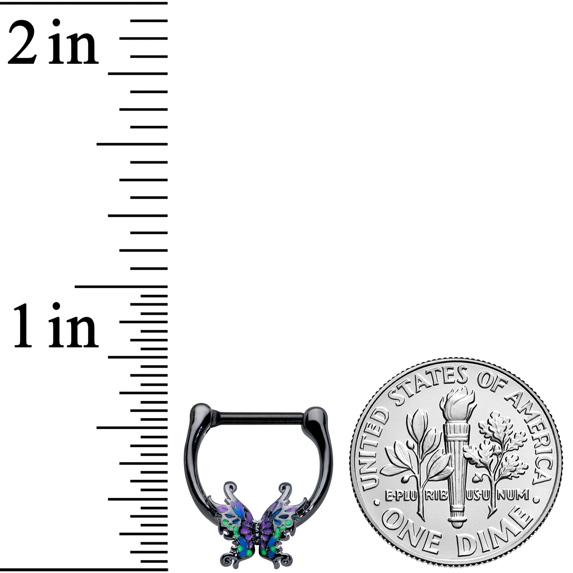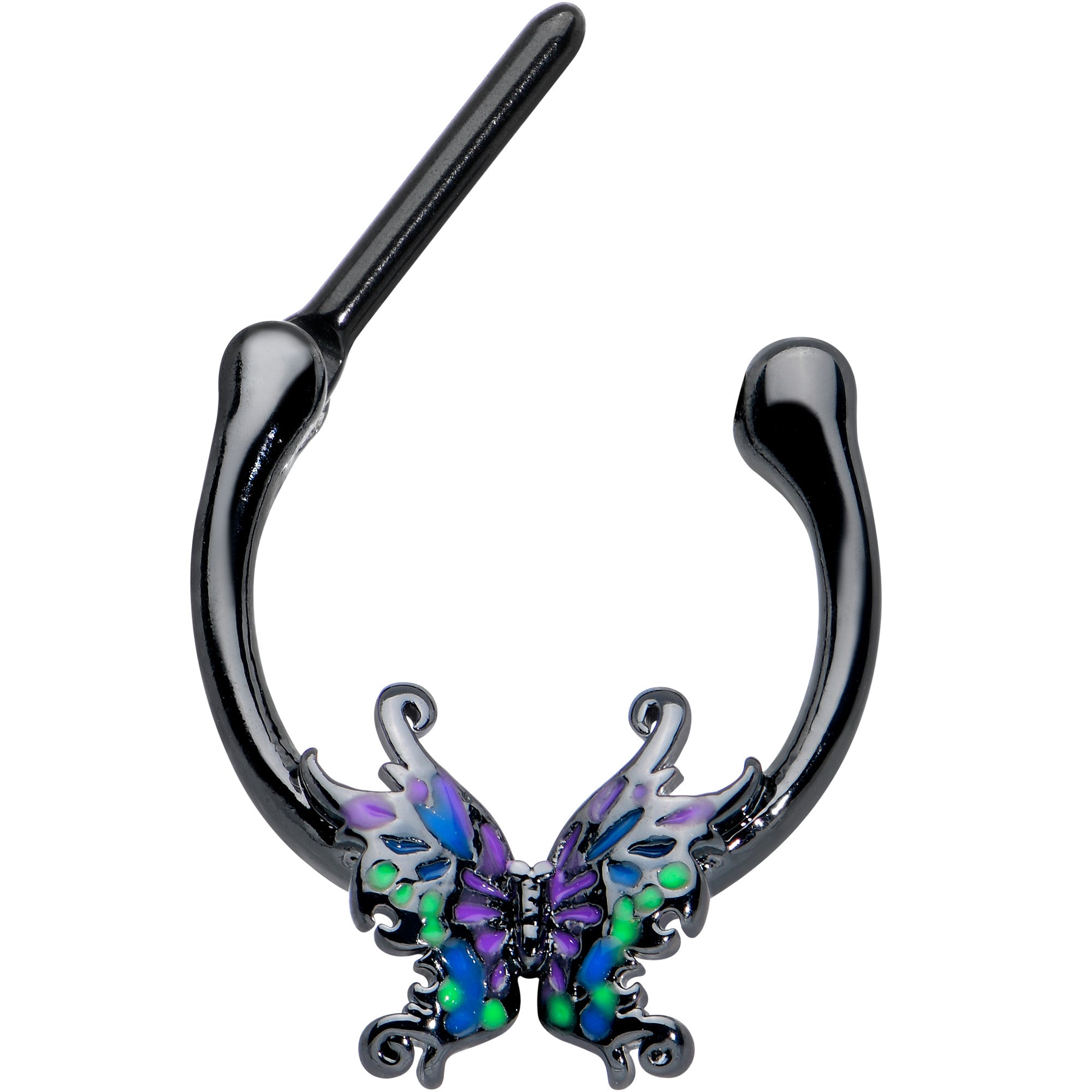 Whether you're a Faerie at heart or a lover of dark fantasy, this 16 gauge cartilage jewelry is sure to cast a spell on you! It's made with an 8mm black PVD over 316L surgical grade stainless steel hinged straight barbell. The bottom curve features a faerie wings charm, with blue, green, and purple embellishments to make the feather detailing really catch the eye. It also features a clicker design that makes insertion and removal a snap and you can even wear these wings in multiple piercings including tragus, helix, and some conch piercings. With its elegant style and fantasy theme, this tragus ring is absolutely magical!