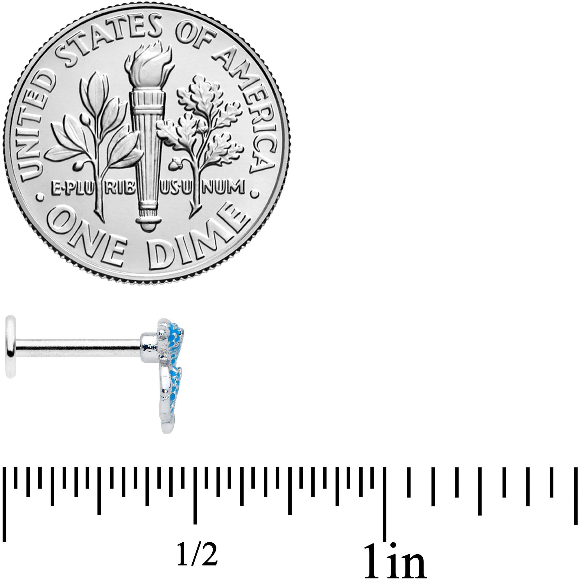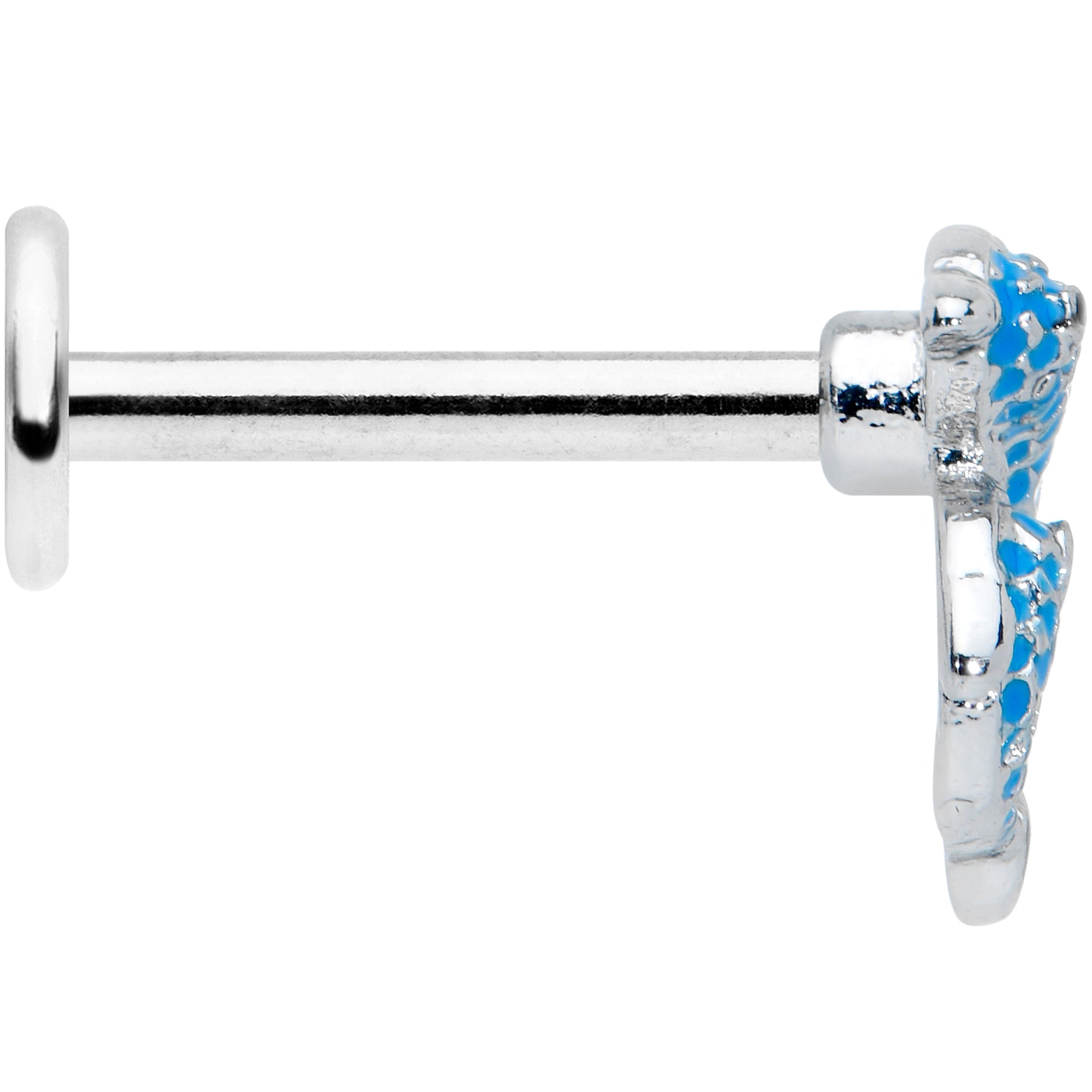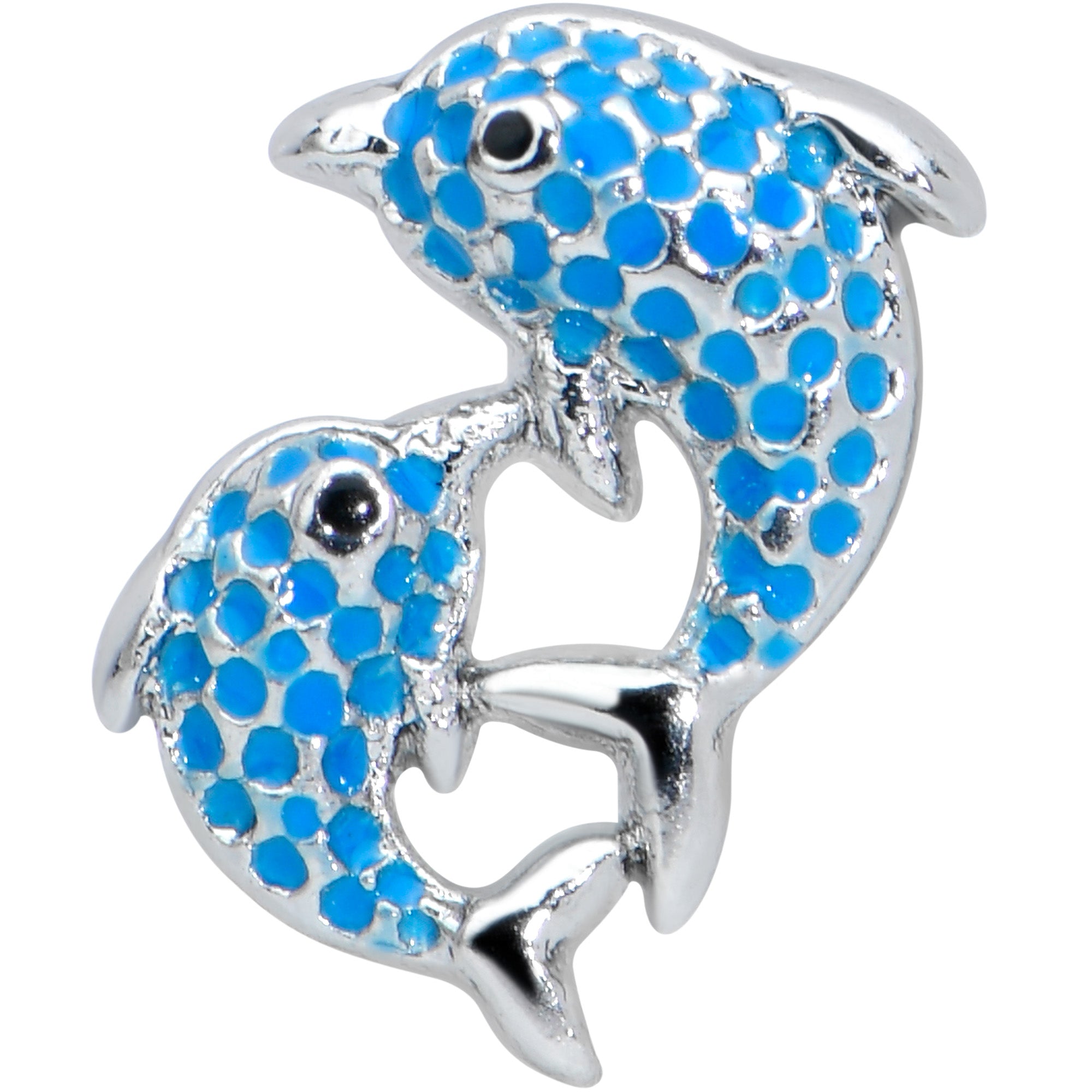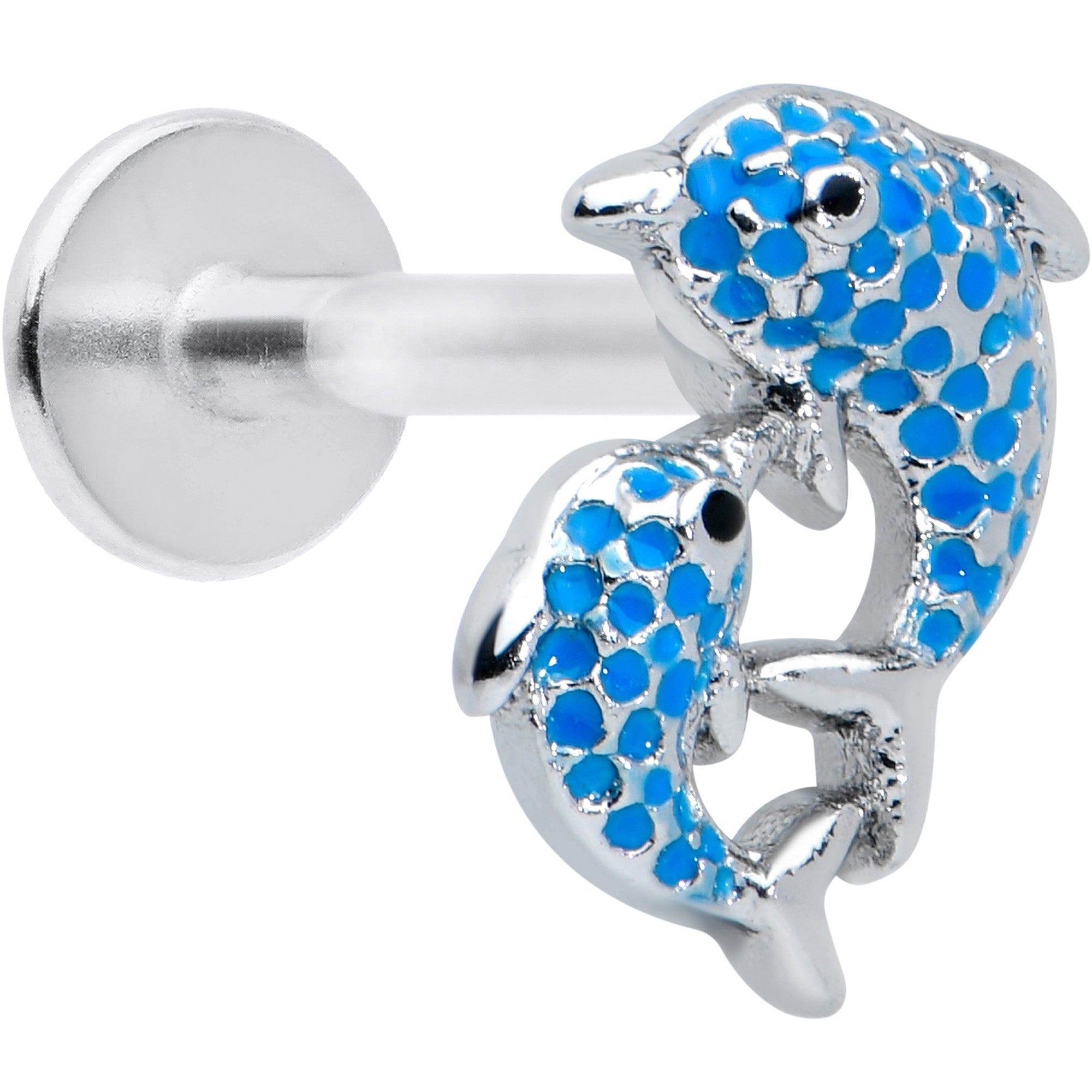 You'll be leaping for joy when you're rocking this 16 gauge lip ring! It's made with an 8mm durable 316L surgical grade stainless steel straight barbell with a flat disc end. It features a pair of leaping dolphins, set with blue inlay for realistic color and featuring a tiny black gem eye. You can even rock it in multiple piercings including lip, monroe, tragus, helix, and some conch piercings. Whether you're daffy for dolphins or mad for marine mammals, this delightful dolphin cartilage piercing jewelry is sure to please!