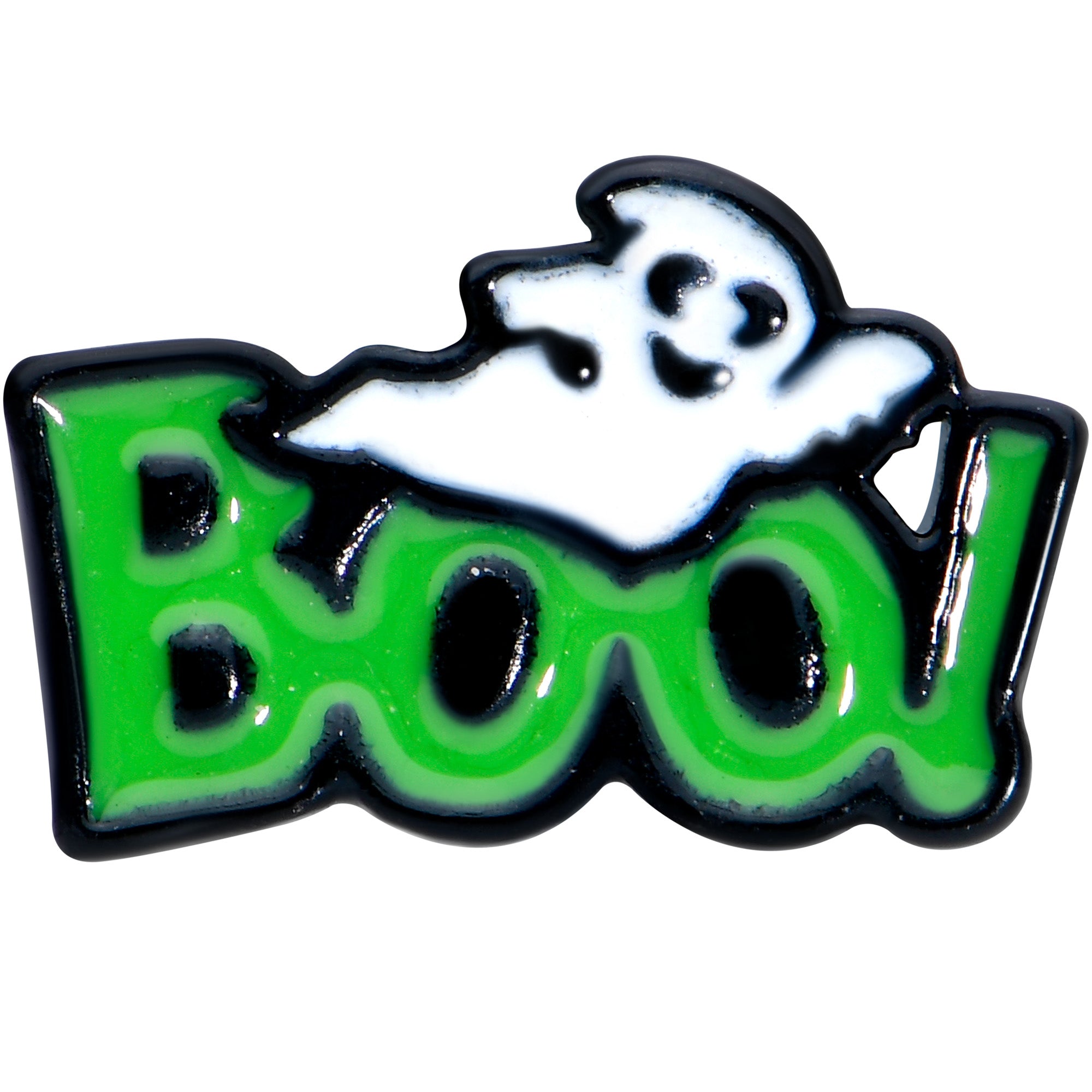 Deck out your cartilage piercing for Halloween! This 16 gauge lip ring is made with an 8mm black PVD over 316L surgical grade stainless steel straight barbell with a flat disc end. It features a green Boo charm with a spooky ghost! This tragus stud can be worn in multiple piercings including lip, monroe, tragus, helix, and some conch piercings.