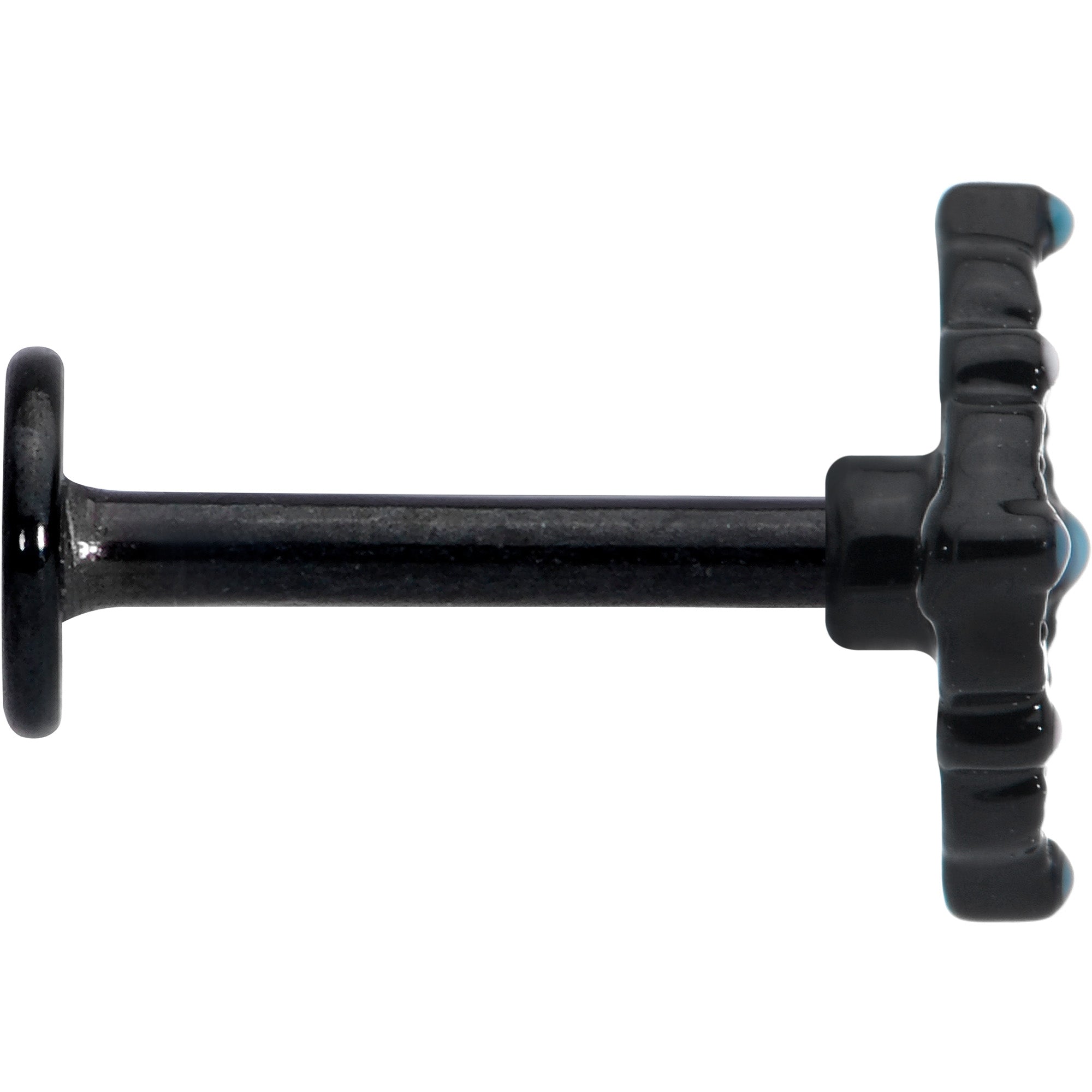 Let this 16 gauge lip ring get your look all laced up. It is made with an 8mm black PVD over 316L surgical grade stainless steel straight post with a flat disc end. It features a lacy styled black charm, set with a blue orb center. It is further embellished with blue and white along the edges and textured detailing and you can rock it in multiple piercings including lip, monroe, tragus, helix, and some conch piercings. You are going to love the look of lace when you are rocking this airy, lace-inspired cartilage piercing ring.