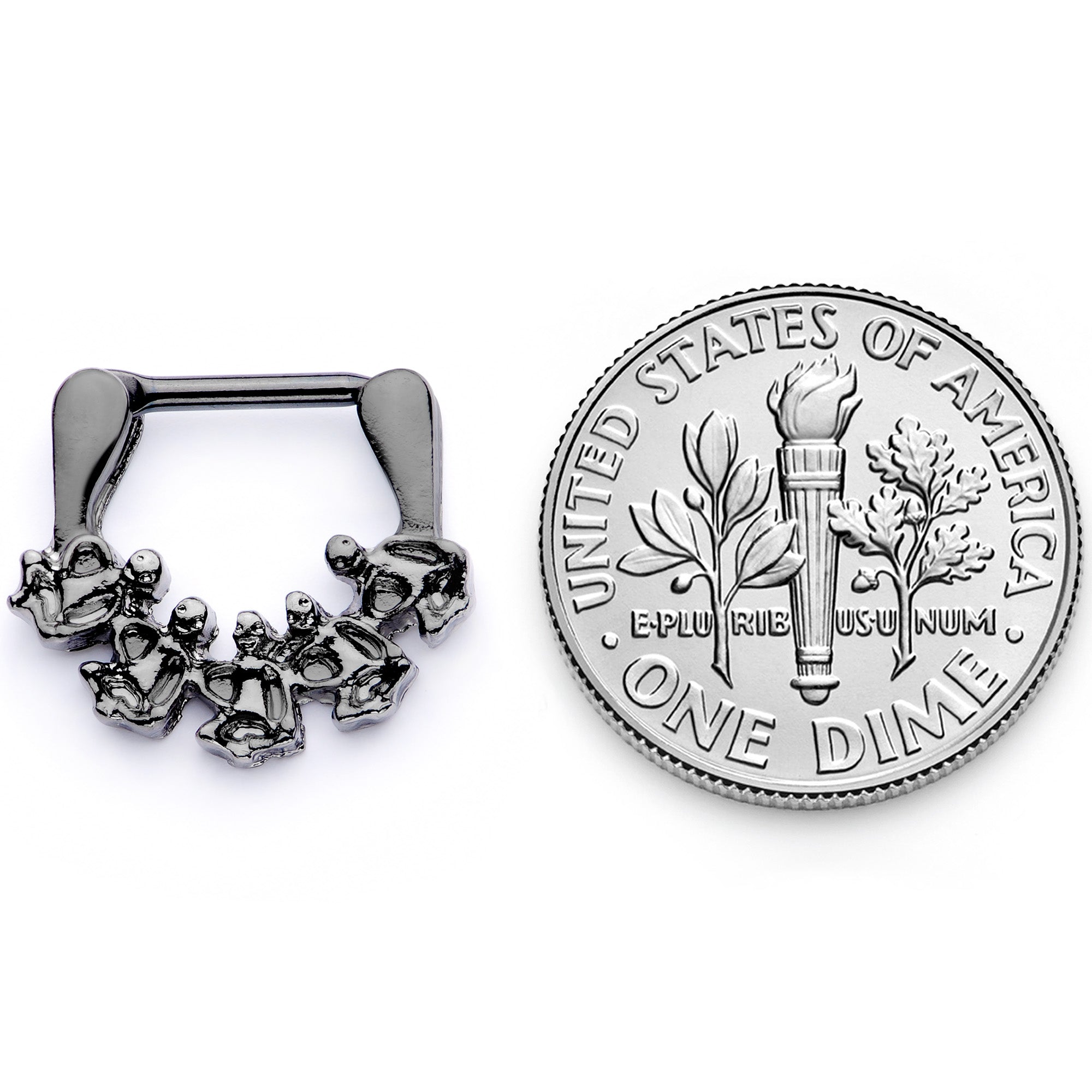 Whether it's Halloween or you're just looking for a scream of a deal, this 16 gauge septum jewelry will give you the chills. Made with an 8mm black electroplated over 316L surgical grade stainless steel hinged straight barbell, this cartilage jewelry features a series of skeletons sitting in a row along the bottom arc and can be worn in a variety of piercings, including your septum piercing as well as cartilage piercings like the helix, rook, daith, tragus, and more.
