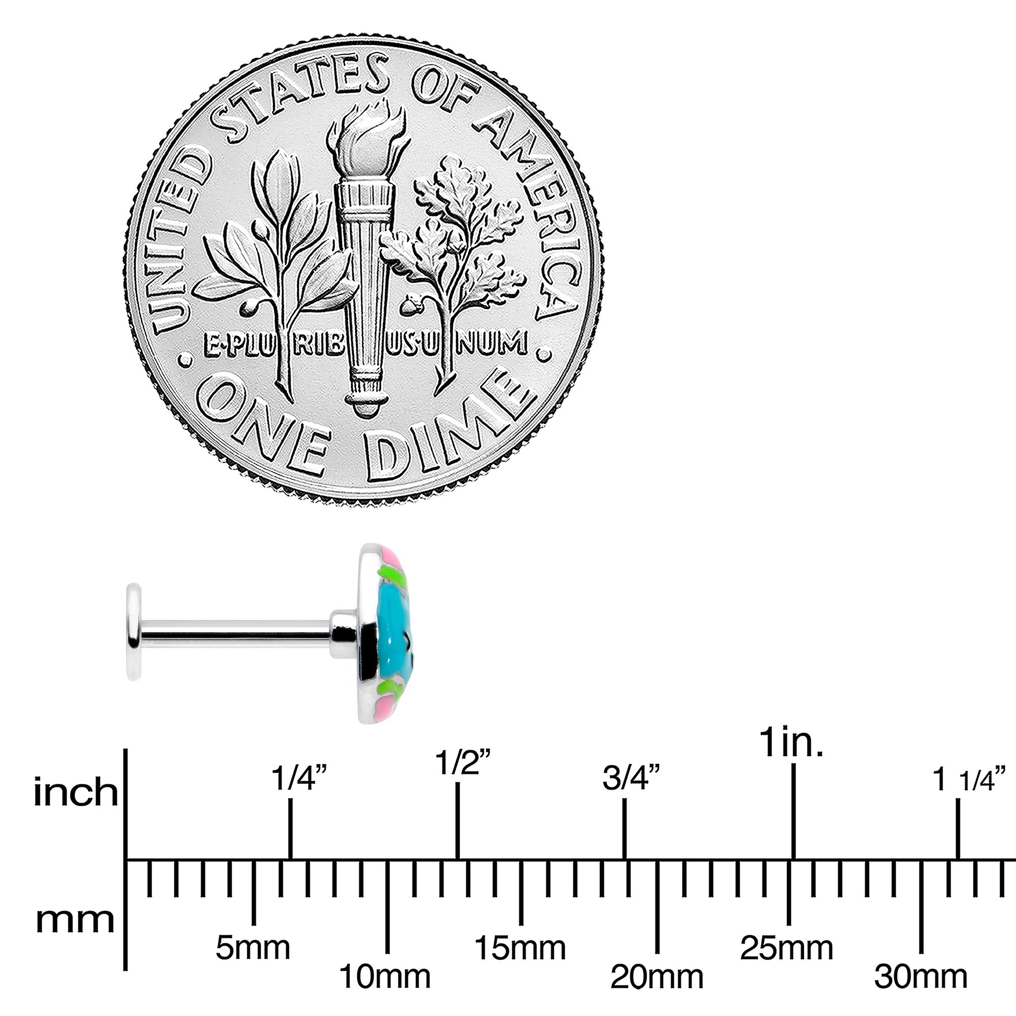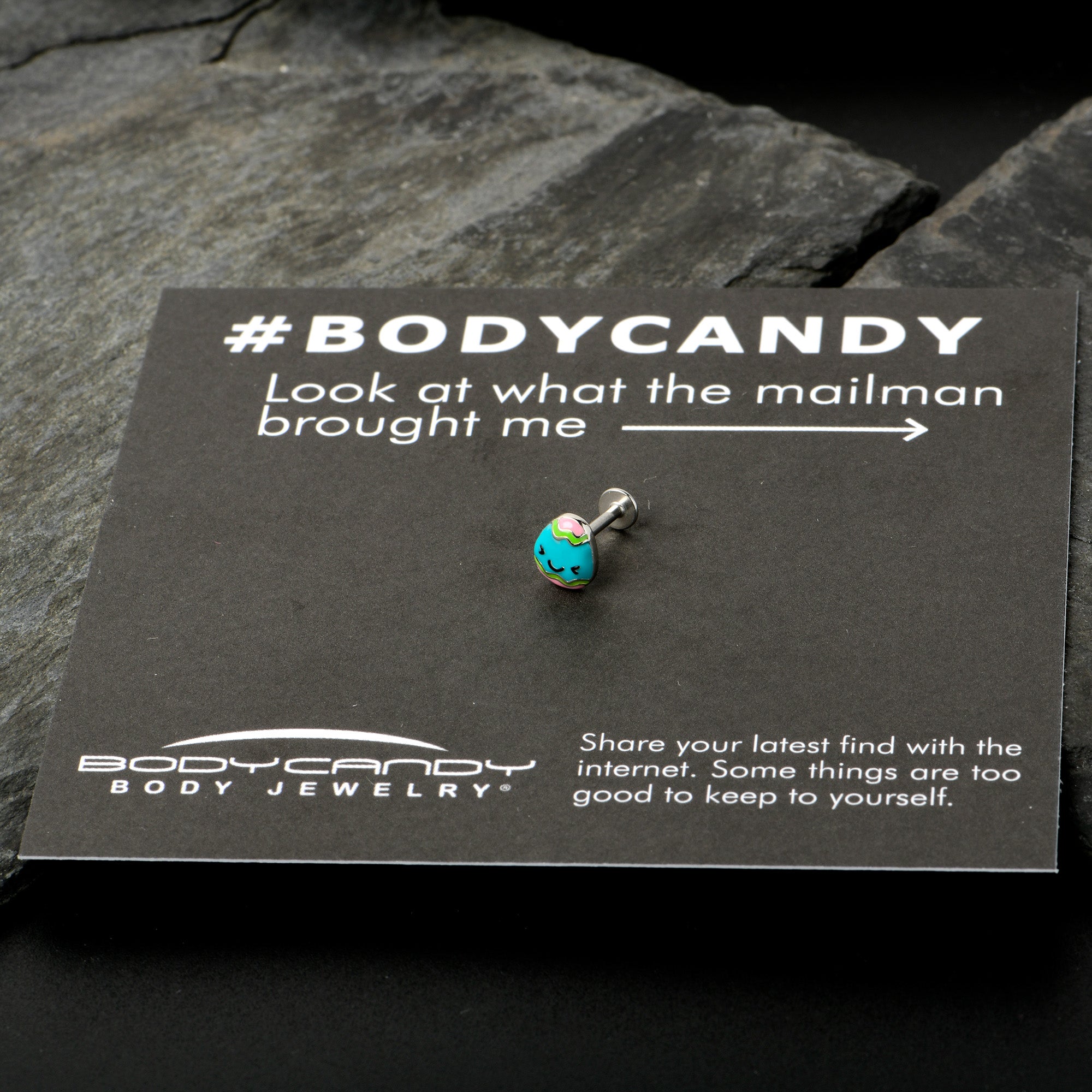 Get ready to hatch a new look for Easter with this 16 gauge lip ring! It's made with an 8mm durable 316L surgical grade stainless steel straight post with a flat disc end. It features a blue Easter egg charm, with a cheerful smiling face. The egg is further embellished with pink and green ends for a festive touch of color and you can even rock it in multiple piercings including lip, monroe, tragus, helix, and some conch piercings. You won't have to hunt for kawaii style body jewelry for Easter when you're rocking this Easter egg cartilage piercing ring!