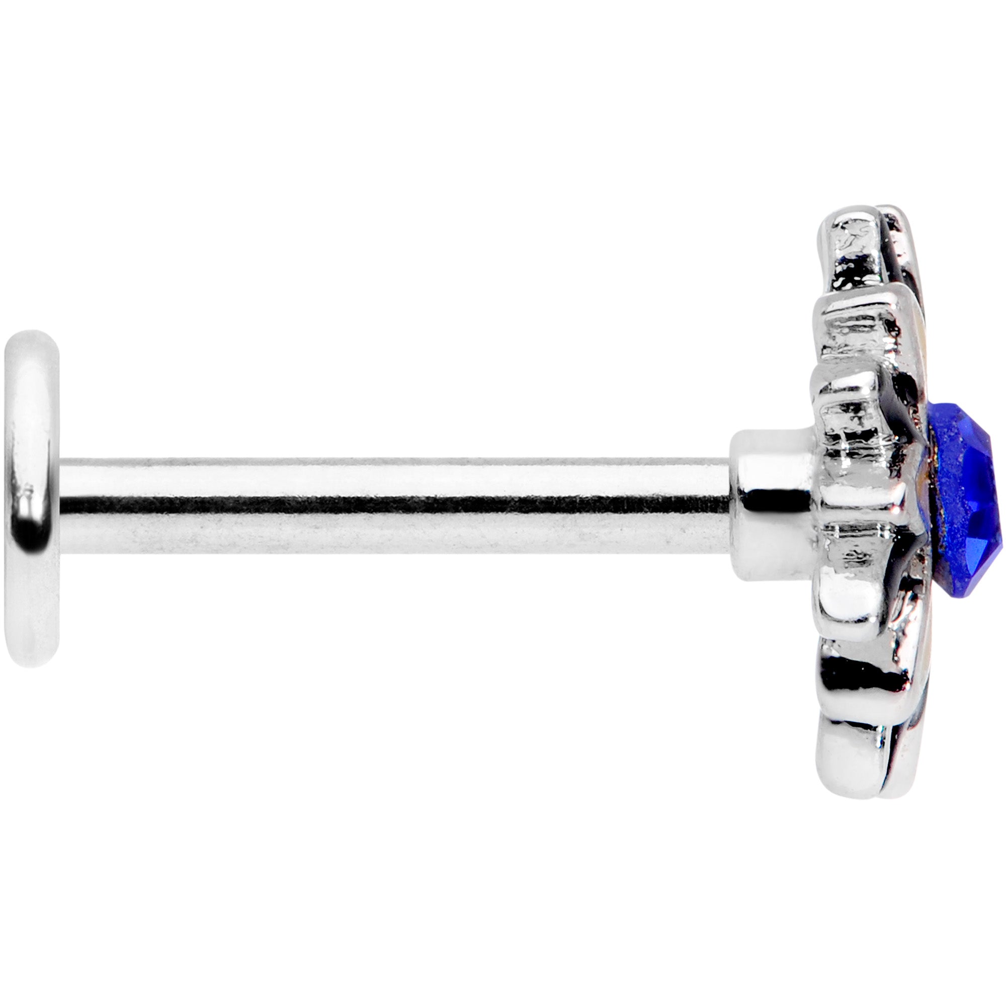 The sun is out...and it's bedecked in blue on this 16 gauge lip ring! It's made with an 8mm durable 316L surgical grade stainless steel straight barbell with a flat disc end. The other end features a yellow sunflower charm with blue detailing between the petals. The center is set with matching blue faux druzy for a look that catches the eye without overwhelming it. And you can wear this flower in multiple piercings including labret, monroe, tragus, helix, and some conch piercings. Make every day a sunny day with this striking sunflower cartilage piercing jewelry!