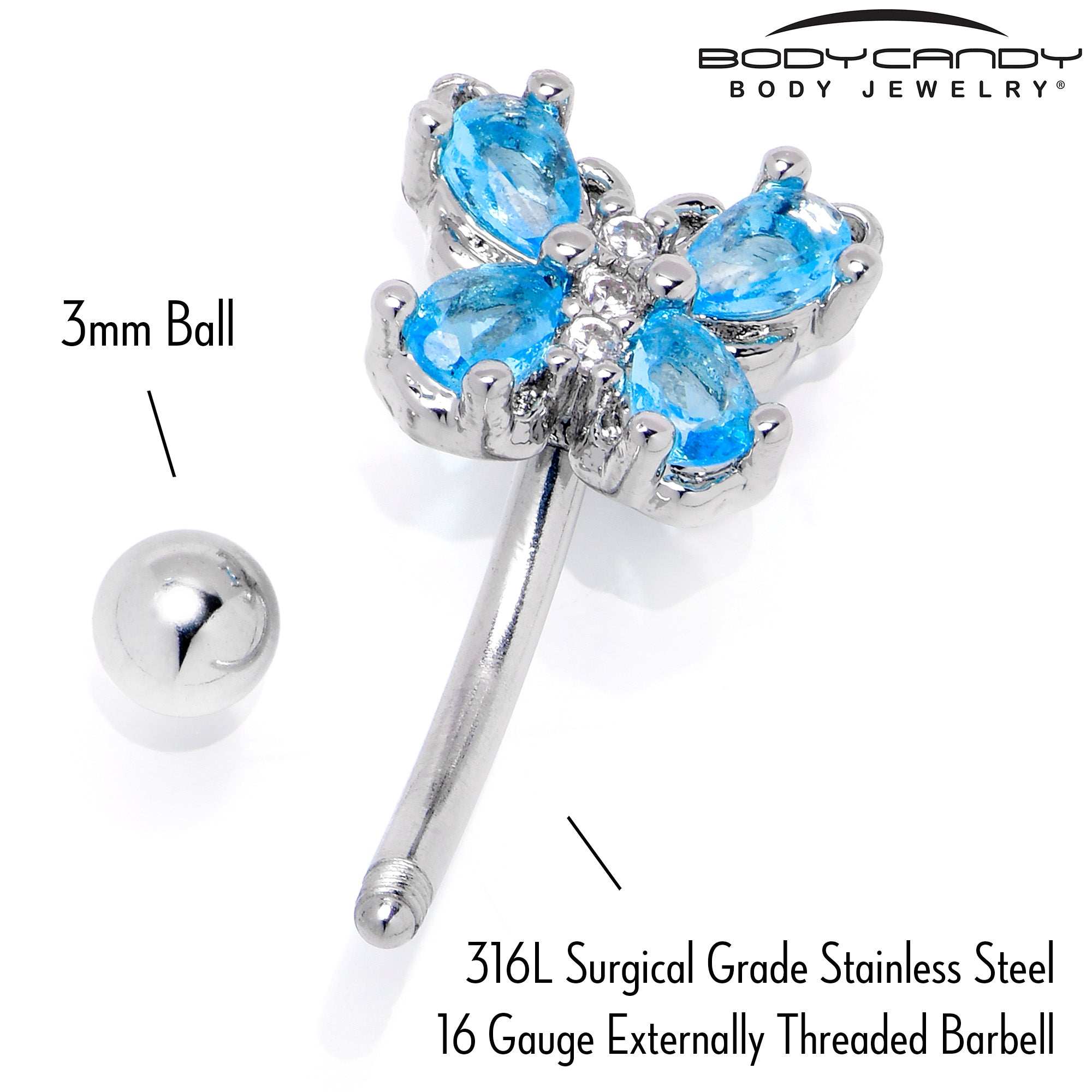 The butterfly on this 16 gauge eyebrow ring will make you want to go for baroque. It's made with an 8mm durable 316L surgical grade stainless curved barbell with a 3mm ball end. The top end features a butterfly charm, with wings set with large blue gems. The butterfly is further embellished with clear gems for an ornate appearance and you can even rock it in multiple piercings including eyebrow and rook piercings. This opulent butterfly cartilage piercing jewelry will make you want to fly.