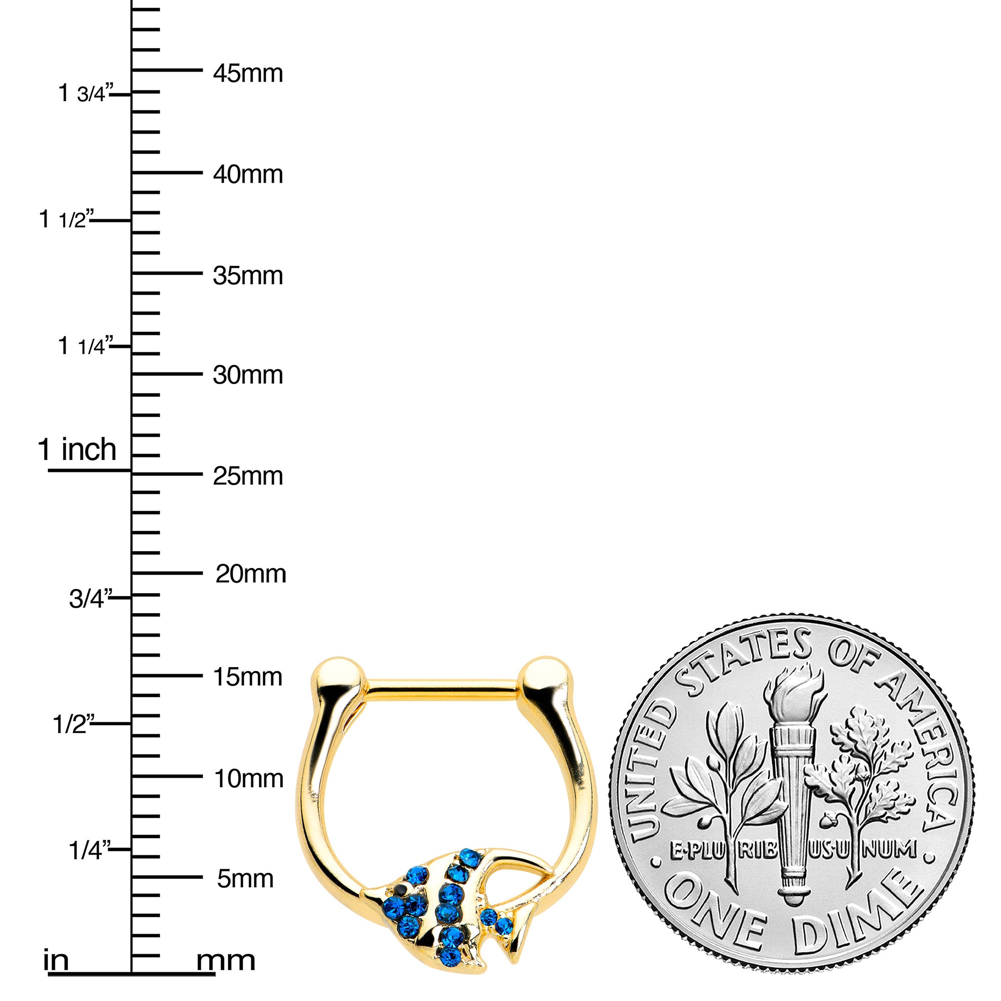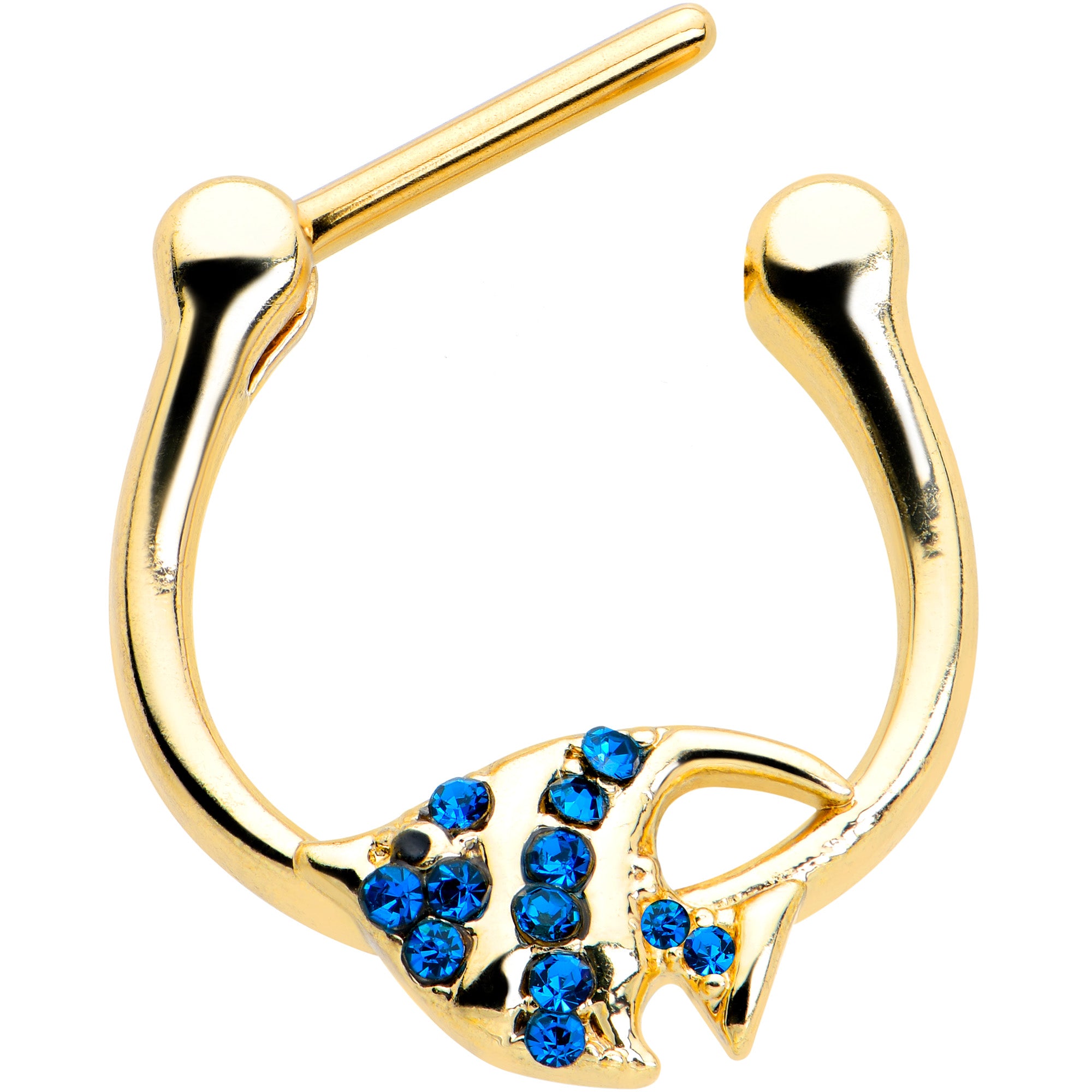 Your cartilage piercings will look downright angelic when you're rocking this 16 gauge septum ring! It's made with an 8mm gold tone PVD over 316L surgical grade stainless steel hinged straight barbell. It features an angelfish charm, set with deep blue gems for an elegant color contrast. It also features a hinged, clicker design that makes insertion and removal a snap and you can rock this ring in multiple piercings including tragus, helix, and some conch piercings! Give your cartilage piercing a nifty, nautical look with this elegant angelfish tragus ring!