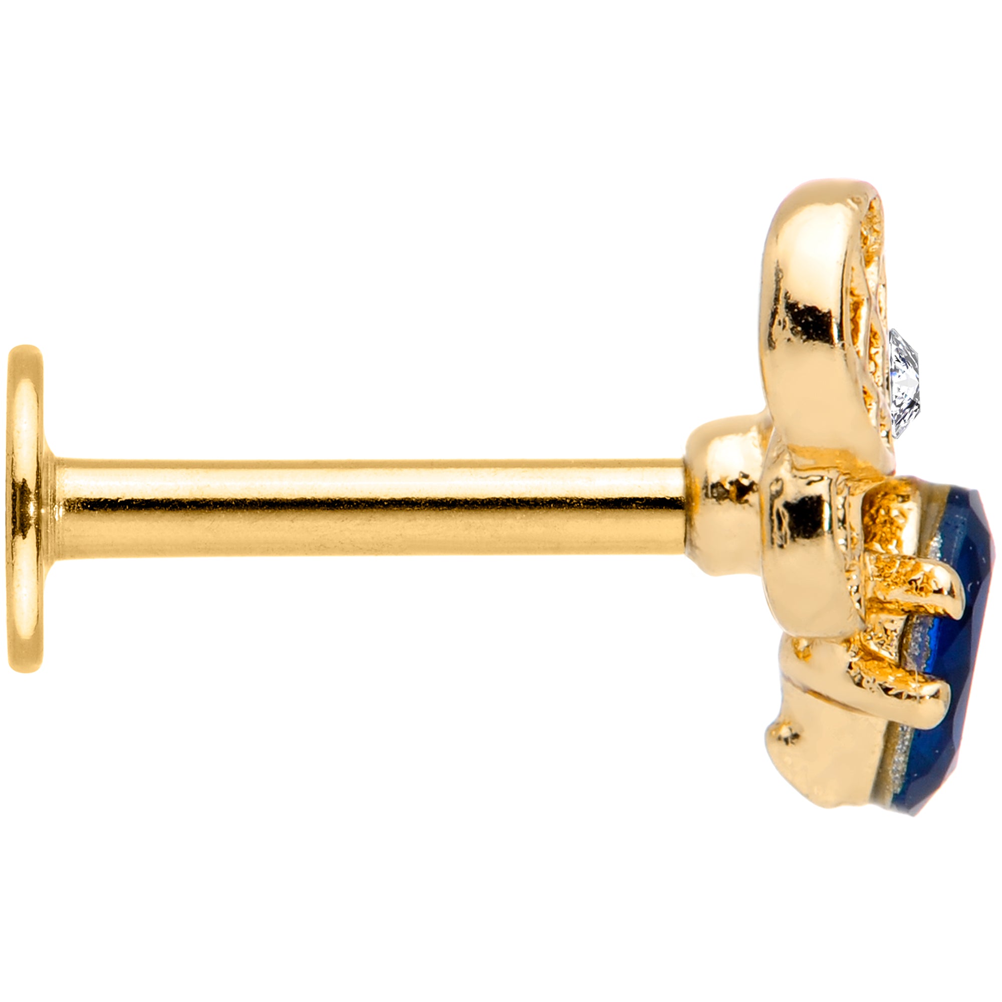 This 16 gauge lip ring is sure to bee-utify your cartilage piercing! It's made with an 8mm gold tone PVD over 316L surgical grade stainless steel straight barbell with a flat disc end. It features a bee charm composed of a single large blue gem, with a tiny clear gem set at the head. The bee also features openwork wings for a cohesive and airy appearance that you can wear in multiple piercings including lip, monroe, tragus, helix, and some conch piercings. This unconventional insect jewelry is sure to bee your favorite cartilage ring!