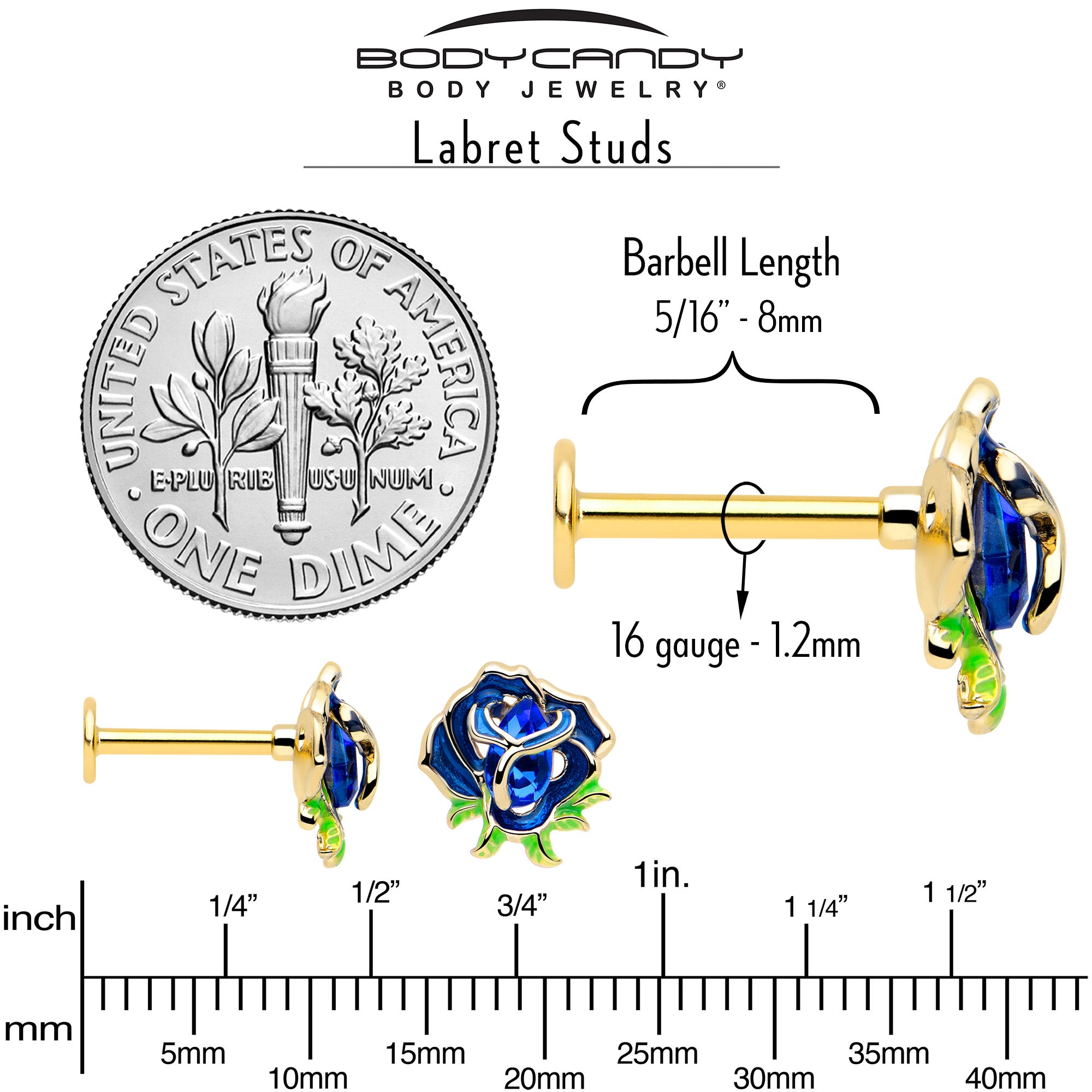 16 Gauge 5/16 Blue Gem Gold Tone Deep Blue Flower Labret Monroe Tragus