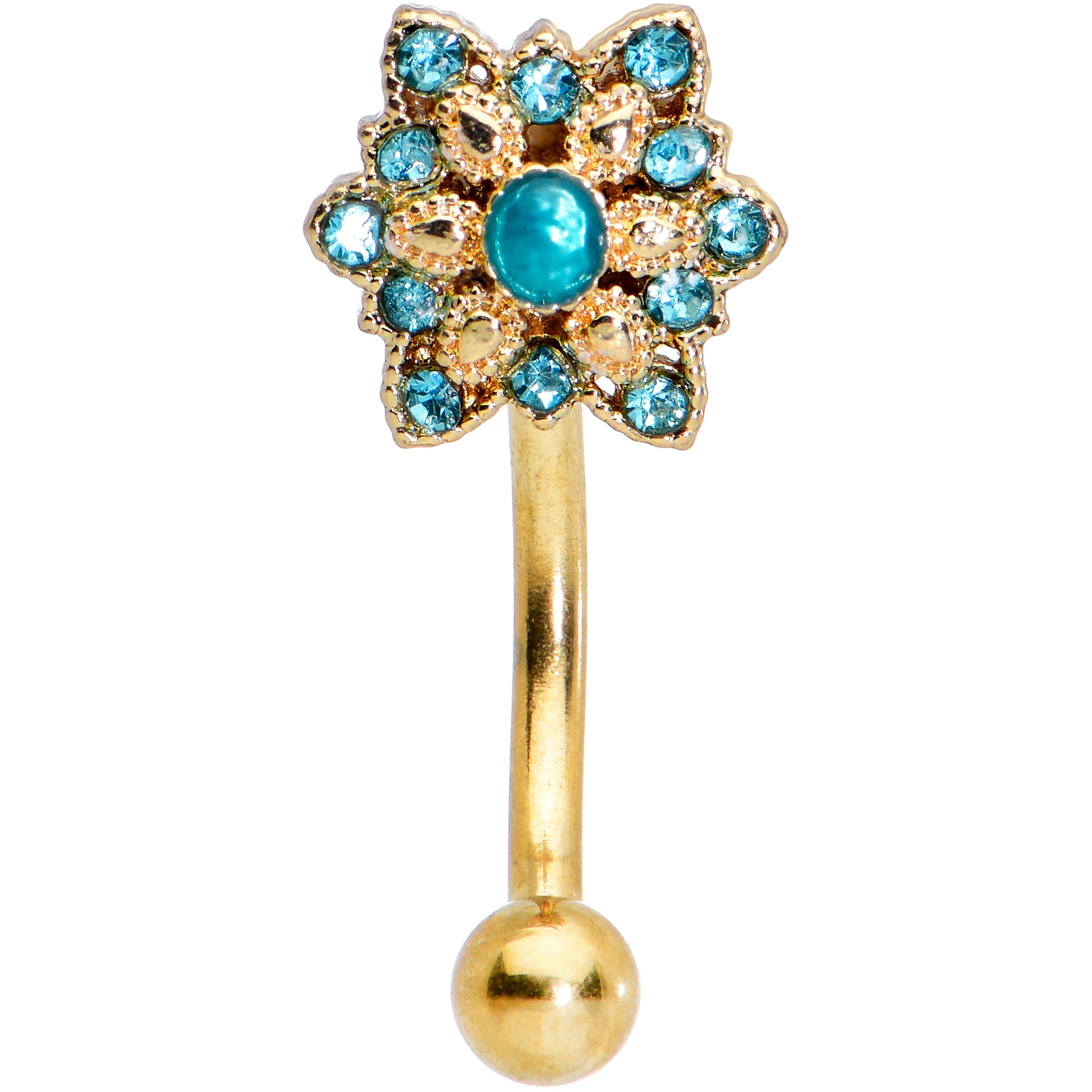 The snowflake on this 16 gauge cartilage jewelry is sure to absolutely melt your heart! It's made with an 8mm gold tone PVD over 316L surgical grade stainless steel curved barbell with a 3mm bottom ball end. The top end features an intricate snowflake charm set with blue gems as well as a matching blue orb at the center for a luscious touch of color you'll totally fall for! You can even rock it in multiple piercings including tragus, rook, and eyebrow piercings. This winter, let the snow spruce up your cartilage piercings with this sweet and snowy eyebrow piercing ring!