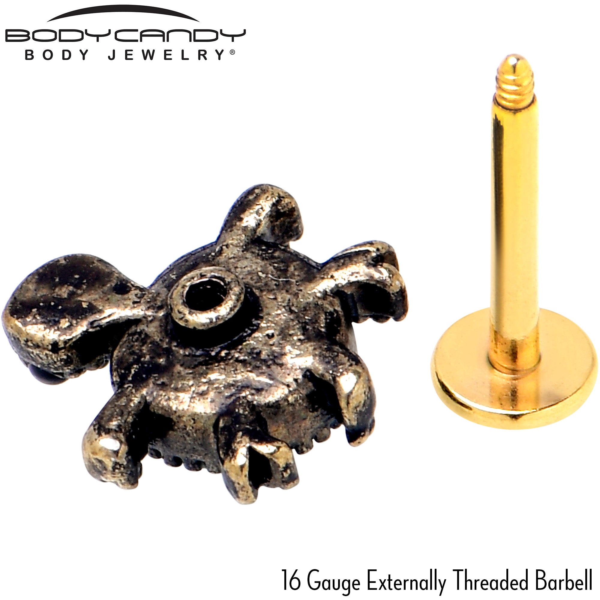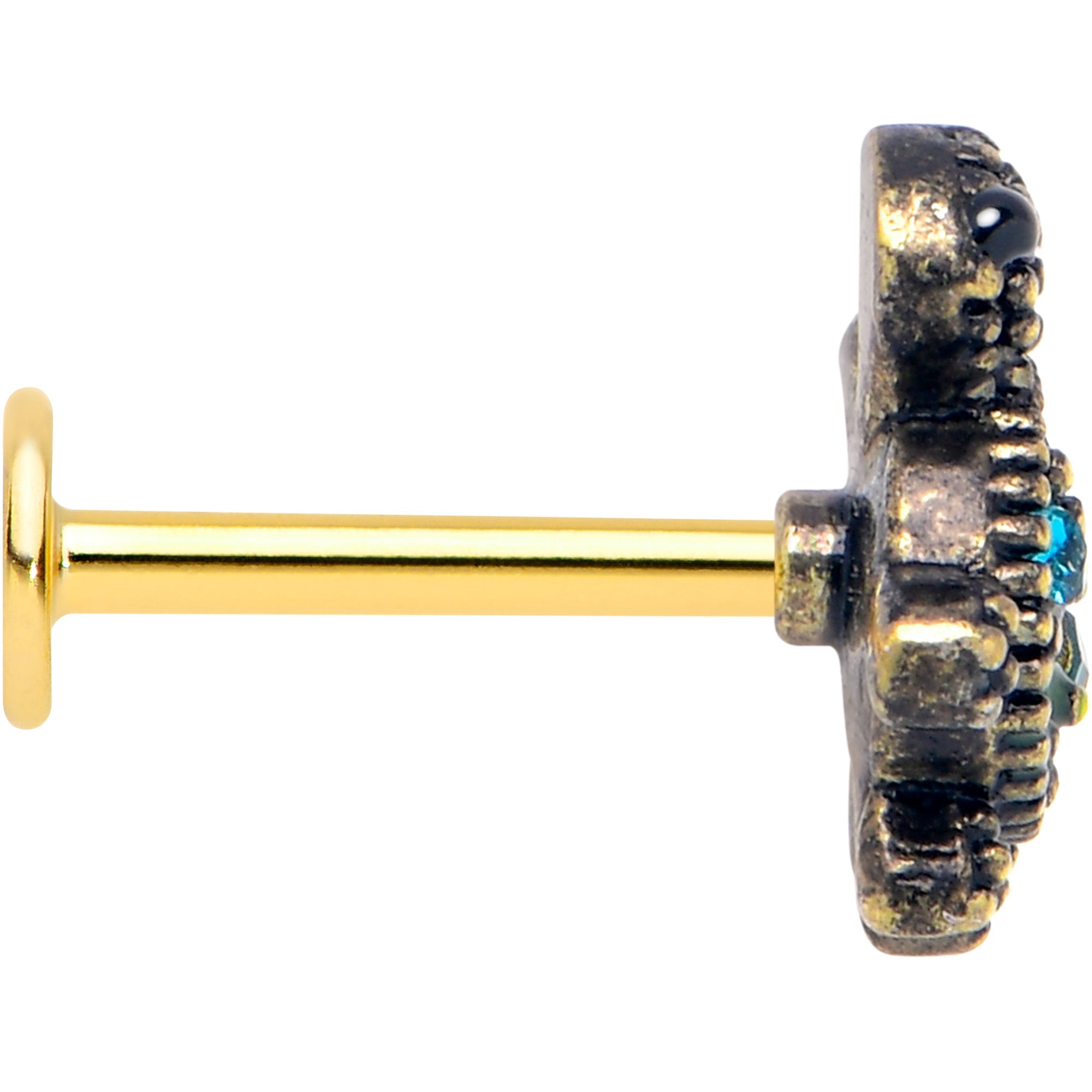 The turtle on this 16 gauge lip ring is all decked out in glitzy style. It's made with an 8mm gold tone PVD over 316L surgical grade stainless steel straight post with a flat disc end. It features a turtle charm, with blue gems set into its back, as well as green inlay and textured detailing for added style. It even features a sweetly whimsical expression on the turtle's face and you can rock it in multiple piercings including lip, monroe, tragus, helix, and some conch piercings. You will be swimming in style when you're rocking this colorful turtle cartilage piercing jewelry.