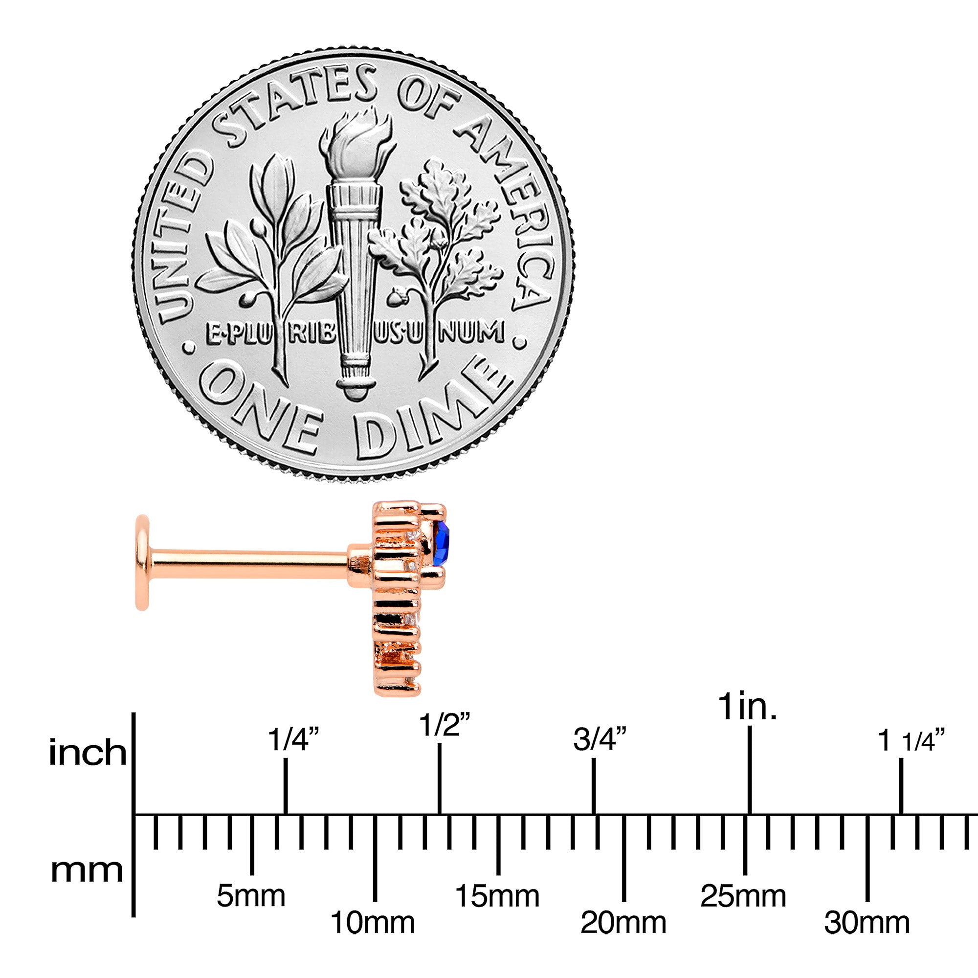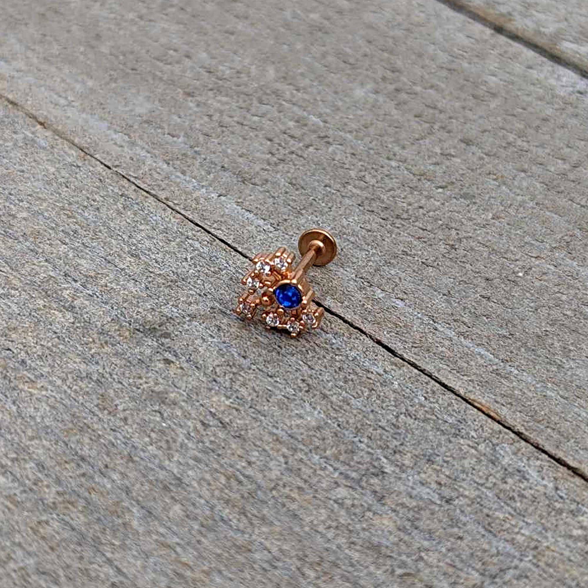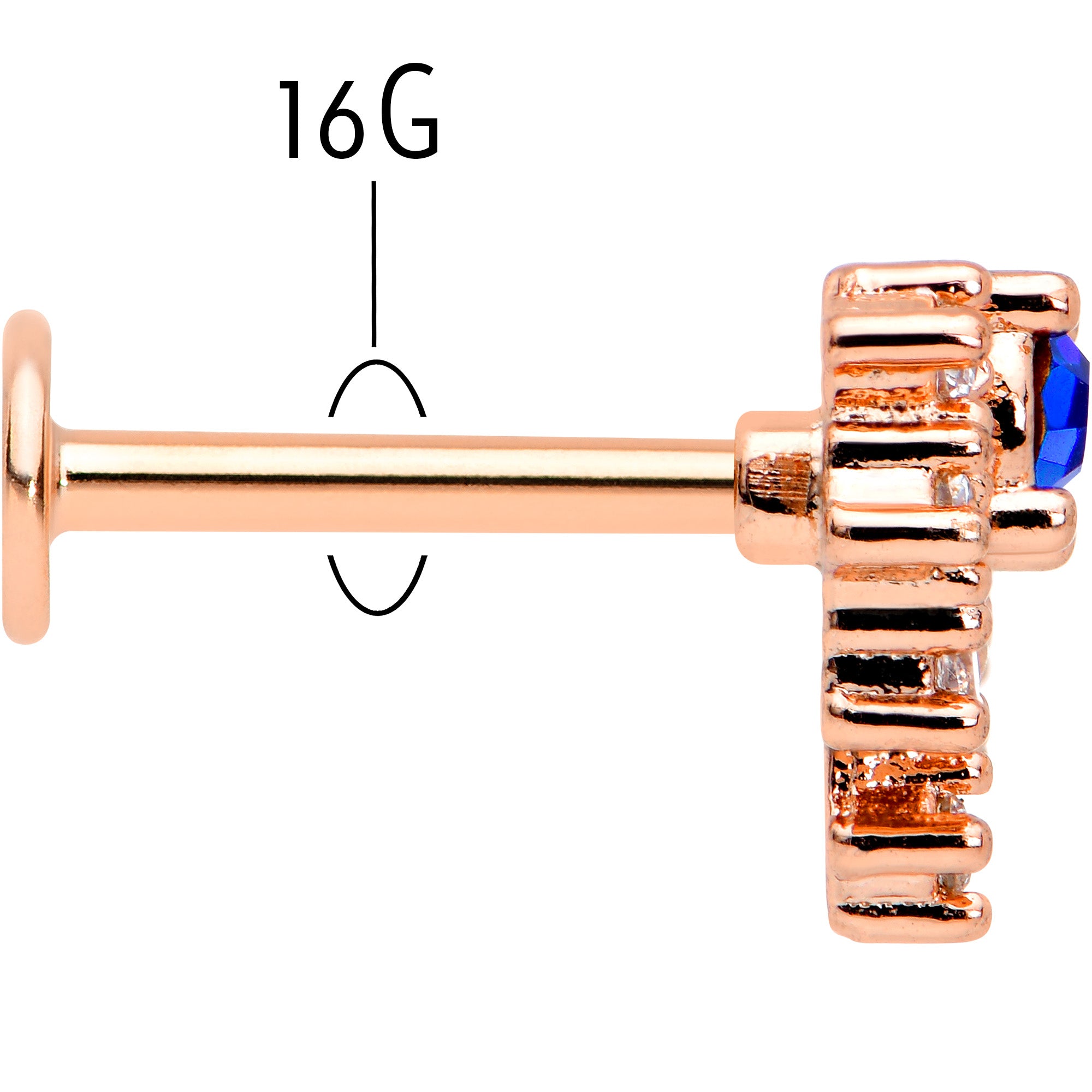 The flare on this 16 gauge lip ring is going to add a ton of flair to your look! It's made with an 8mm rose gold tone PVD over 316L surgical grade stainless steel straight post with a flat disc end. It features a blue gem charm, surrounded by rays tipped with clear gem ends for a firey look! You can even rock it in multiple piercings including lip, monroe, tragus, helix, and some conch piercings. You'll be enjoying a fashion flareup when you're rocking this colorful cartilage piercing ring!