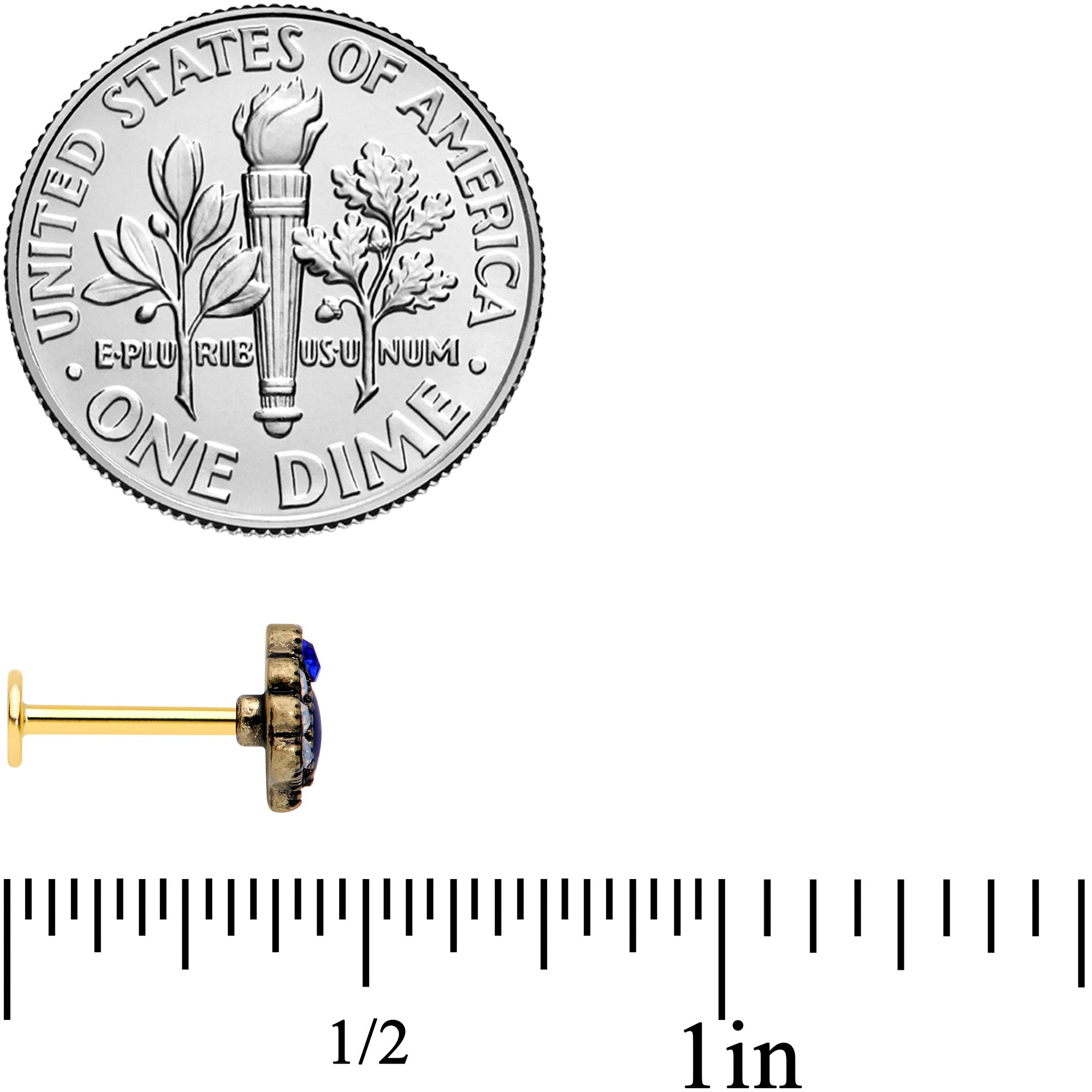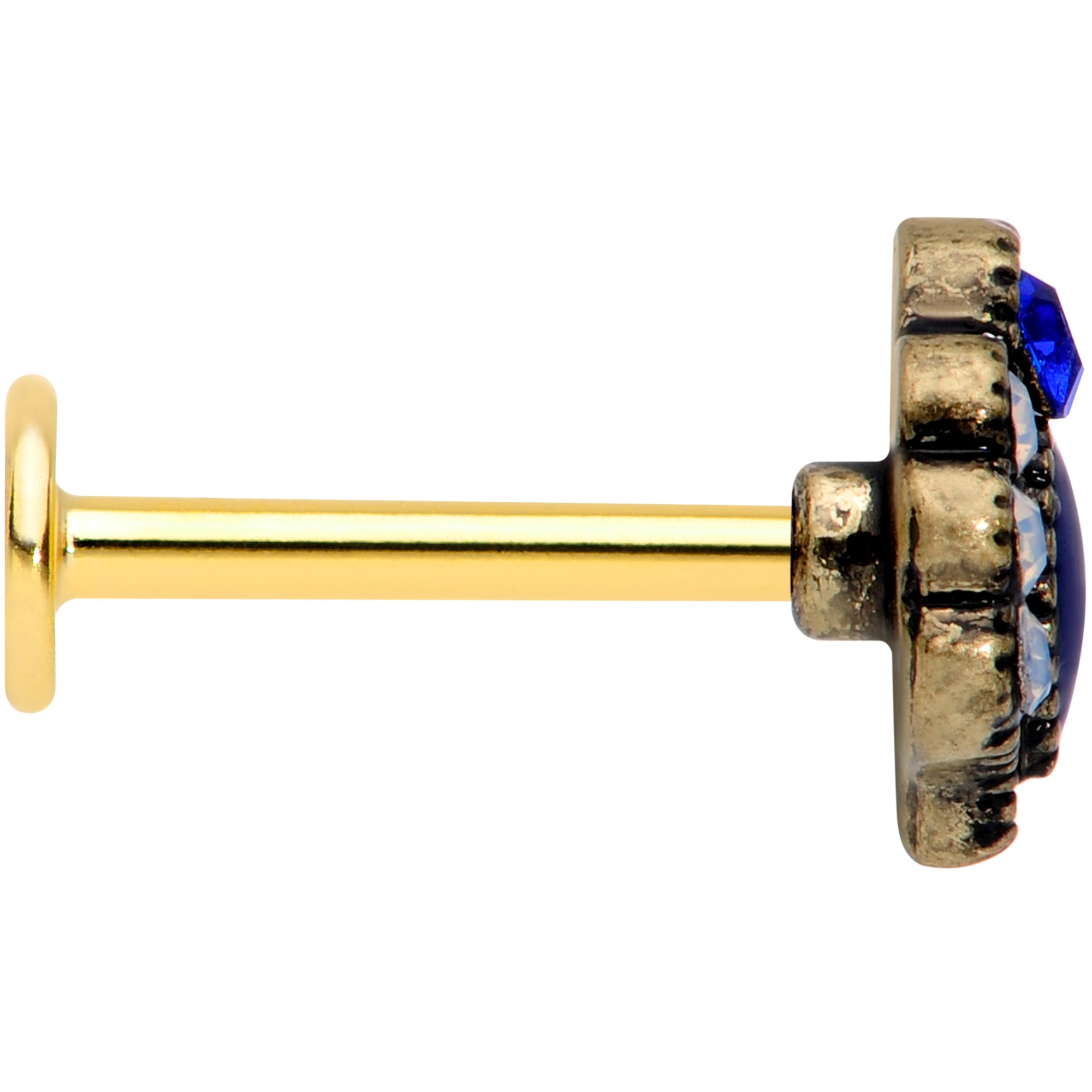 Get timeless style on very modern jewelry with this 16 gauge lip ring! It's made with an 8mm gold tone PVD over 316L surgical grade stainless steel straight barbell with a flat disc end. It features a blue gem charm, with one gem shaped like a teardrop and the other round. The charm is embellished with clear gems along the side for a look that's opulent but not overwhelming. You can even wear it in multiple piercings including lip, monroe, tragus, helix, and some conch piercings. Take your cartilage piercing back in time with this gorgeous, antique-inspired cartilage jewelry!