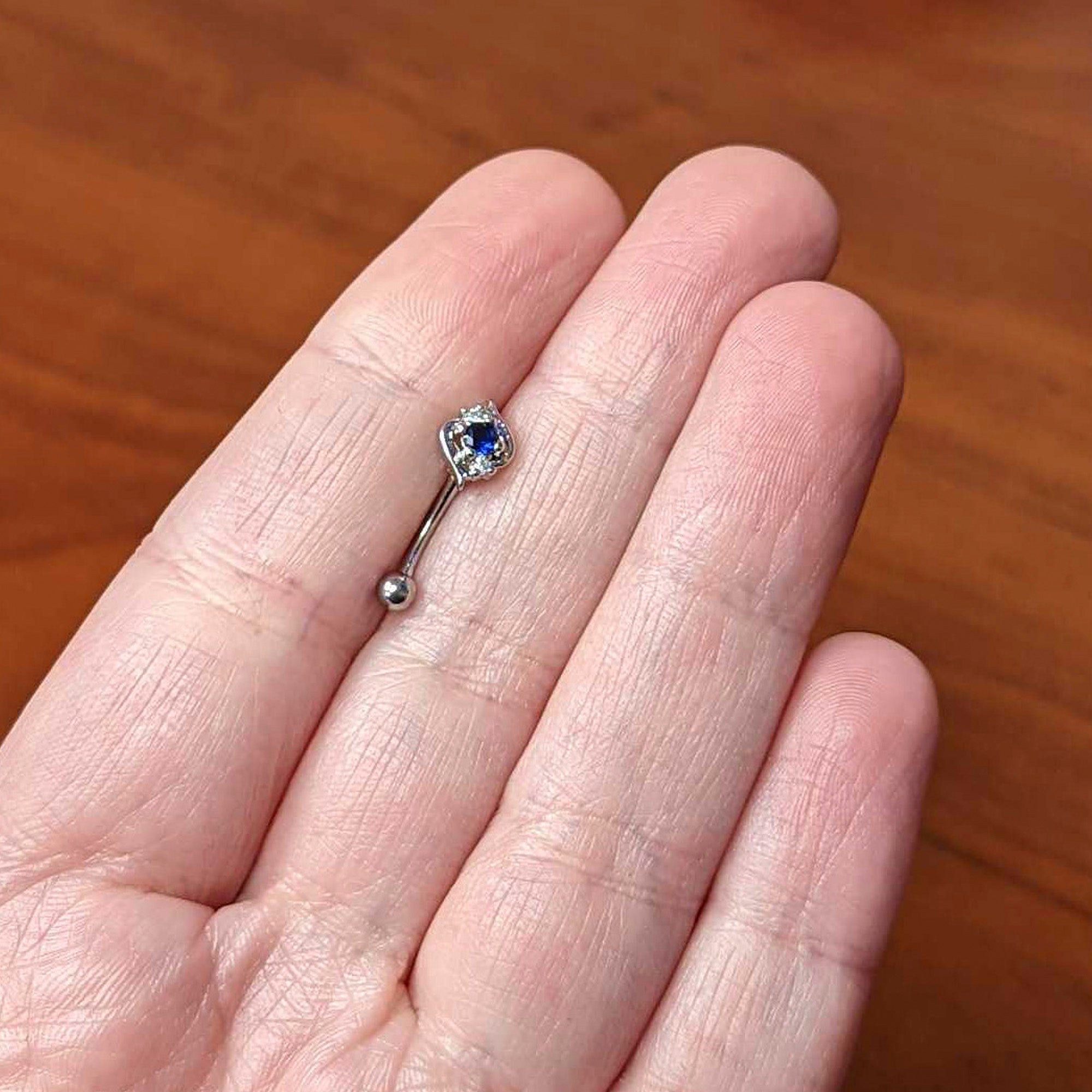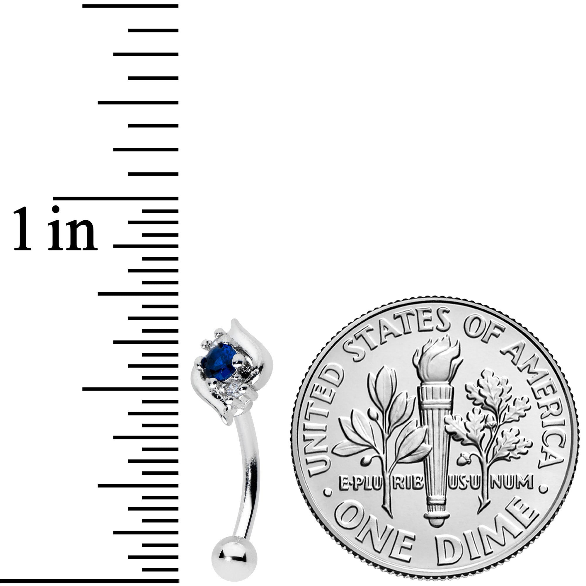 The simple elegance of this 16 gauge eyebrow ring will make your head swirl! It's made with an 8mm durable 316L surgical grade stainless steel curved barbell with a 3mm bottom ball end. The top end features a swirl charm, set with a large deep blue gem oval at the center. The swirl portion is embellished with clear gems for an added touch of style. You can even rock it in multiple piercings including tragus, rook, and eyebrow piercings. Add a swirl of sexy style to your cartilage piercing with this seductive swirl cartilage jewelry!