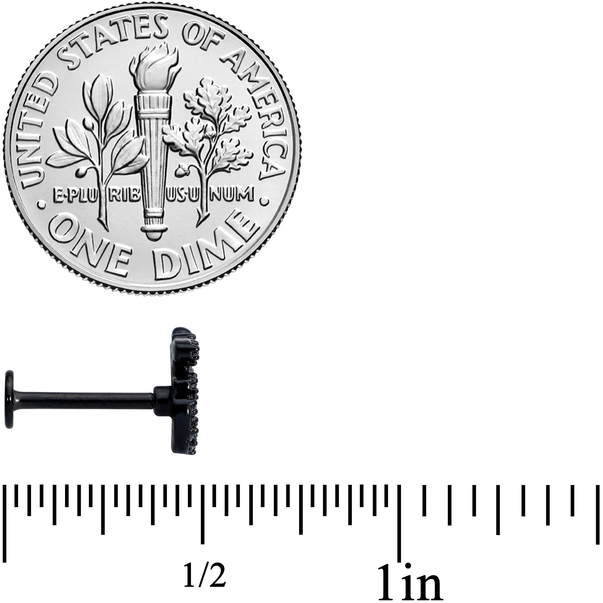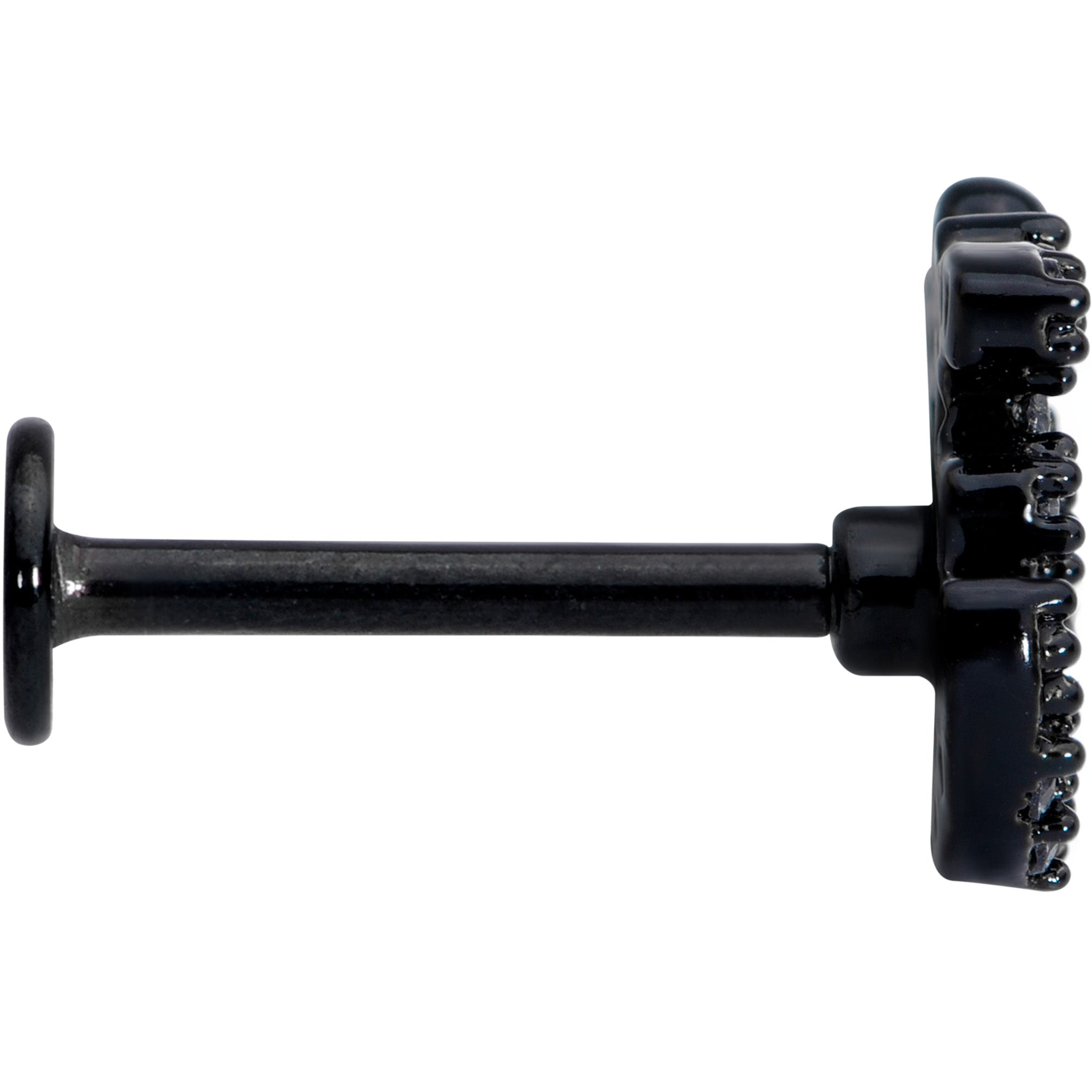 Om my goodness, that 16 gauge lip ring looks gorgeous! It's made with an 8mm black PVD over 316L surgical grade stainless steel straight barbell with a flat disc end. It features a charm of the Indian word OM. The om is completely paved in small clear cubic zirconia gems, giving it a look that mixes the spiritual with the sumptuous. And you can show it off in multiple piercings including your lip, monroe, and cartilage piercings like the tragus, and helix, some conch piercings. Whether you'd rather relax in a spa or a yoga studio, you can be sure your cartilage piercing looks om-mazing!