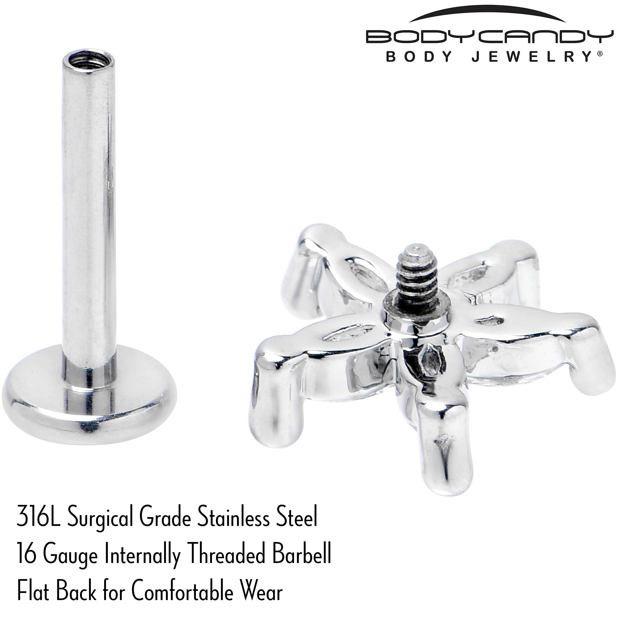 Your piercings will blossom with this 16 gauge lip ring in it. It is made with an 8mm durable 316L surgical grade stainless steel straight post with a flat disc end. It features a flower charm composed of clear cubic zirconia gem petals with raised embellishment. It also features an internally threaded design for maximum comfort on insertion and removal and you can rock it in multiple piercings including lip, monroe, tragus, helix, and some conch piercings. This pretty flower will make your look bloom with this fabulous, floral cartilage piercing jewelry.