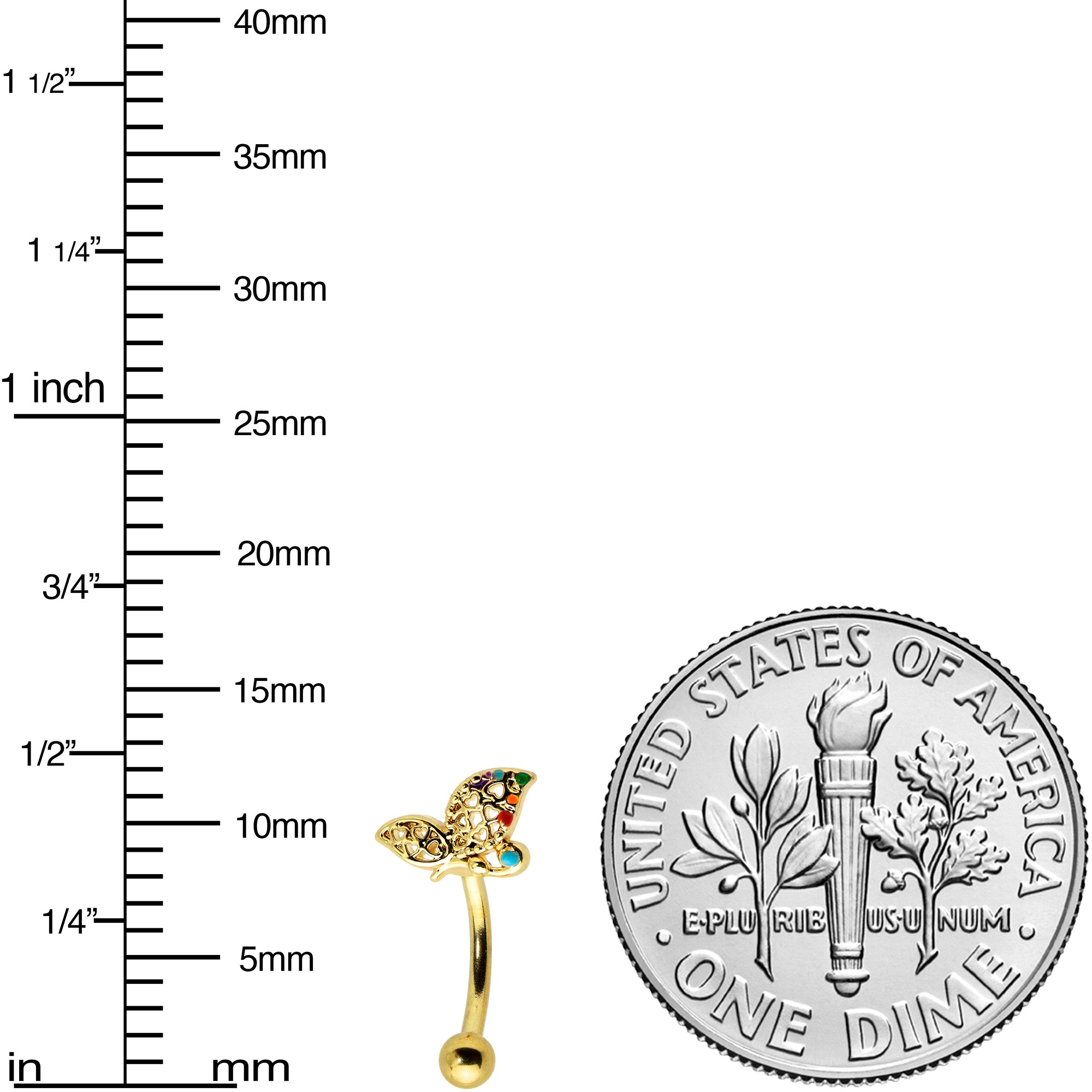 Fall in love with your piercings when you're rocking this 16 gauge cartilage jewelry! It's made with an 8mm gold tone PVD over 316L surgical grade stainless steel curved barbell with a 3mm ball end. The top end features a butterfly charm. The butterfly features hearts within its openwork wings, embellished with clear cubic zirconia gems and color inlays in red, green, blue, and more! You can even rock this butterfly in multiple piercings including eyebrow, rook, and tragus piercings. This cartilage ring is sure to steal your heart!