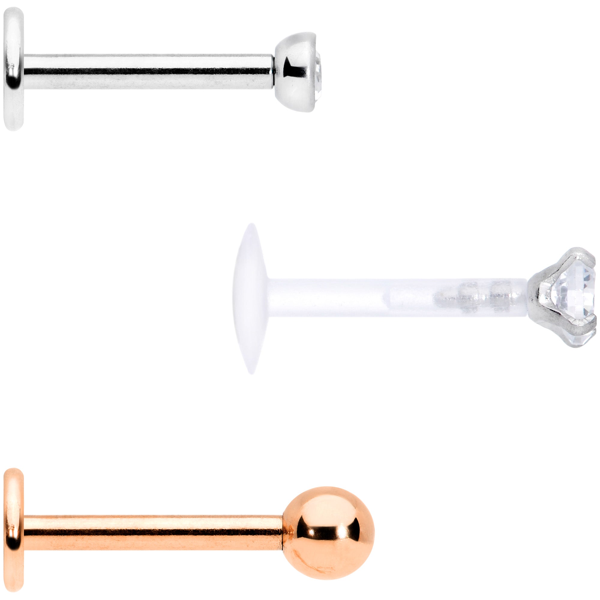 From simple to stylish, this set of 16 gauge lip rings has something for everyone. You get one tragus earring made with an 8mm rose gold tone PVD over 316L surgical grade stainless steel straight barbell with a 3mm ball end. You get one labret piercing made with an 8mm durable 316L surgical grade stainless steel straight barbell with a clear gem set into the ball end. The third monroe piercing is made with an 8mm flexible Bioplast straight barbell and has a clear cubic zirconia gem set into the top. This gives you the comfortable fit you need with the glamorous look you crave! Best of all, these work well in multiple piercings including lip, monroe, and cartilage piercings including tragus, helix, and conch piercings. With so many options, you'll want to get more piercings to wear these in! Sold as a set of three.