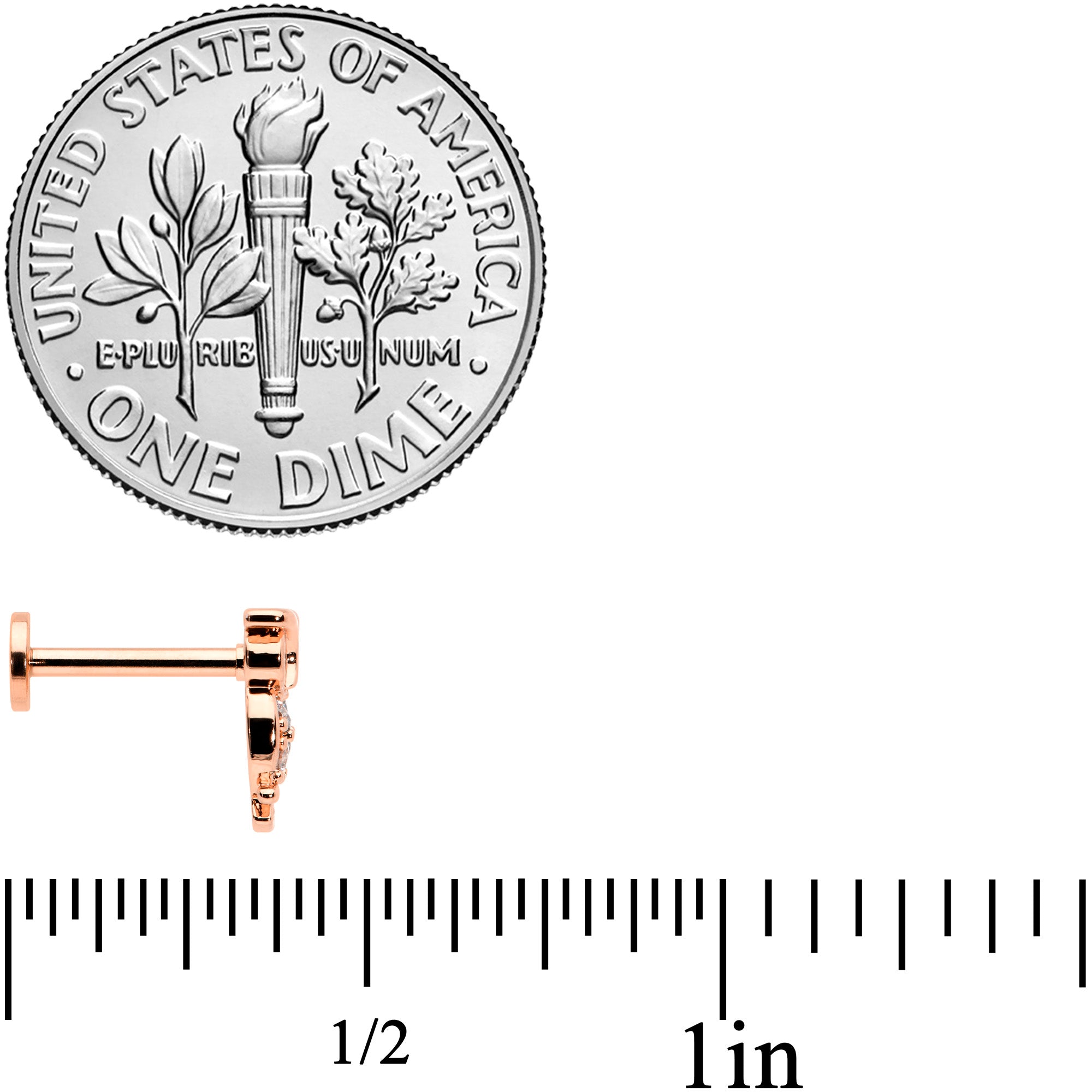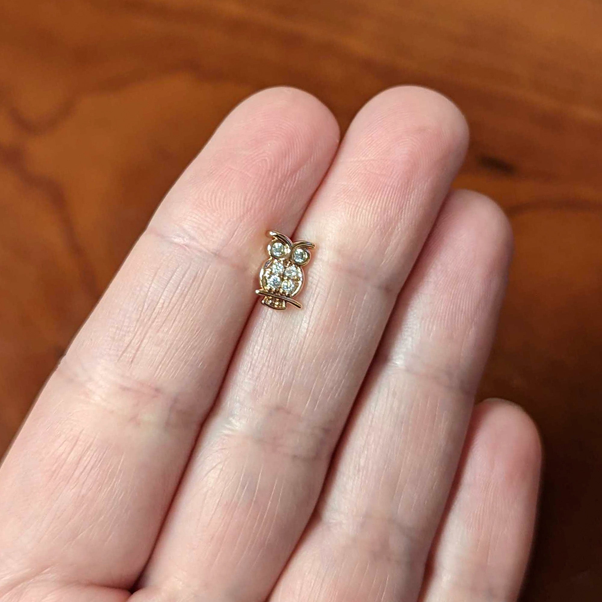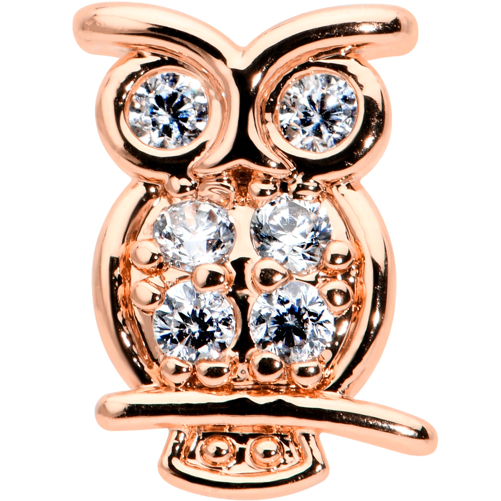 You'll definitely give a hoot about this 16 gauge lip ring! It's made with an 8mm rose gold tone PVD over 316L surgical grade stainless steel straight barbell, It features an owl charm, with simple detailing of the eyes and the branch it's perching on. The owl is paved with clear cubic zirconia gems for an added bit of style. It also features an internally threaded design for added comfort during insertion and removal and can be worn in multiple piercings including lip, monroe, tragus, helix, and some conch piercings. This cartilage piercing jewelry is both wise and wonderful!