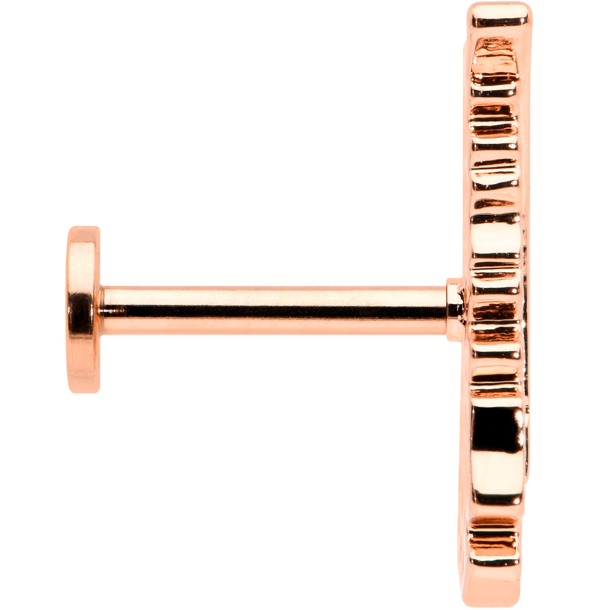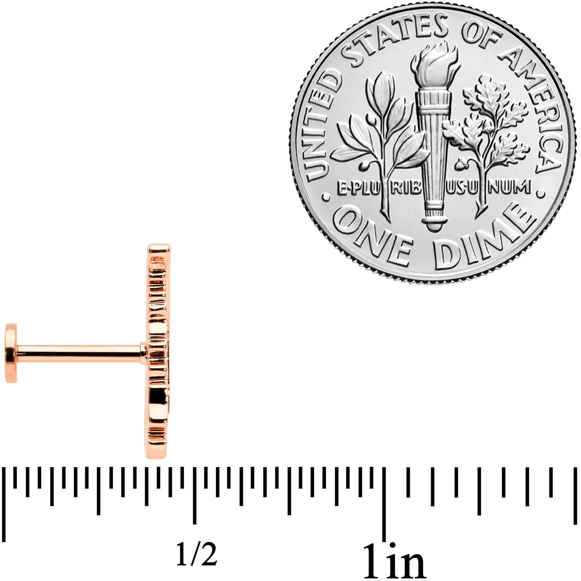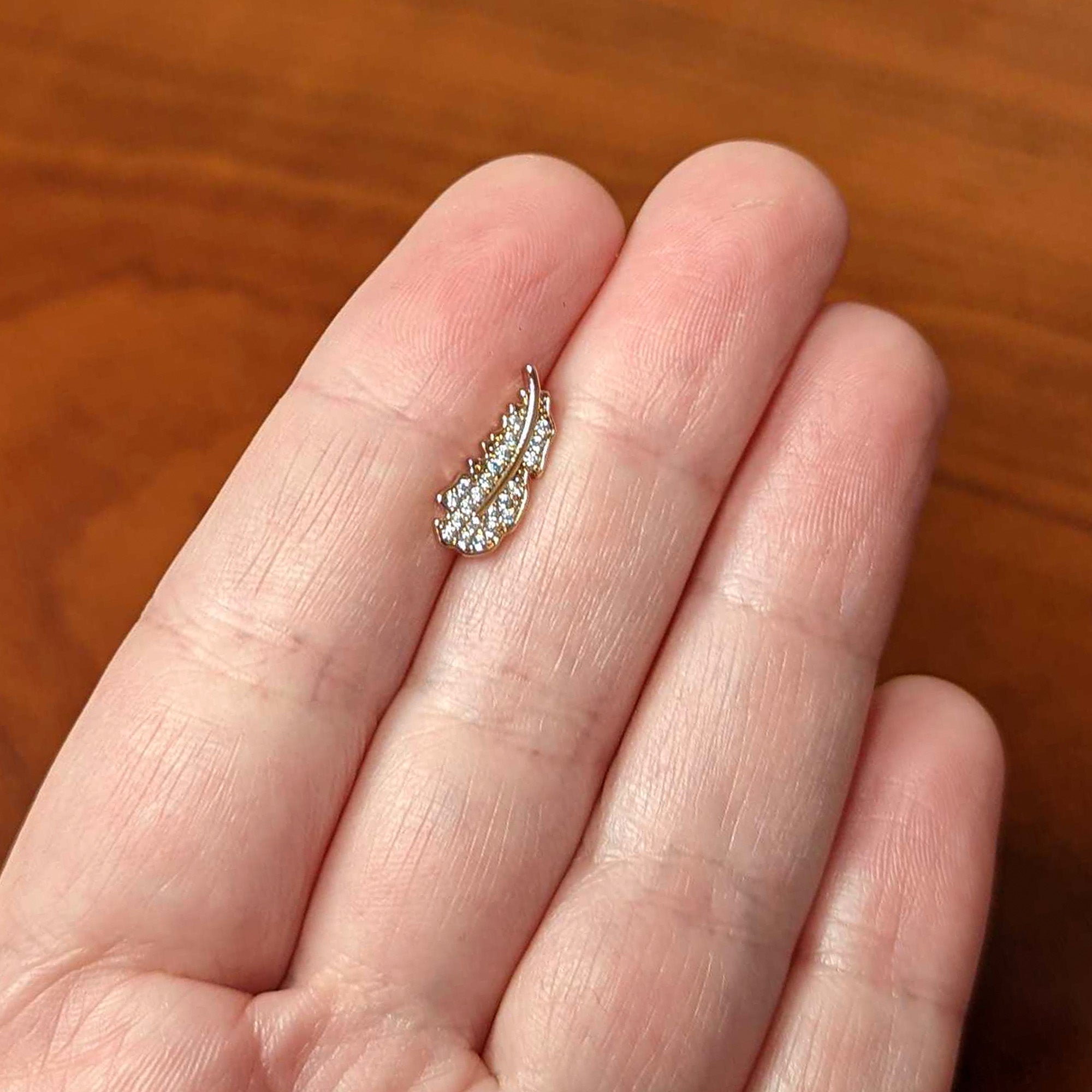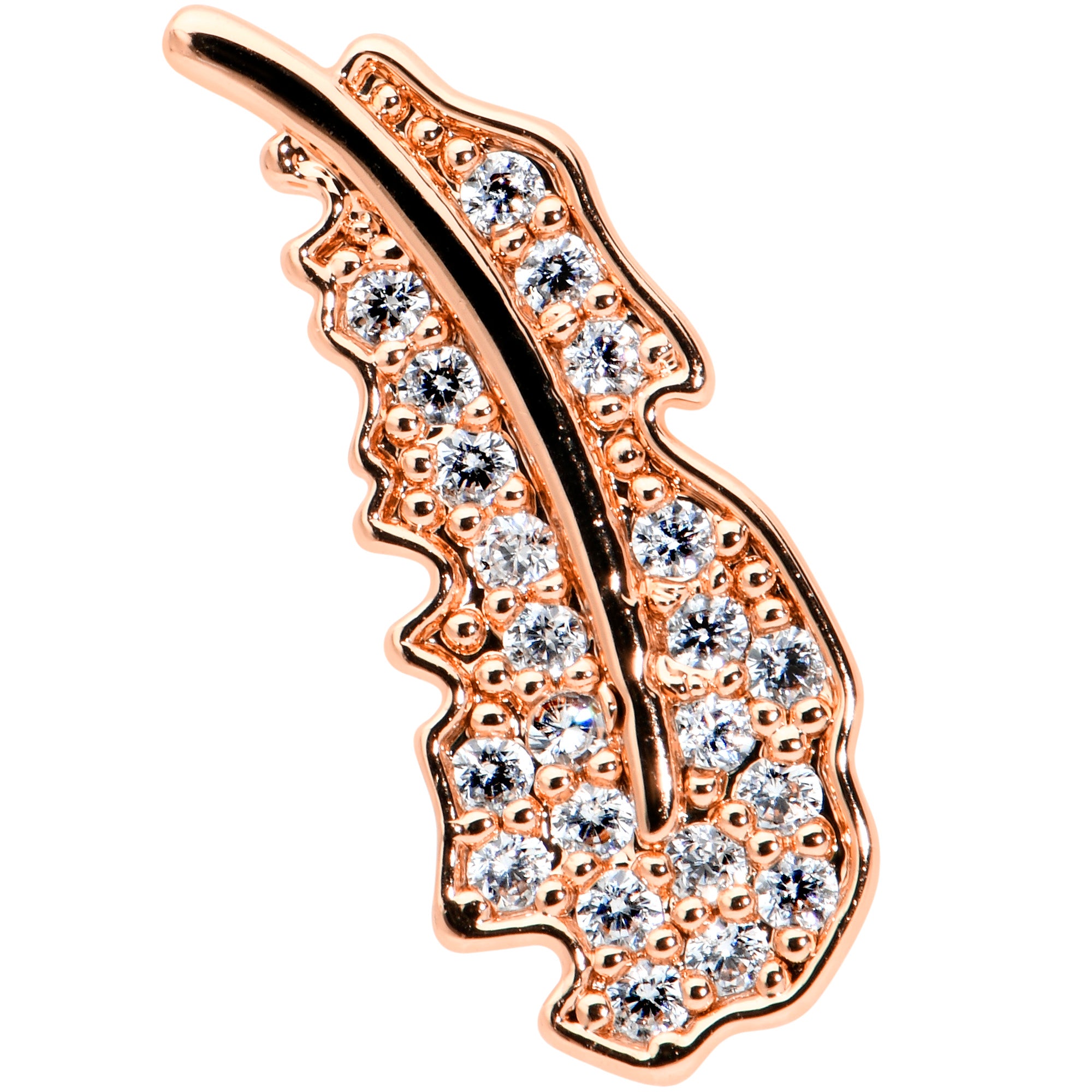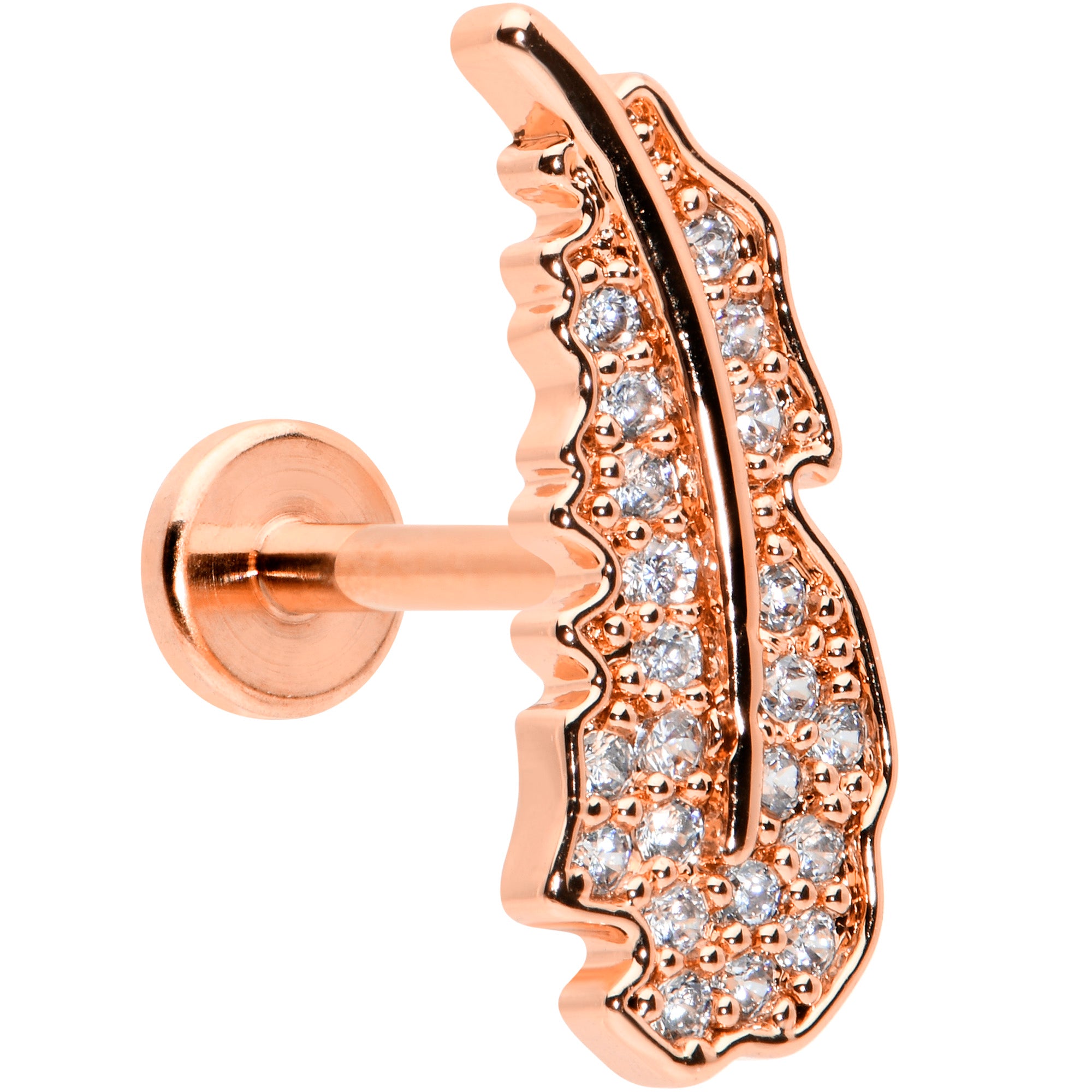 Get a look that makes your heart soar like on this 16 gauge lip ring! It's made with an 8mm rose gold tone PVD over 316L surgical grade stainless steel straight barbell with a flat disc end. It features a feather charm, with raised central detailing. It's paved in clear cubic zirconia gems for an opulent look that's not going to weigh you down. It's also internally threaded for comfort and ease during insertion and removal and you can rock it in multiple piercings including lip, monroe, tragus, helix, and some conch piercings. Let your piercings soar on wings of style with this fabulous feather cartilage jewelry.