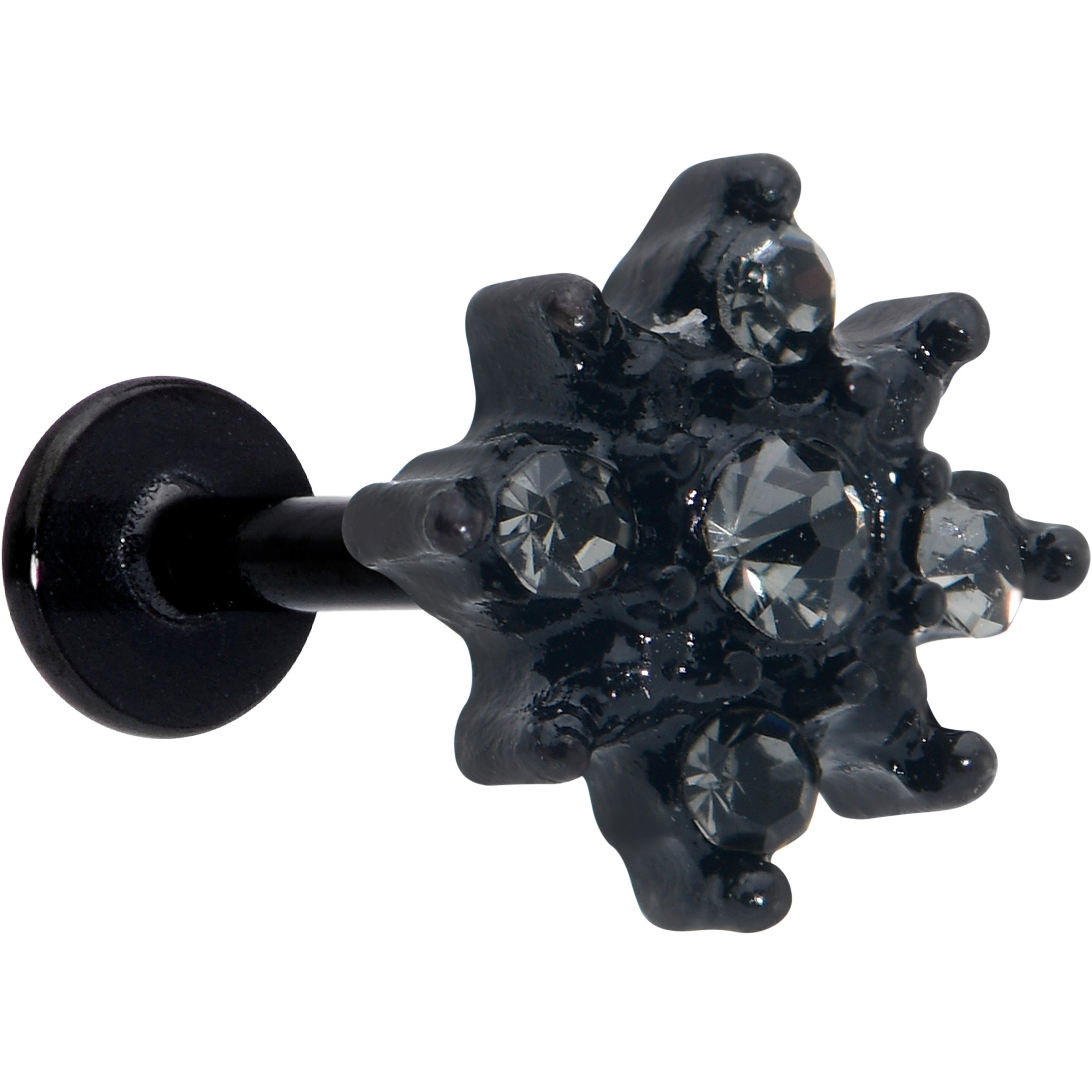 Fall in love with a goth new look, like on this 16 gauge lip ring. It is made with an 8mm black PVD over 316L surgical grade stainless steel straight post with a flat disc end. It features a floral charm, with a clear gem center. It is further embellished with textured detailing and more clear gems for added style that you can rock in multiple piercings including lip, monroe , tragus, helix, and some conch piercings. Let your inner goth come out to play with this darkly divine cartilage piercing ring.