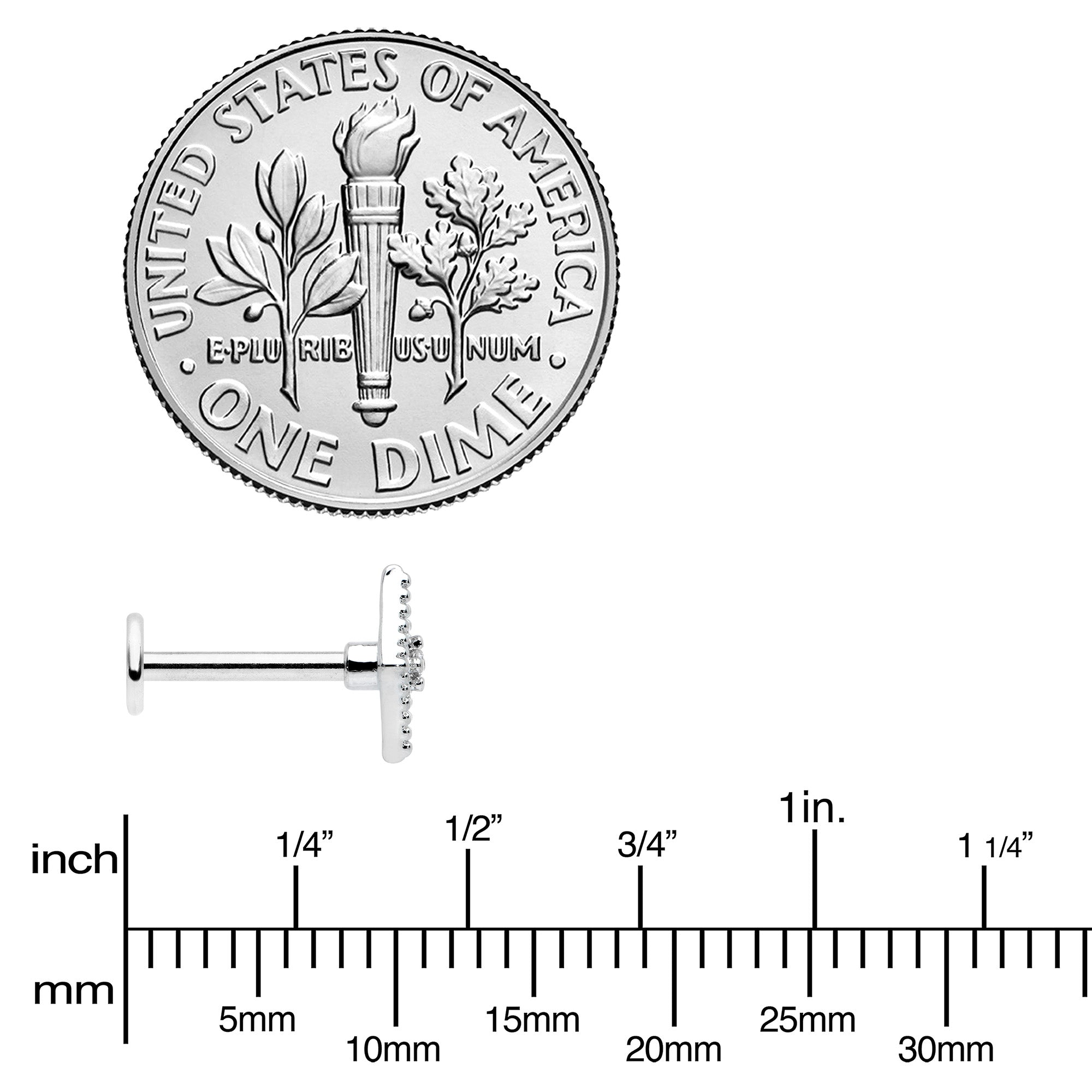 You get classic elegance with a modern twist with this 16 gauge lip ring! It's made with an 8mm durable 316L surgical grade stainless steel straight post with a flat disc end. It features a stylized rhombus charm, set with a clear gem at the center. The rhombus is further embellished with textured detailing for a look that really pops! You can even rock it in multiple piercings including lip, monroe, tragus, helix, and some conch piercings. Give your cartilage piercing classic style with this Deco-inspired tragus jewelry!