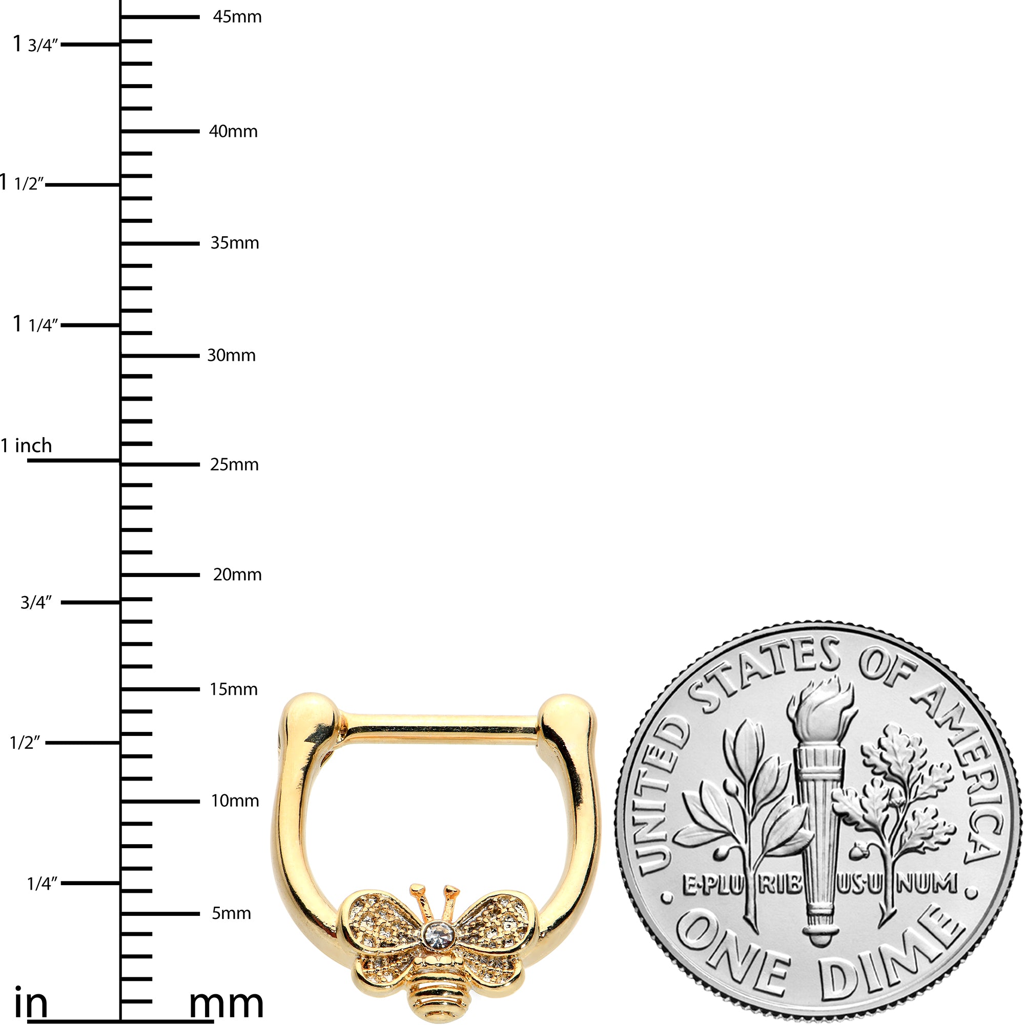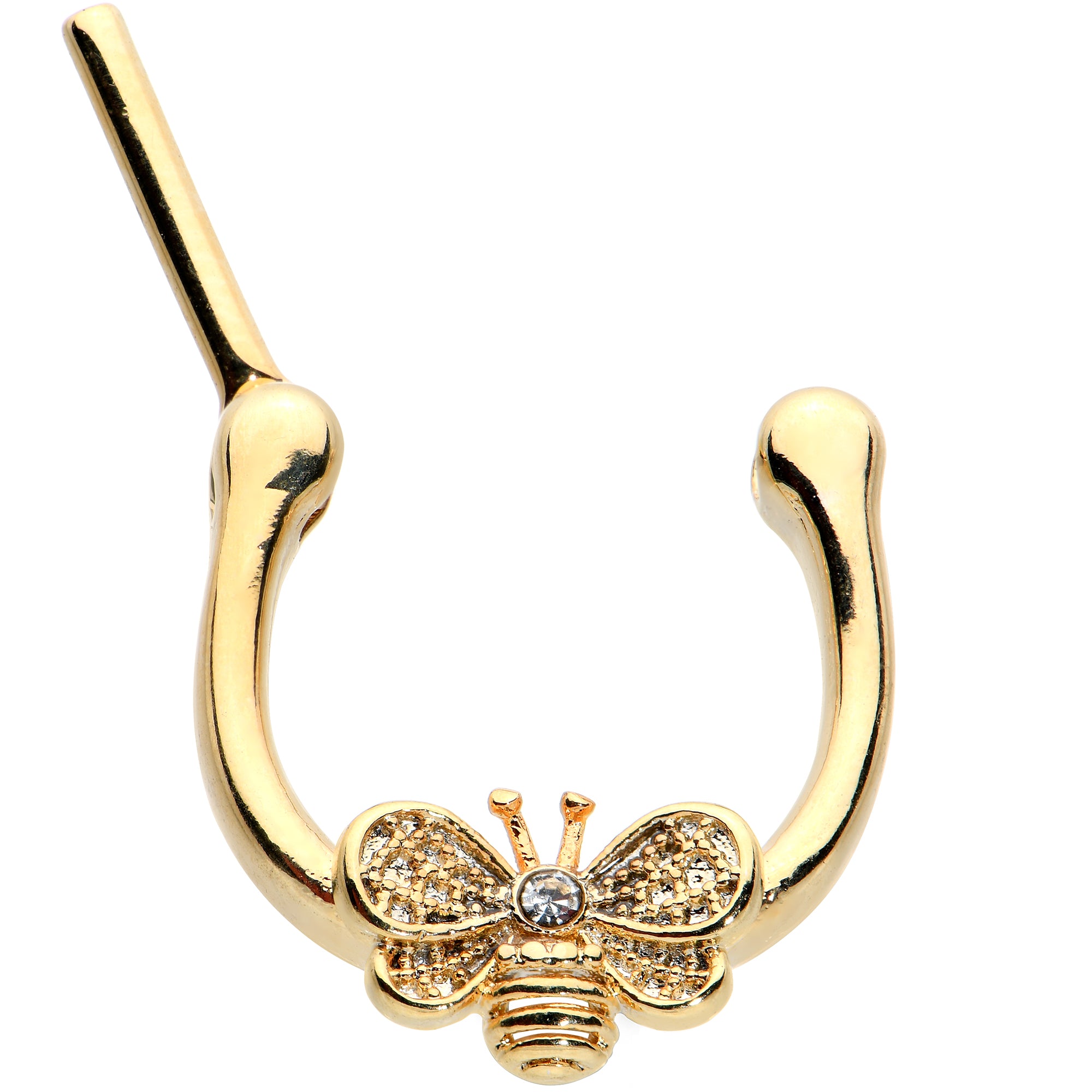 This 16 gauge septum ring is sure to bee-utify your cartilage piercings! It's made with an 8mm gold tone PVD over 316L surgical grade stainless steel hinged straight barbell. It features a bee charm with understated detailing, embellished with a tiny clear gem set at the head. The bee also features openwork wings for a cohesive and airy appearance. It also features a hinged, clicker design that makes insertion and removal a snap! You can even boast this bee in multiple piercings including tragus, helix, and other cartilage piercings. This understated insect jewelry is sure to bee your favorite cartilage ring!