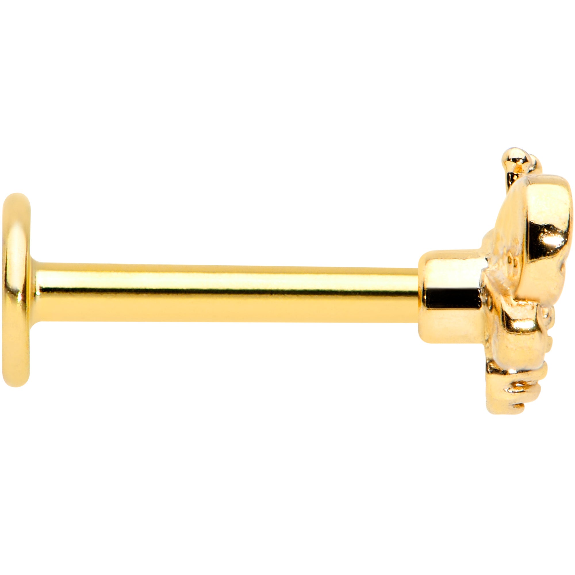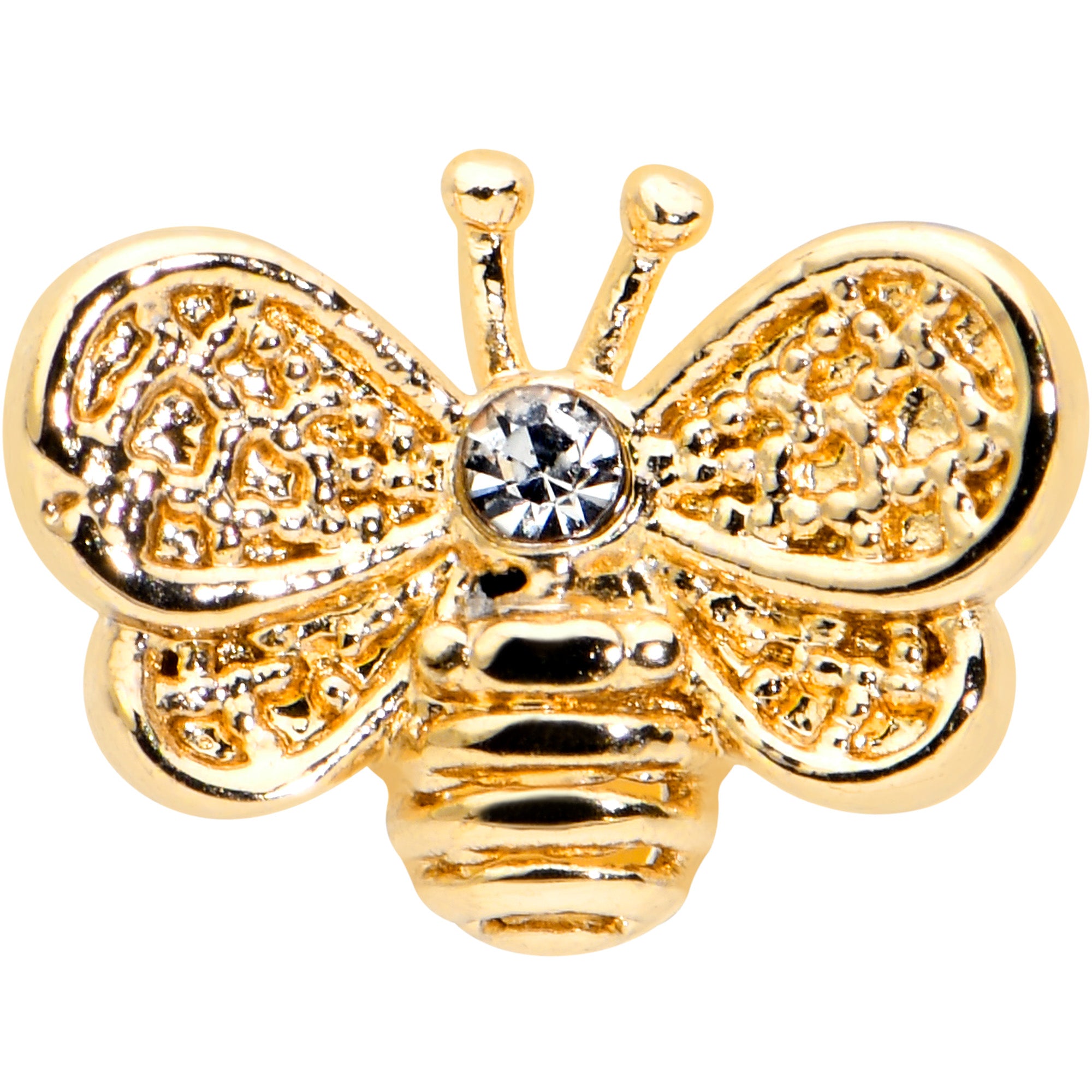 This 16 gauge lip ring is sure to bee-utify your cartilage piercing! It's made with an 8mm gold tone PVD over 316L surgical grade stainless steel straight barbell with a flat disc end. It features a bee charm with understated detailing, embellished with a tiny clear gem set at the head. The bee also features openwork wings for a cohesive and airy appearance. You can even boast this bee in multiple piercings including lip, monroe, tragus, helix,and some conch piercings. This understated insect jewelry is sure to bee your favorite cartilage piercing ring!