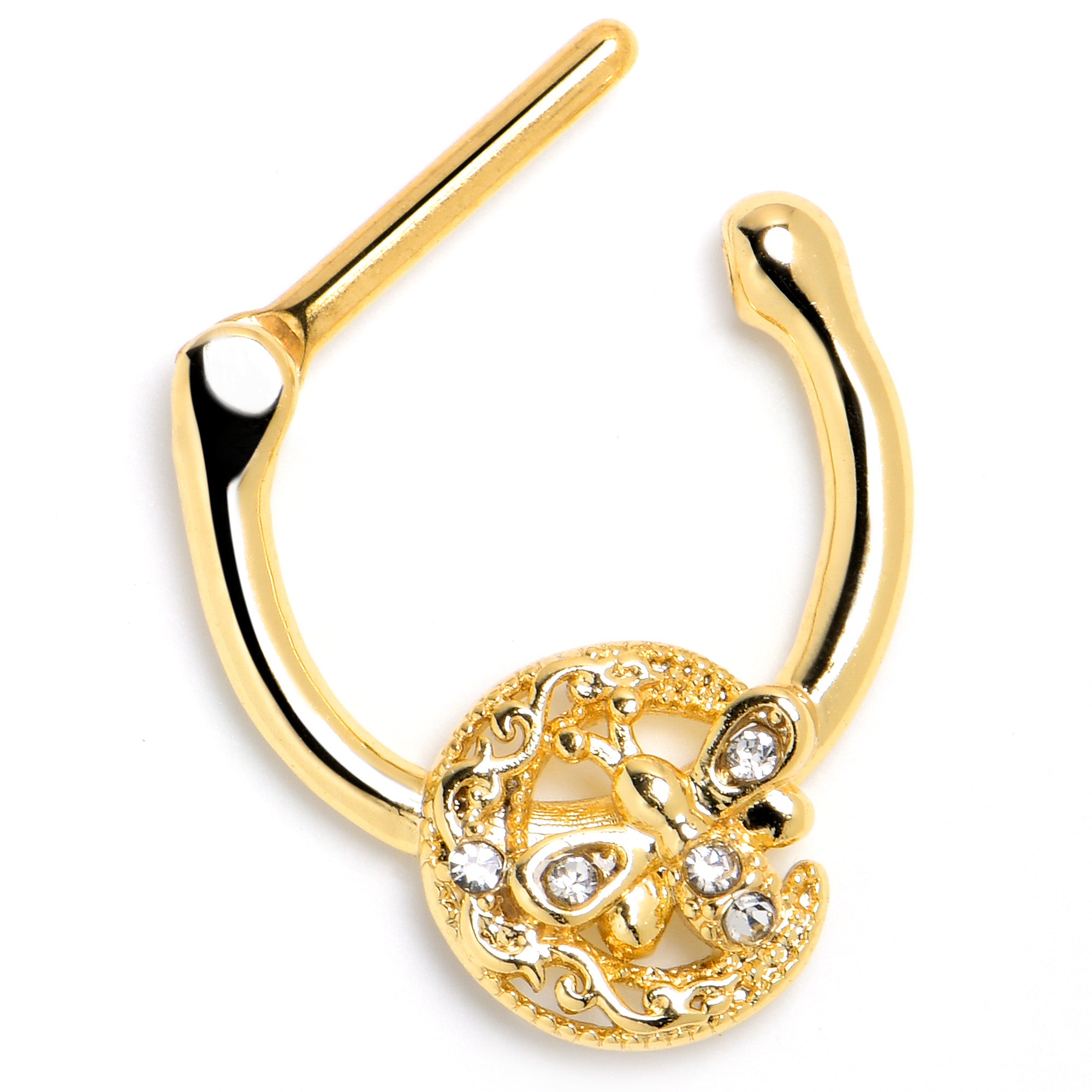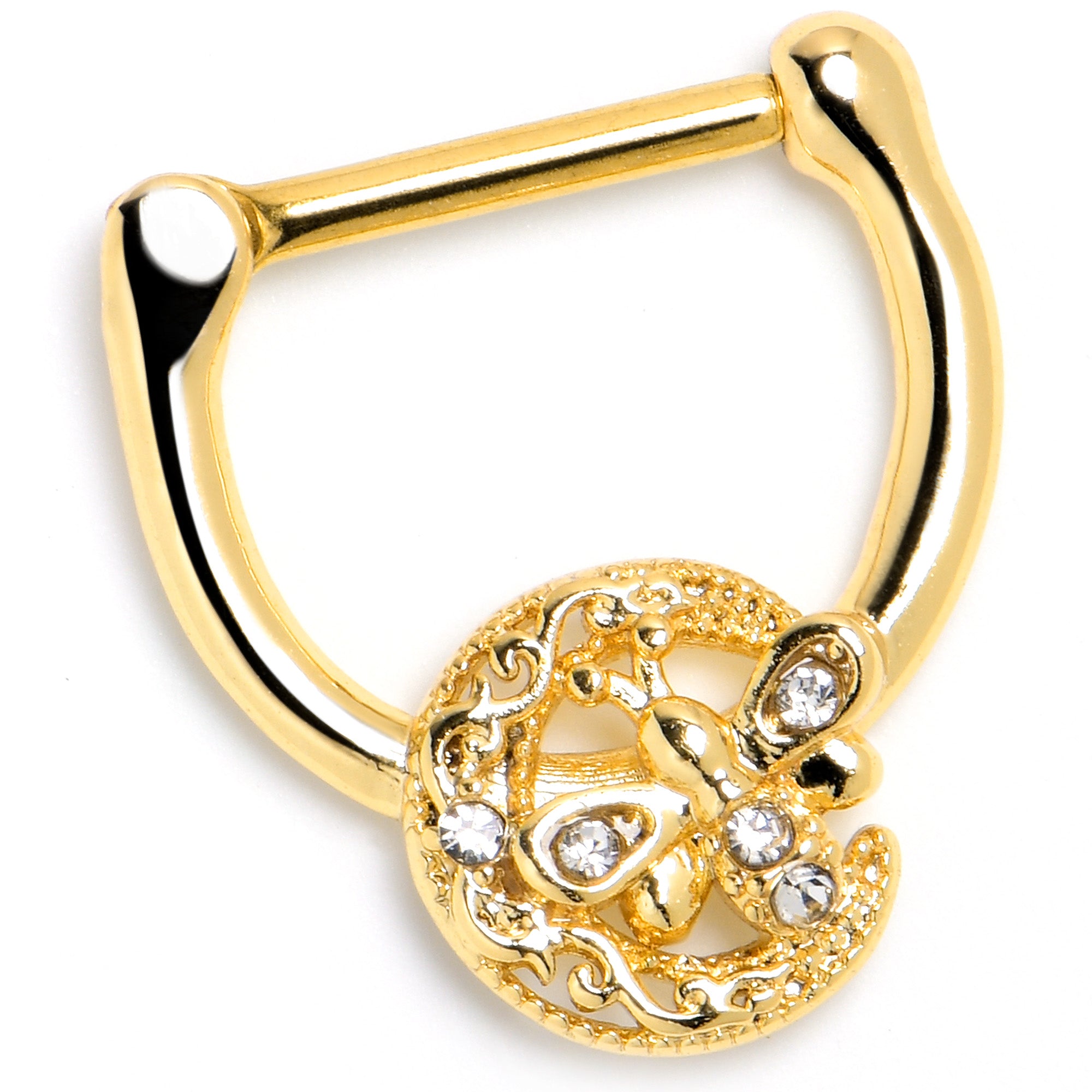 This crescent moon may be alone in the sky but it's got a friend on this 16 gauge septum ring. It is made with an 8mm gold tone plated over 316L surgical grade stainless steel hinged straight barbell. It features a crescent moon charm, embellished with filigree detailing giving it an airy appearance as well as a clear gem embellishment. Set between the points of the moon is a dragonfly charm, with clear gems in the wings and body. It also features a hinged, clicker design that makes insertion and removal a snap and you can rock it in multiple piercings including tragus, helix, and some conch piercings. You'll want this cartilage piercing jewelry to keep you company forever.