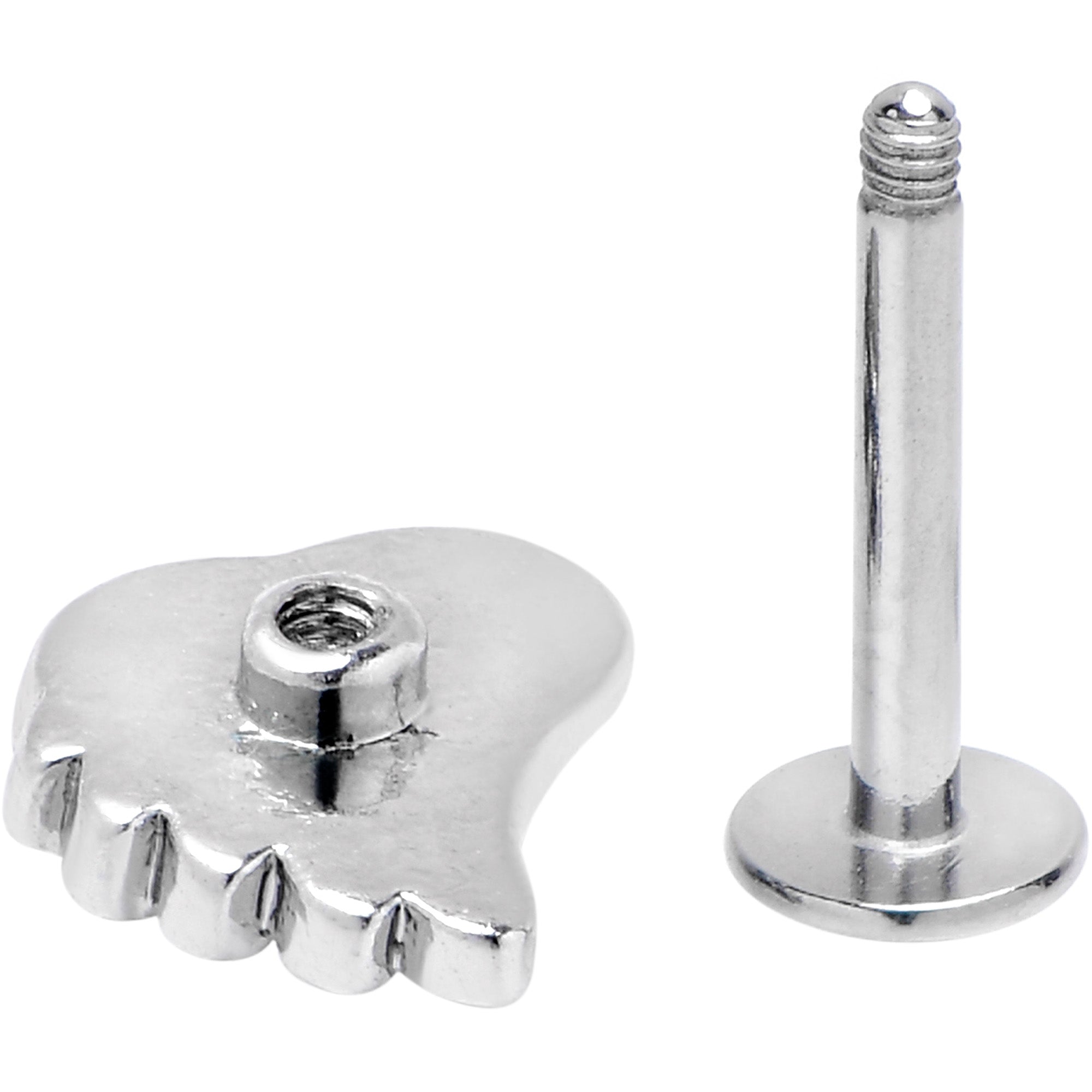 Give yourself a heavenly new look with this 16 gauge lip ring. It's made with an 8mm durable 316L surgical grade stainless steel straight post with a flat disc end. It features a heart shaped charm featuring an angel's wings, with one side paved with clear gems. The other side features pink inlay and simply styled feather details and you can rock it in multiple piercings including lip, monroe, tragus, helix, and some conch piercings. Let your look and your spirit soar with this stylish and spiritual cartilage piercing jewelry.