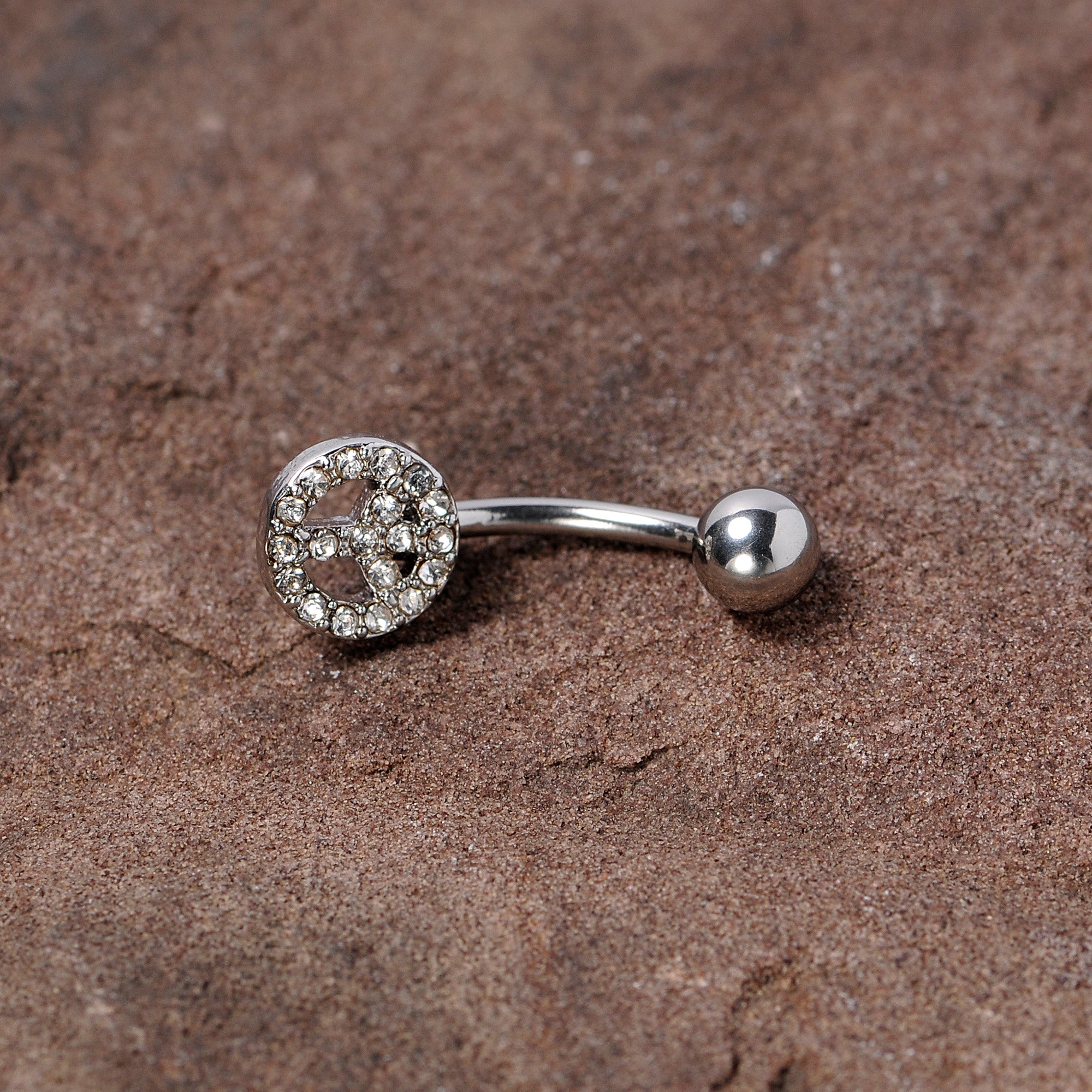 Why make war when peace looks this good? This 16 gauge eyebrow jewelry is 8mm and made with a 316L surgical grade stainless steel curved barbell with a 4mm bottom ball end. It features a peace sign charm paved in clear gems for a look that mixes politics with panache. And because peace is contagious, this peace sign body jewelry works well in multiple piercings including your eyebrow as well as cartilage piercings like the rook, tragus, and helix. This cartilage earring is sure to make you a happy hippie!