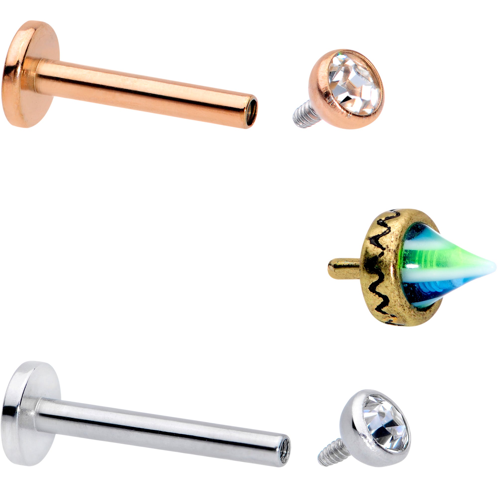 Get a little bit of everything with this set of 16 gauge, 8mm lip rings! The first one is made with a rose gold tone PVD over 316L surgical grade stainless steel straight barbell with a flat disc end, and features a clear gem set into the top for an elegant look. The second one is made with a 316L surgical grade stainless steel straight barbell with a flat disc end and a clear gem set into the top for a look of simple glamour. The third one is made with a flexible Bioplast straight barbell with a flat disc end and a colorful cone-shaped end for a fit that's colorful and comfortable. Have a look for every occasion with this stunning selection of cartilage jewelry! Sold as a set of three.