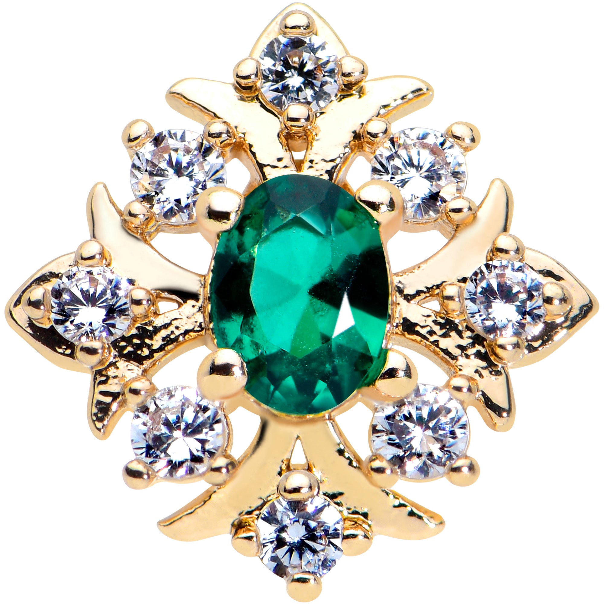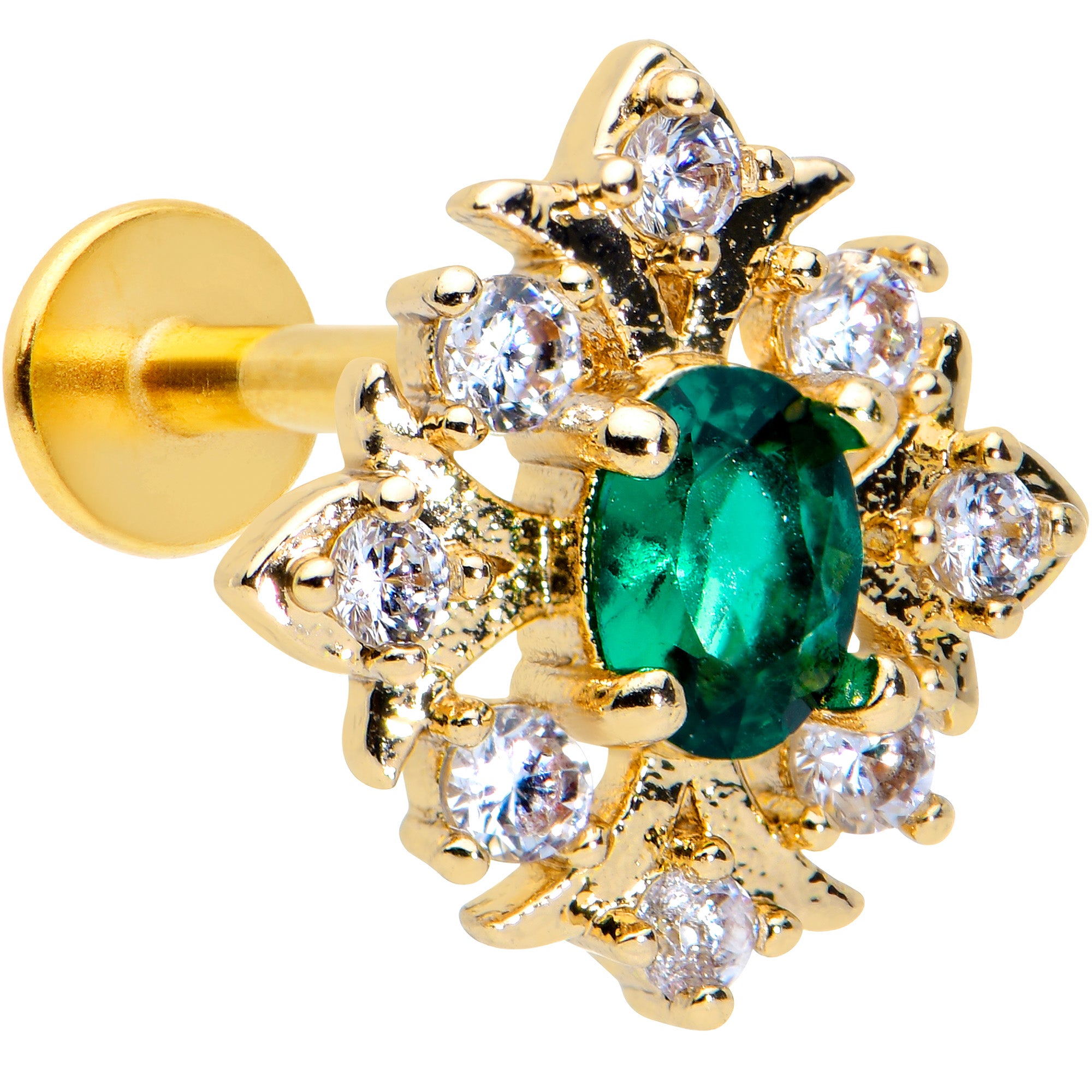 Take your cartilage piercings back in time with this antique-inspired 16 gauge lip ring! It's made with an 8mm gold tone PVD over 316L surgical grade stainless steel straight barbell with a flat disc end. It features a large, oval green gem charm, set in a stylized rhombus that's embellished with clear gems for an elegantly retro appearance. You can even rock this rhombus in multiple piercings including lip, monroe, tragus, helix, and some conch piercings. Give an antique-inspired look to a modern piercing with this Art Deco styled cartilage jewelry!