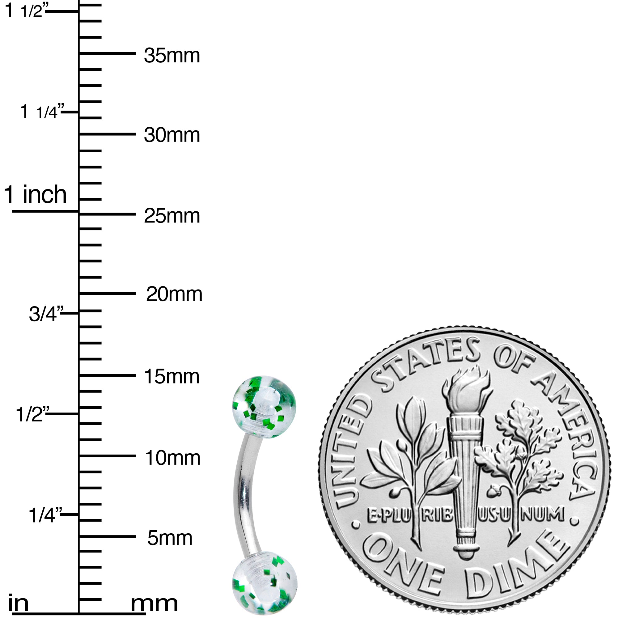 Simple can be stunning with this 16 gauge cartilage jewelry! It's made with an 8mm durable 316L surgical grade stainless steel curved barbell with 4mm ball ends. The ball ends are clear and feature green glitter inside for a look that turns basic to beautiful! You can wear this in multiple piercings including eyebrow, rook, and tragus too! Keep it basic without looking boring with this charming curved eyebrow ring!
