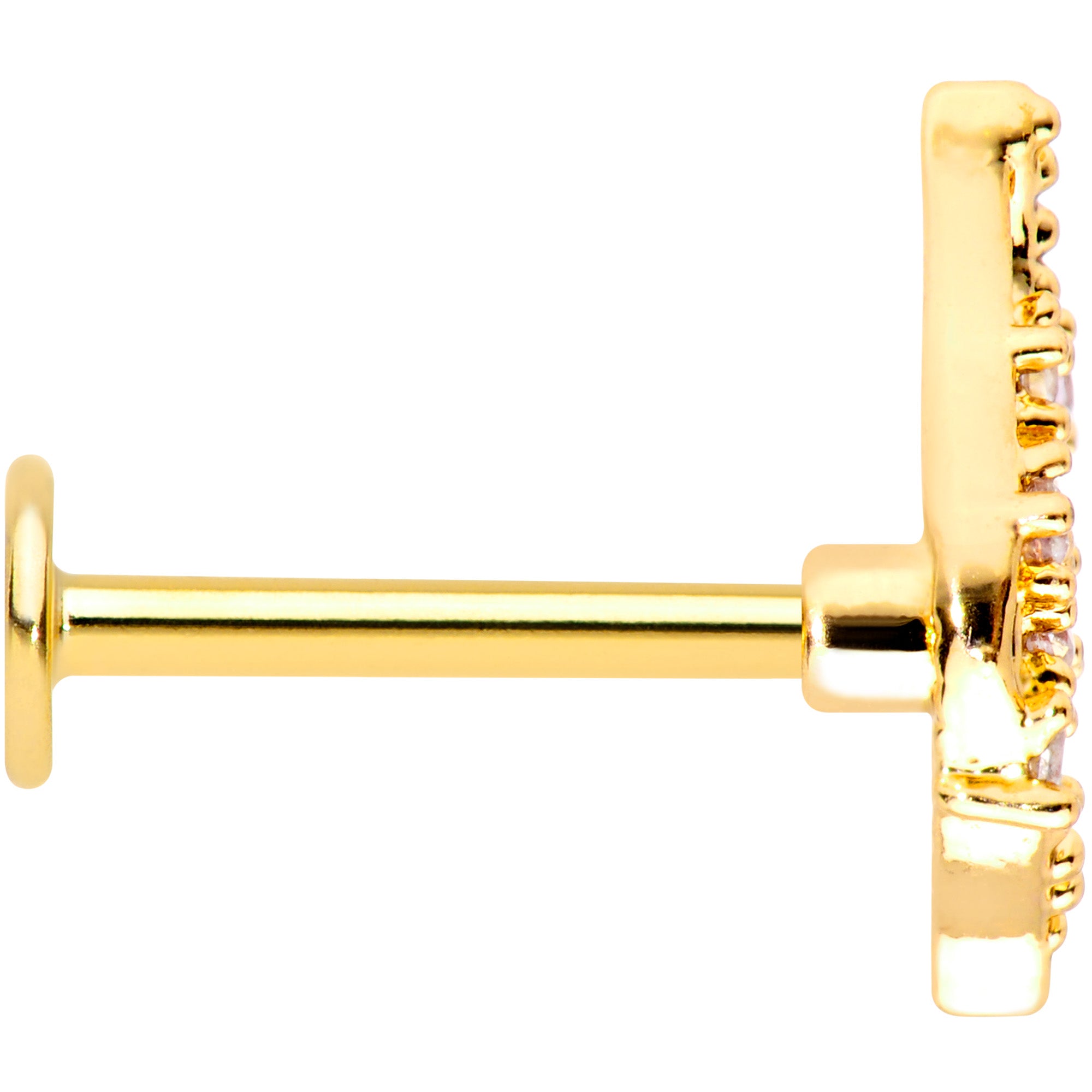 Spread your wings with this 16 gauge lip ring! It's made with an 8mm gold tone PVD over 316L surgical grade stainless steel straight barbell with a flat disc end. It features a wings charm, with intricate detailing and set with tiny clear gems. At the edge of the wing are small pink gems, for an elegantly eye-catching color contrast. You can even wear this wing in multiple piercings including lip, monroe, tragus, helix, and some conch piercings. Let your cartilage piercings soar with this elegantly styled tragus jewelry!