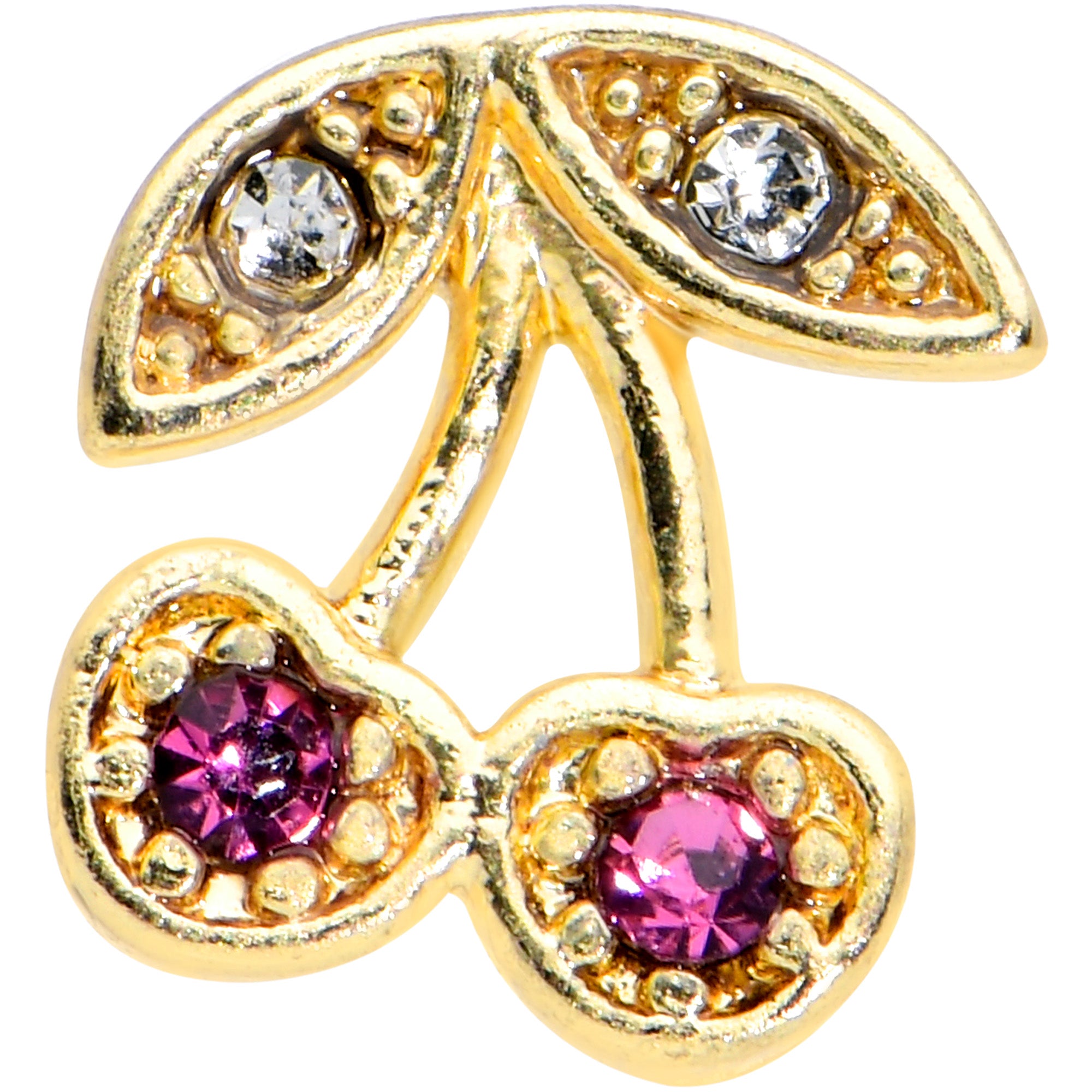 Give your cartilage piercing a look that's absolutely delicious with this sweet 16 gauge lip ring! It's made with an 8mm gold tone PVD over 316L surgical grade stainless steel straight barbell with a flat disc end. It features a cherry charm. They feature a pair of leaves, set with clear gems. Beneath the leaves are two stems, each ending with a cherry which are set with purple gems for a realistic appearance. You can even rock it in multiple piercings including lip, monroe, tragus, helix, and some conch piercings! Your cartilage piercing will be looking very cherry indeed with this sweet fruit-themed cartilage jewelry!
