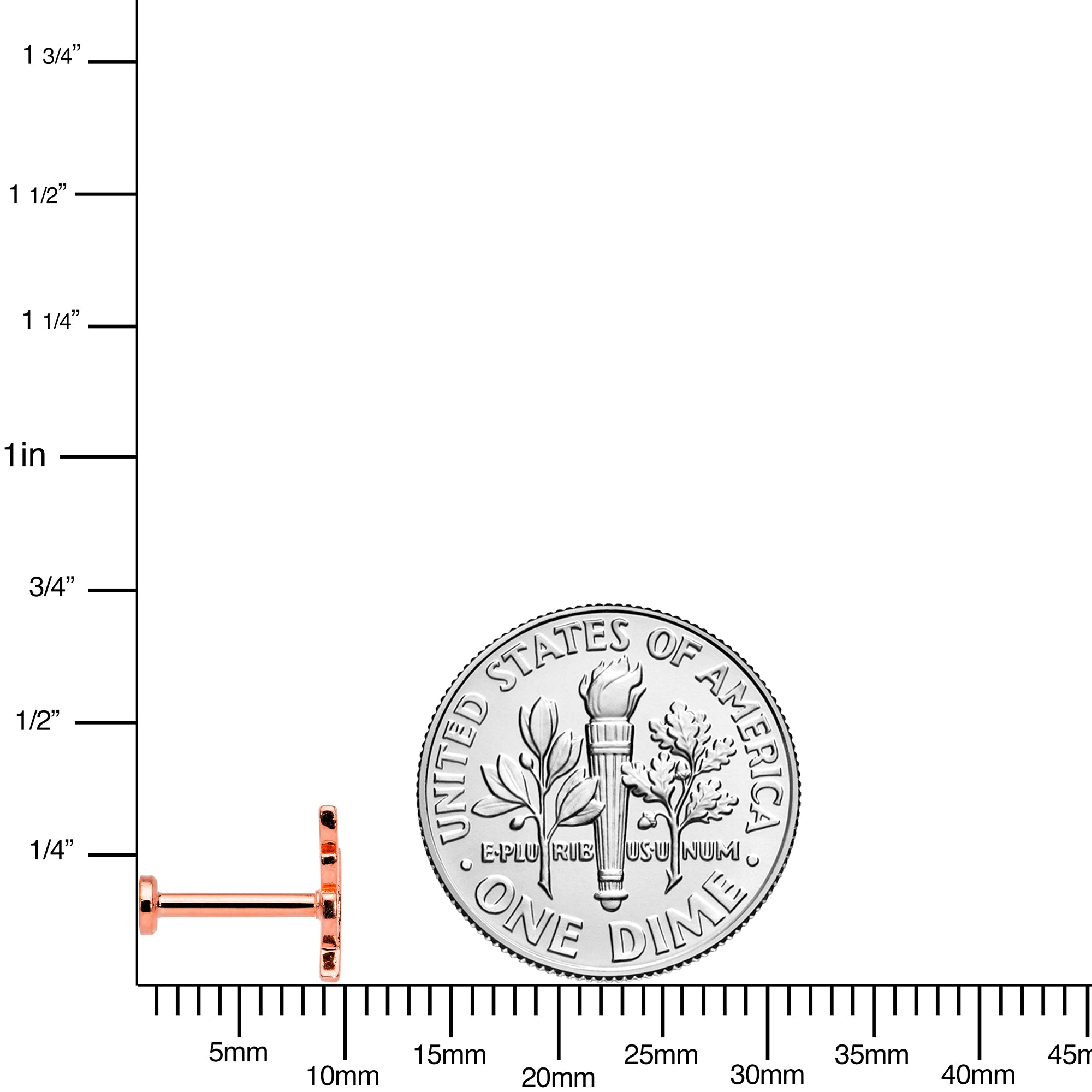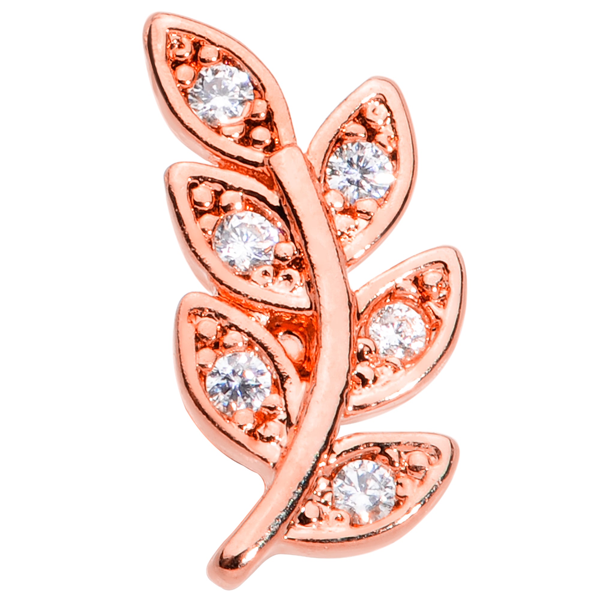 You'll never want this 16 gauge lip ring to leaf your piercings! It's made with an 8mm rose gold tone plated over 316L surgical grade stainless steel straight barbell with a flat disc end. It features an internally threaded top end for maximum comfort while inserting or removal. The top end features a leafy branch, set with clear cubic zirconia gems and lightly textured detailing for a look that never gets lost in the crowd. You can even wear this branch in multiple piercings including labret, monroe, tragus, helix, and some conch piercings. Branch out and add some arboreal style to your cartilage piercings!