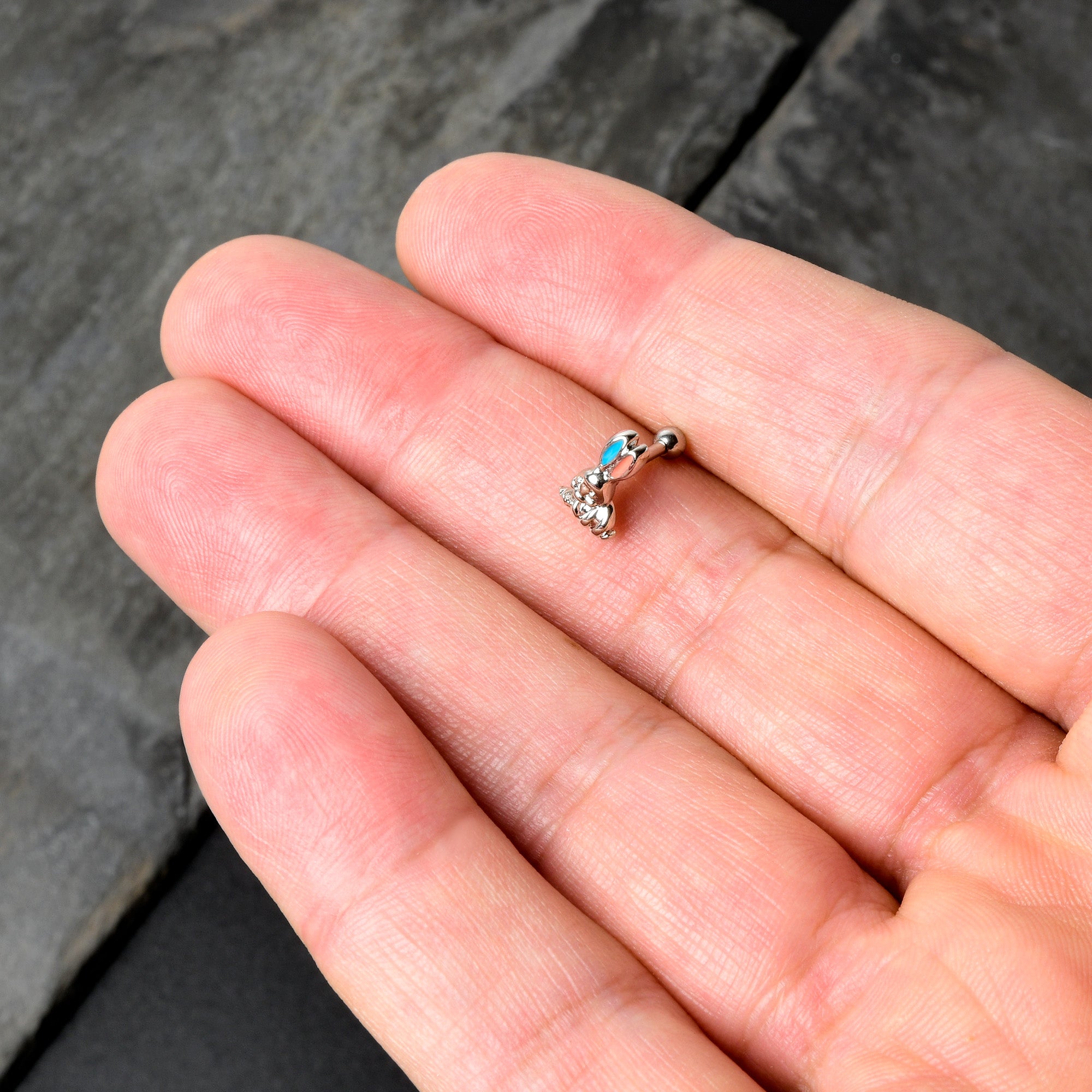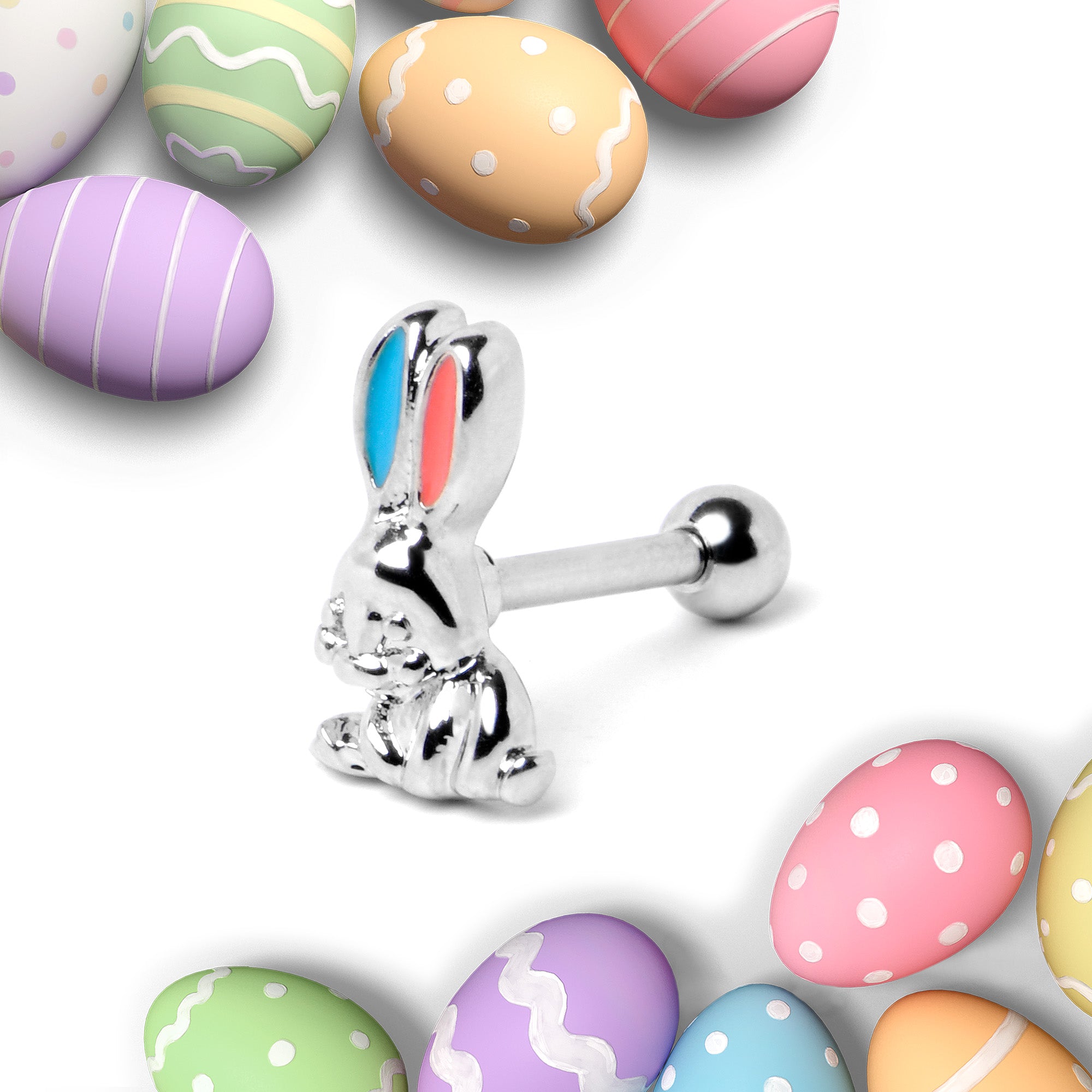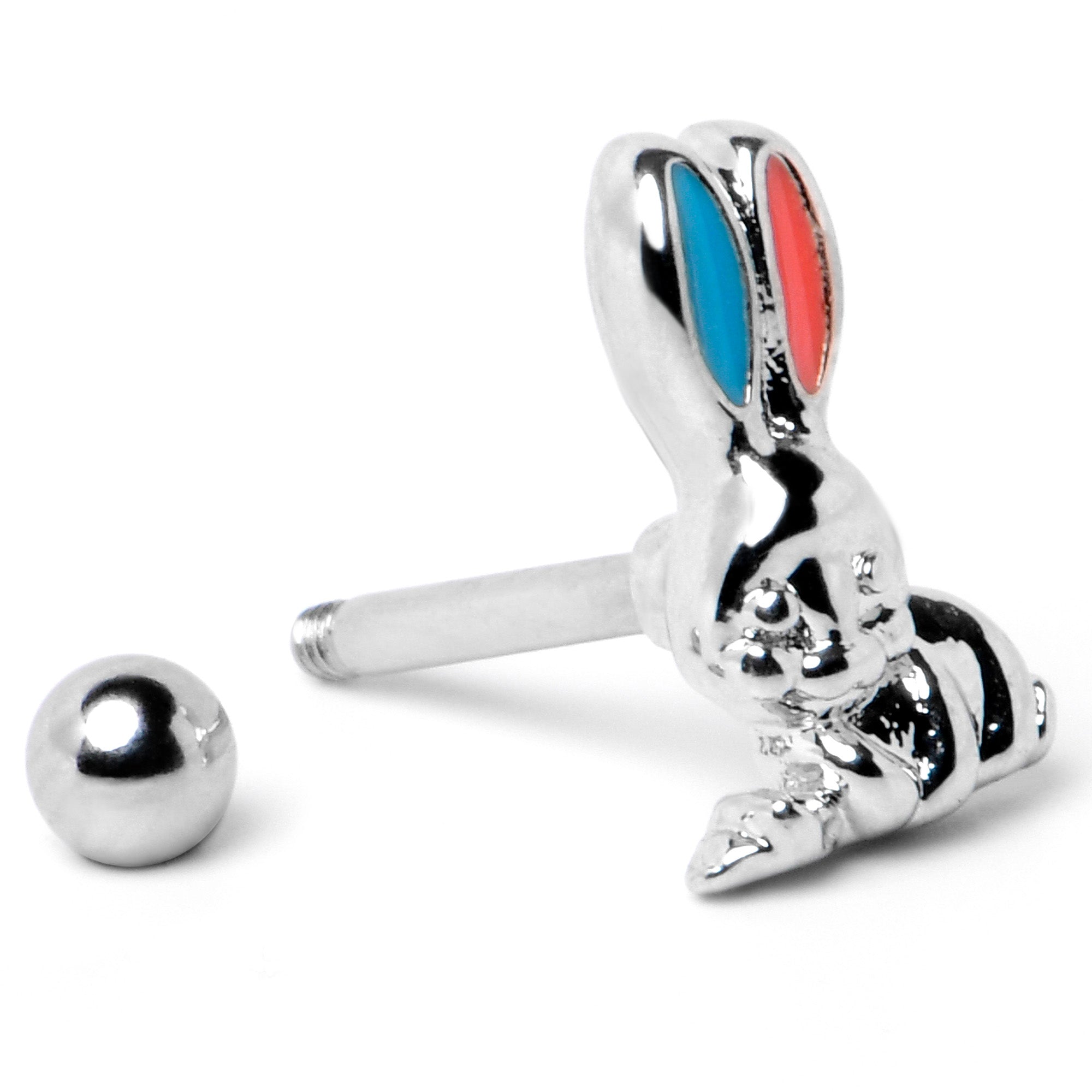 Hop into holiday style with this 16 gauge tragus stud! It's made with an 8mm durable 316L surgical grade stainless steel straight barbell with a 4mm ball end. It features an Easter bunny charm. The bunny is embellished with red inlay in one ear and blue inlay in the other ear, for a festive splash of color you can't ignore. You can even rock this rabbit in multiple piercings including tragus, helix, and some conch piercings. Go down a rabbit hole of color and fashion with this festive Easter cartilage piercing ring.