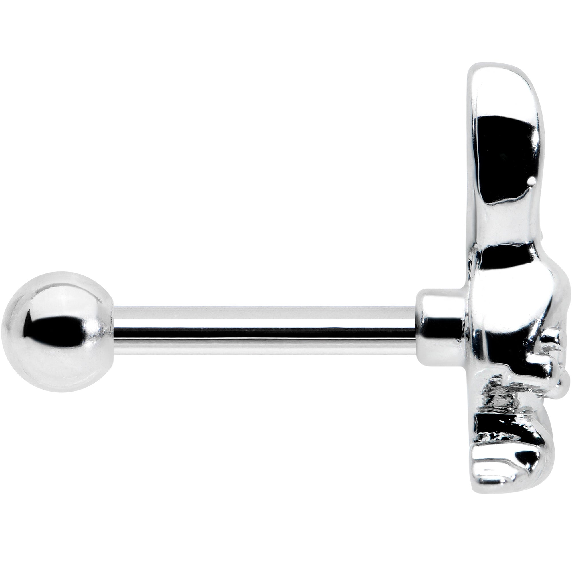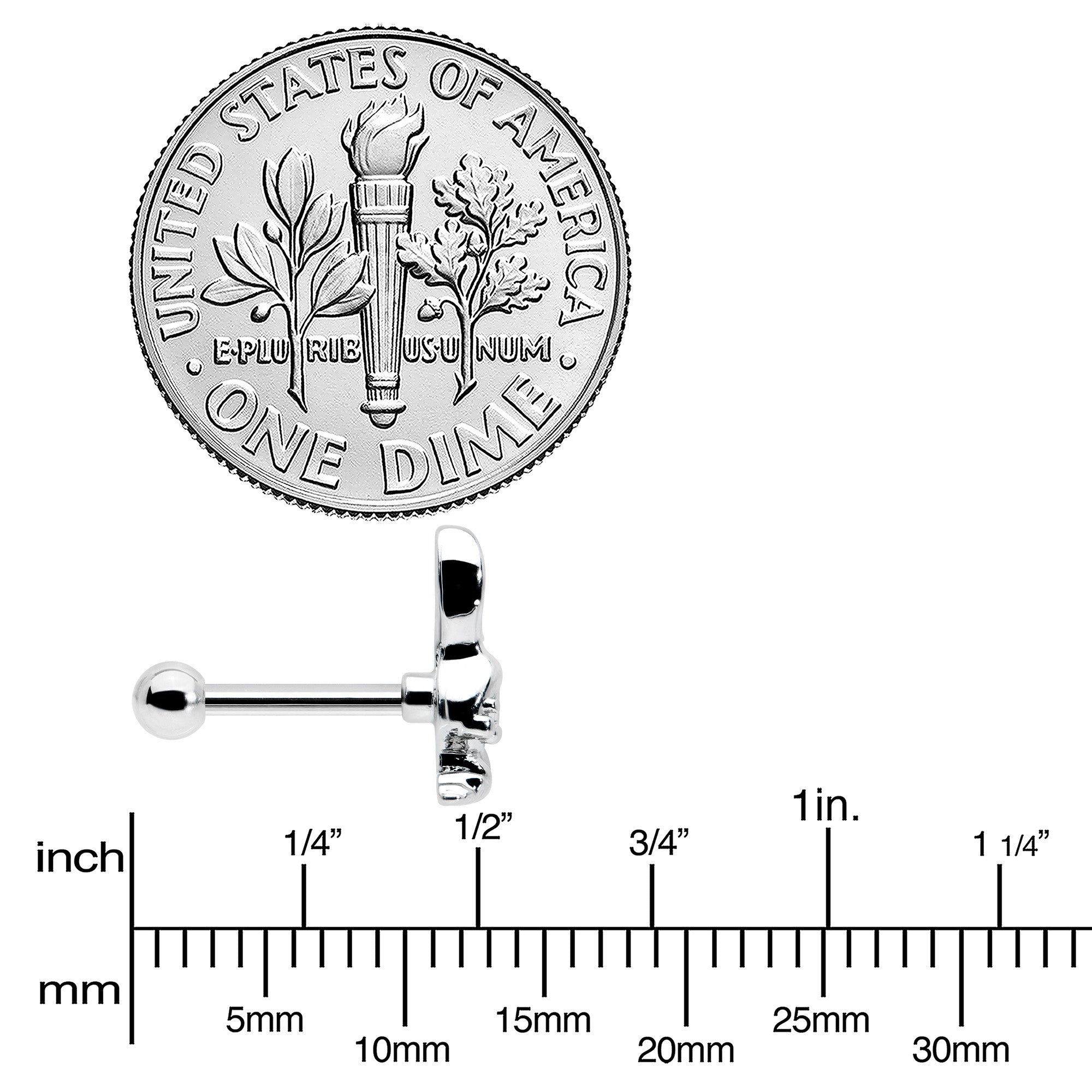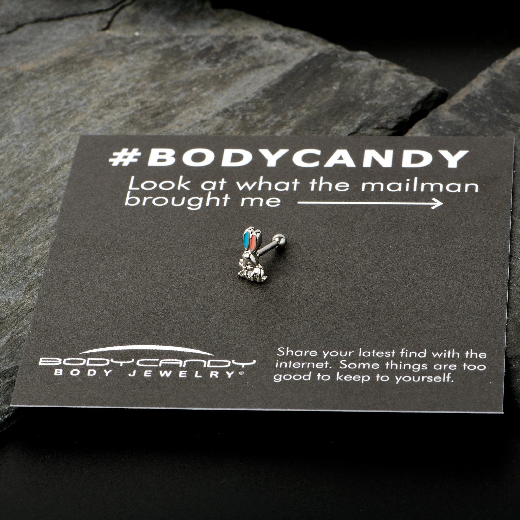 Hop into holiday style with this 16 gauge tragus stud! It's made with an 8mm durable 316L surgical grade stainless steel straight barbell with a 4mm ball end. It features an Easter bunny charm. The bunny is embellished with red inlay in one ear and blue inlay in the other ear, for a festive splash of color you can't ignore. You can even rock this rabbit in multiple piercings including tragus, helix, and some conch piercings. Go down a rabbit hole of color and fashion with this festive Easter cartilage piercing ring.