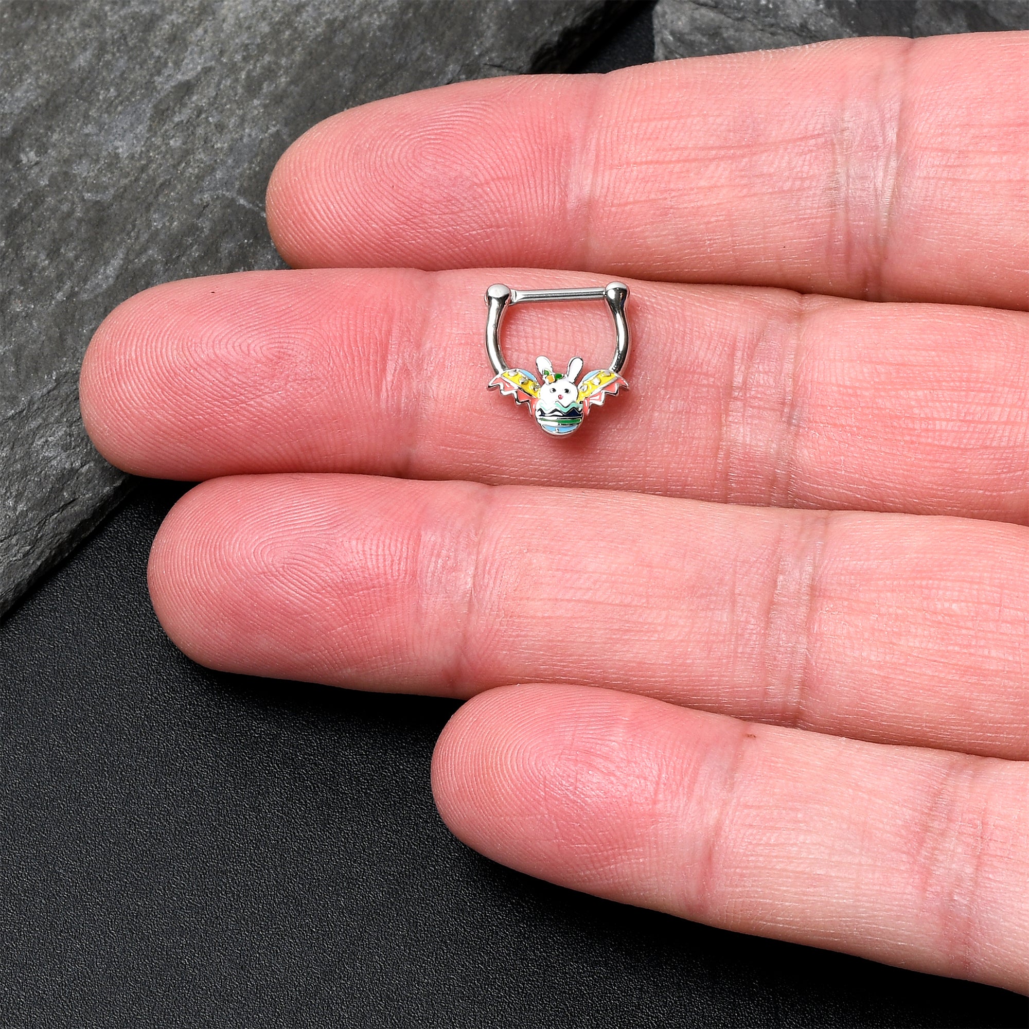 Hatch a new look with this 16 gauge septum ring. It is made with an 8mm 316L surgical grade stainless steel hinged straight barbell. It features a bunny rabbit charm, inlaid in white with simple features. The bunny has a green inlay ornament on one ear and is hatching from a green, blue, and black inlaid Easter egg for a sweetly colorful appearance. The bunny is also flanked between a pair of pink and yellow egg shells and features a hinged, clicker design that makes insertion and removal a snap. You can even rock this rabbit in multiple piercings including tragus, helix, and some conch piercings. You will want to hop to it and snatch up this adorable Easter rabbit cartilage piercing ring.