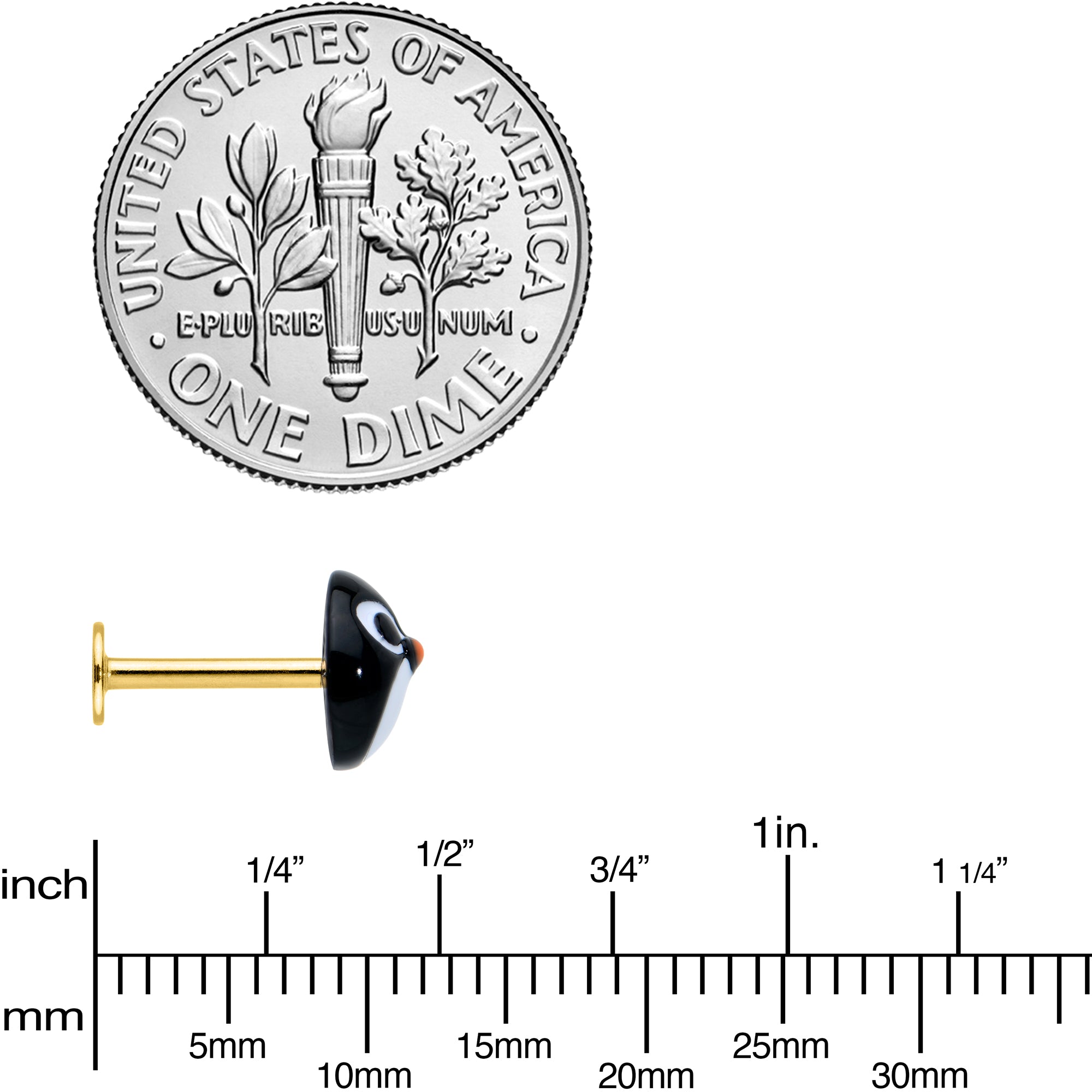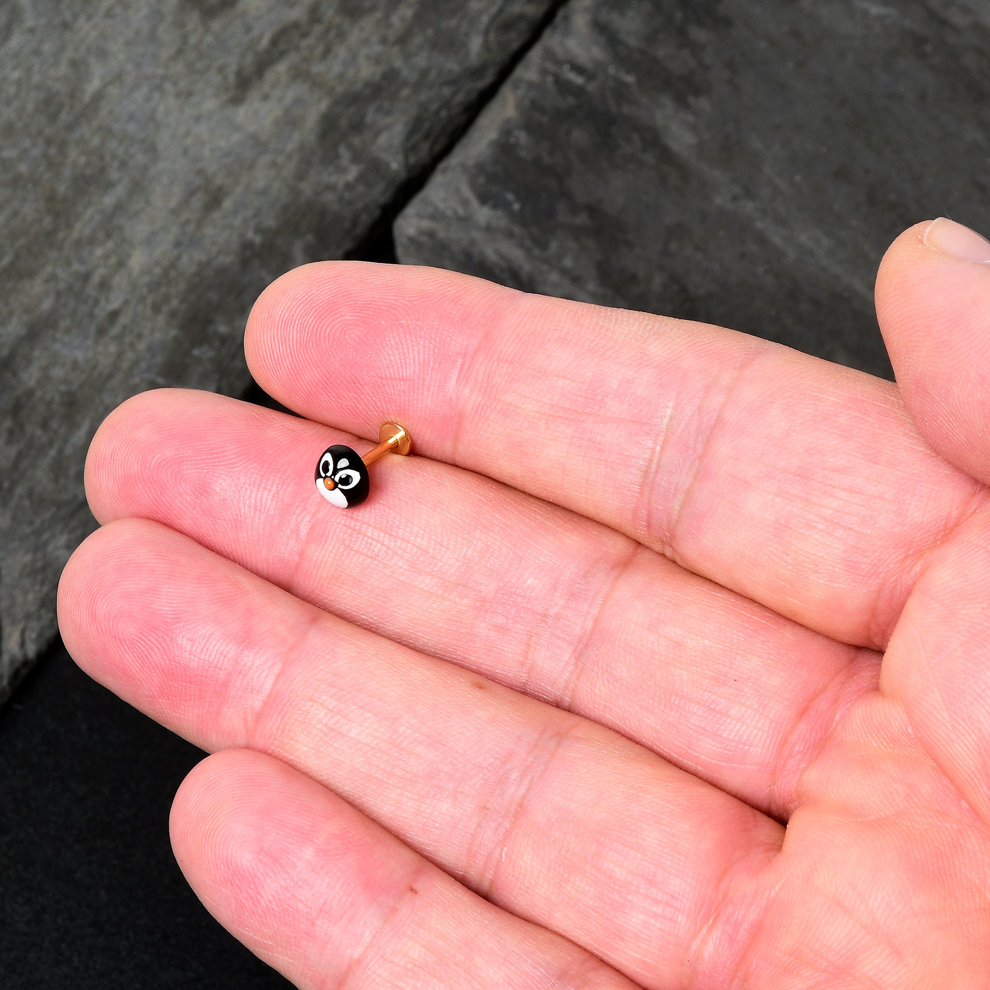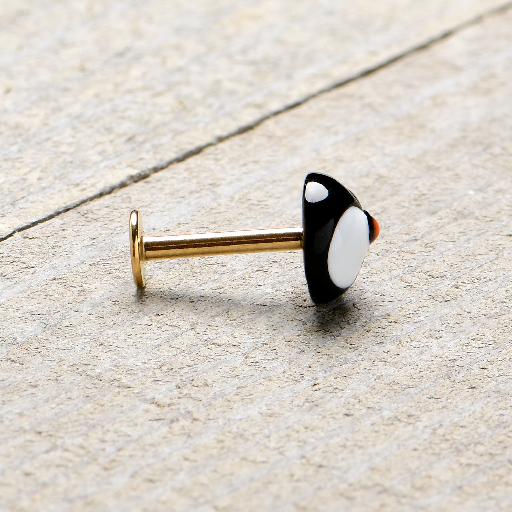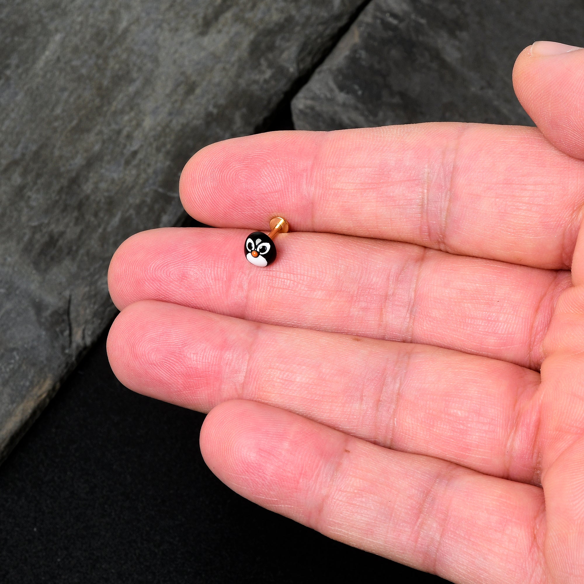 Talk about cute when you're rocking this 16 gauge lip ring! It's made with an 8mm gold tone PVD over 316L surgical grade stainless steel straight post with a flat disc end. It features a round penguin charm. The penguin features its face in simple, geometrically styled detailing, with wide eyes and a bright orange beak. You can even rock it in multiple piercings including lip, monroe, tragus, helix, and some conch piercings. You'll be ready to march into the winter holidays in sweet style with this awesome, avian cartilage piercing jewelry!